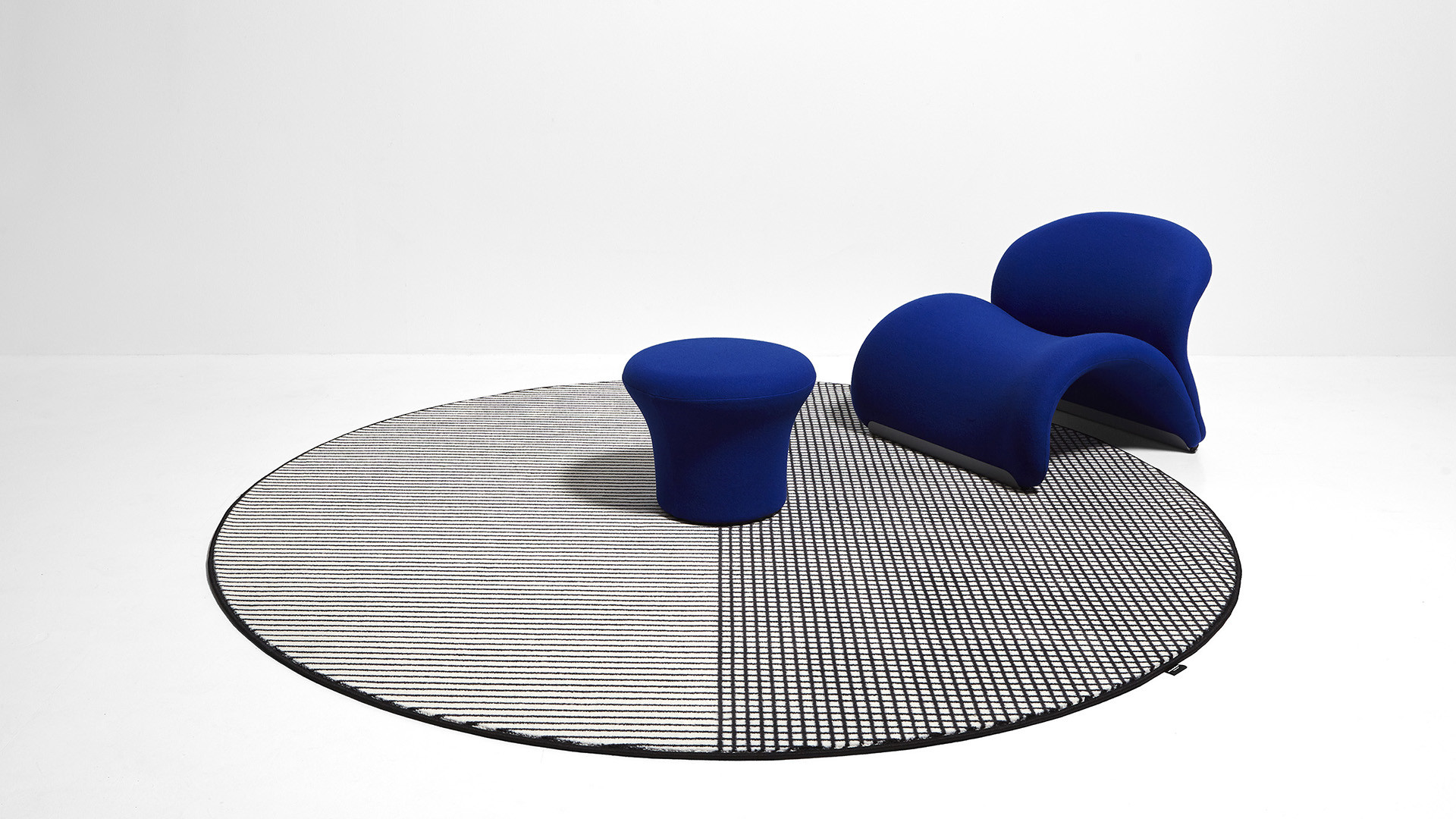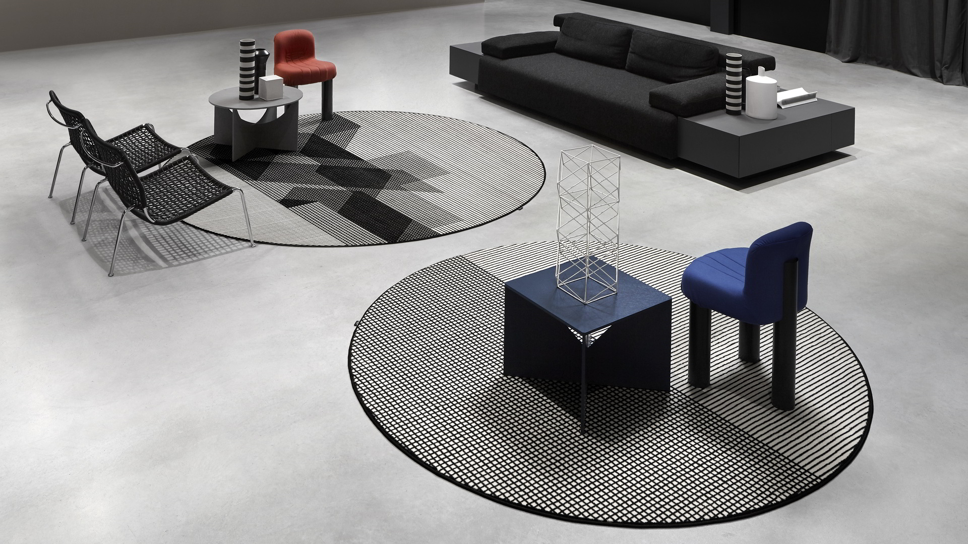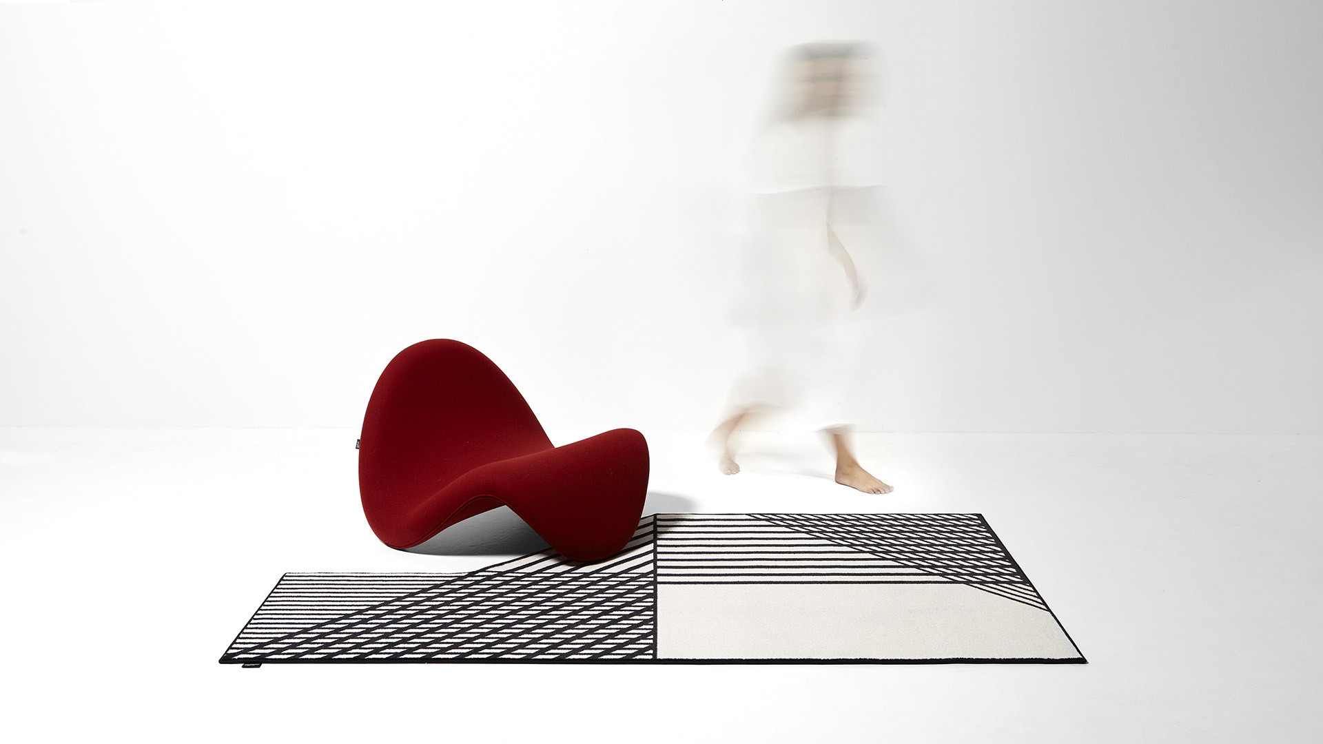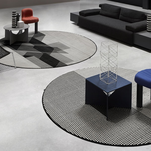 Unlike wallpaper that is an 'open' element, the carpet is a defined object, contained within a border of 1 or 5 centimeters that delimits the graphics restricting a defined space. The pure geometric figures of the rectangle, square and circle come together with unconventional and irregular shapes, in which the design of the decoration is enhanced by the same shape as the carpet. The TRAMATO carpet collection is made up of 16 references: all the carpets offered are made with printed velvet by means of the TUFTING technique.