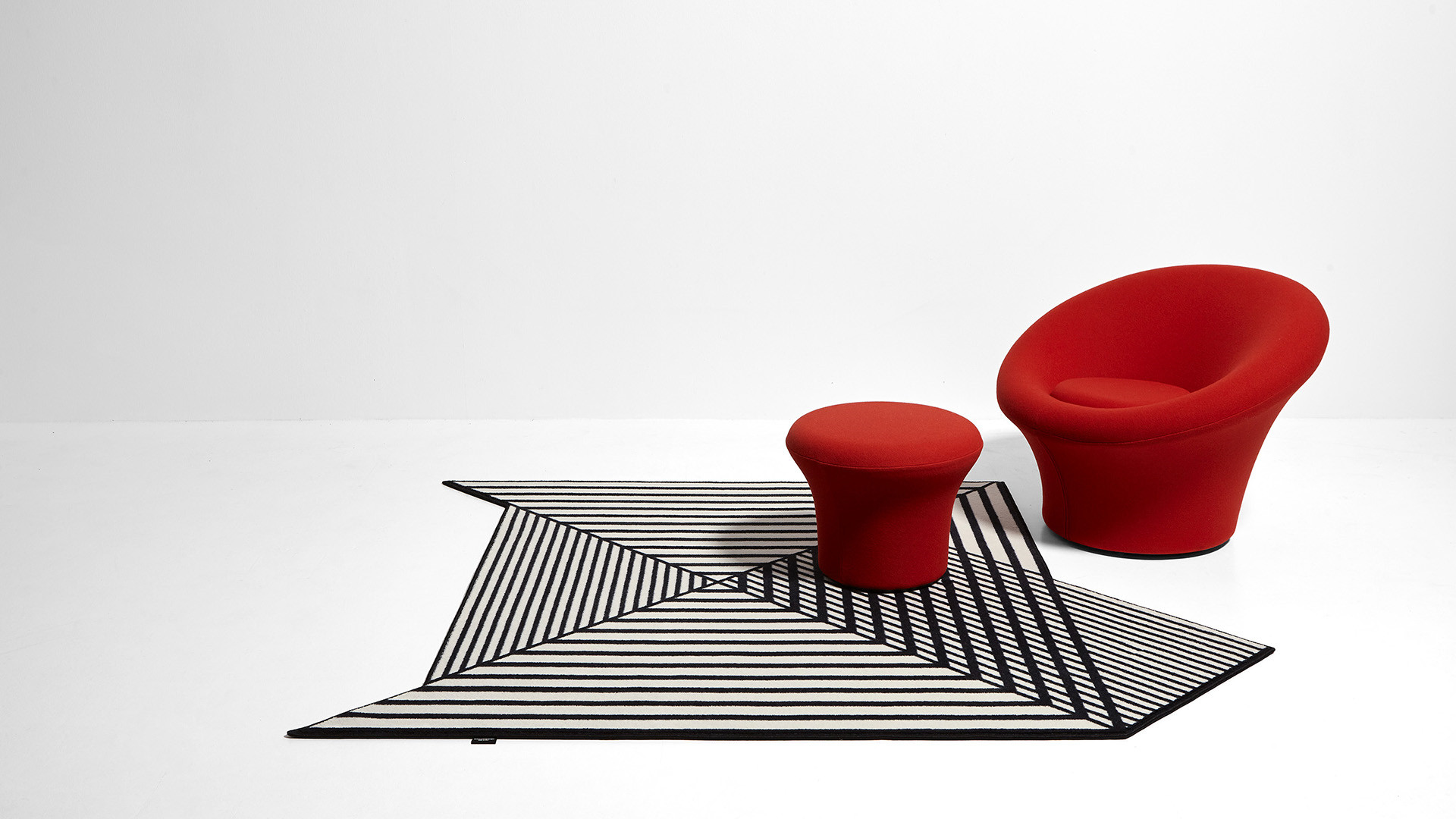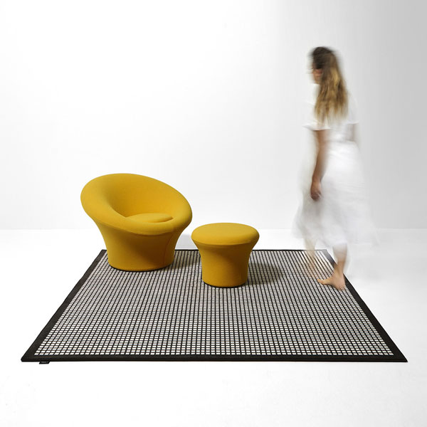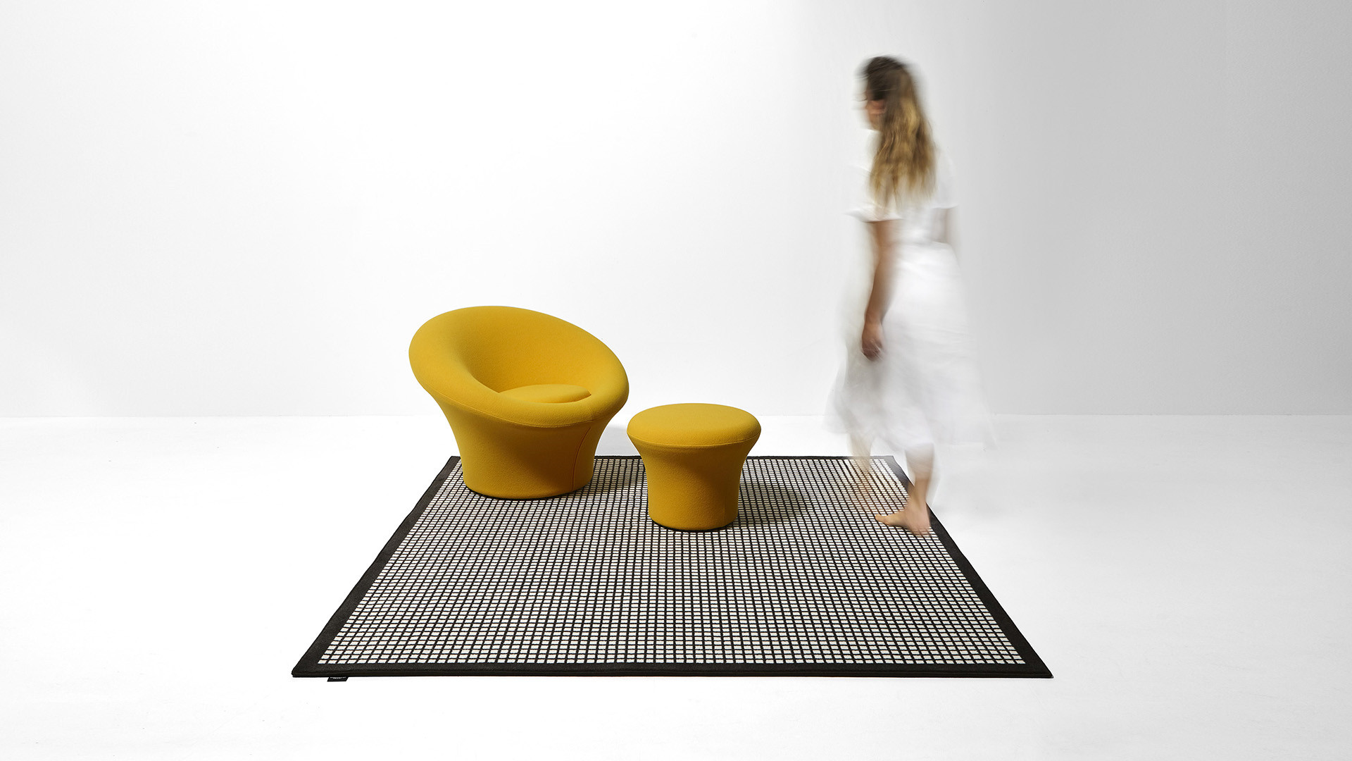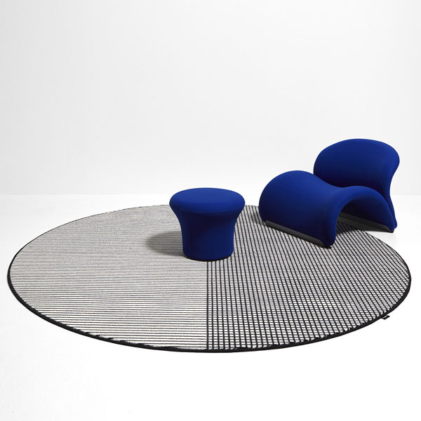 Unlike wallpaper that is an 'open' element, the carpet is a defined object, contained within a border of 1 or 5 centimeters that delimits the graphics restricting a defined space. The pure geometric figures of the rectangle, square and circle come together with unconventional and irregular shapes, in which the design of the decoration is enhanced by the same shape as the carpet. The TRAMATO carpet collection is made up of 16 references: all the carpets offered are made with printed velvet by means of the TUFTING technique.