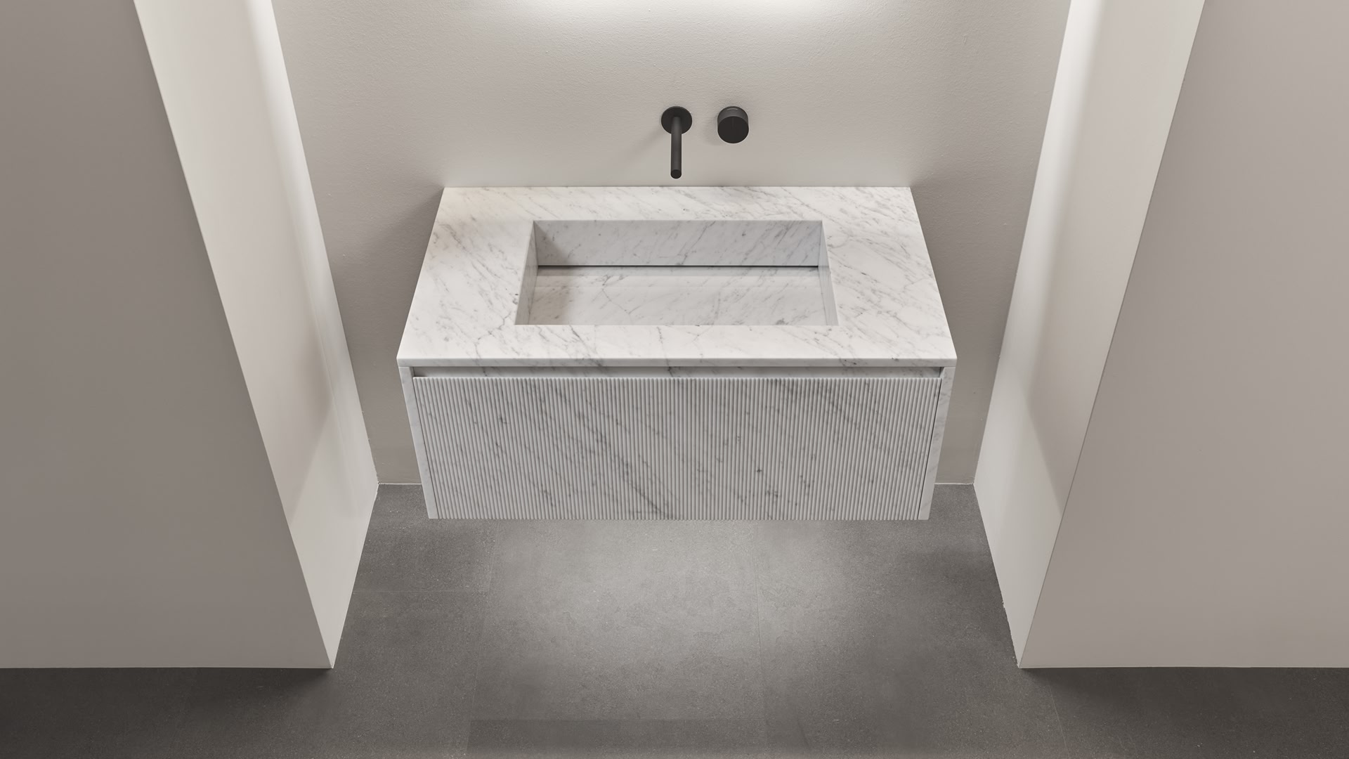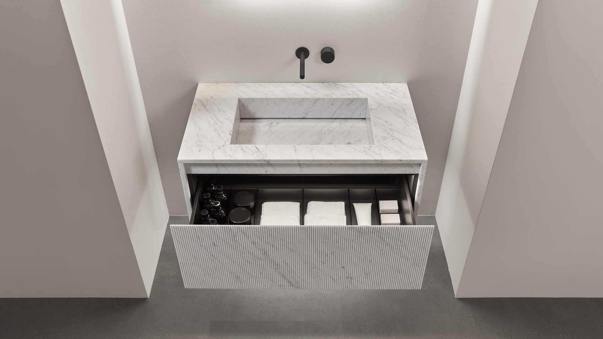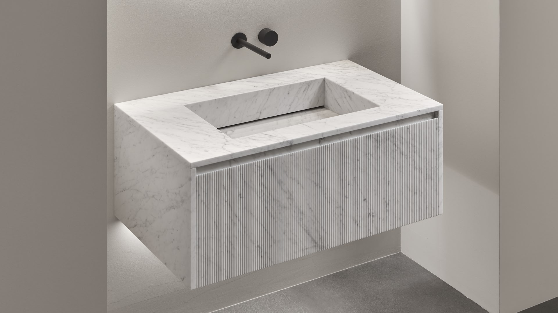 The exclusive “normality” of the collection now becomes extraordinary thanks to the excellence of the stone material, the variations of marble, the nuances that add value and authenticity to the design. The constructive simplicity is enriched by the processing of the material, the total look re-proposes the idea of the unit block, of a solid, timeless design, capable of overcoming fashions and bringing memory into the contemporary.