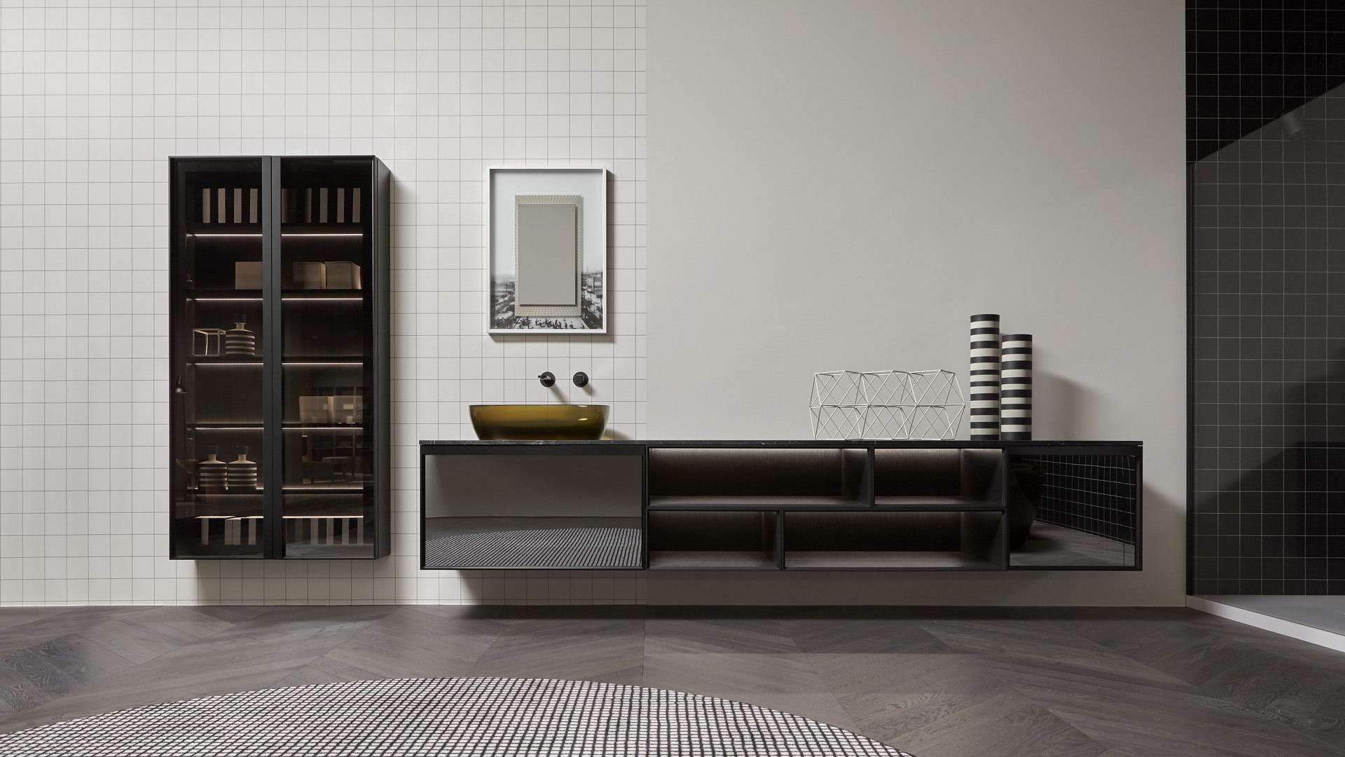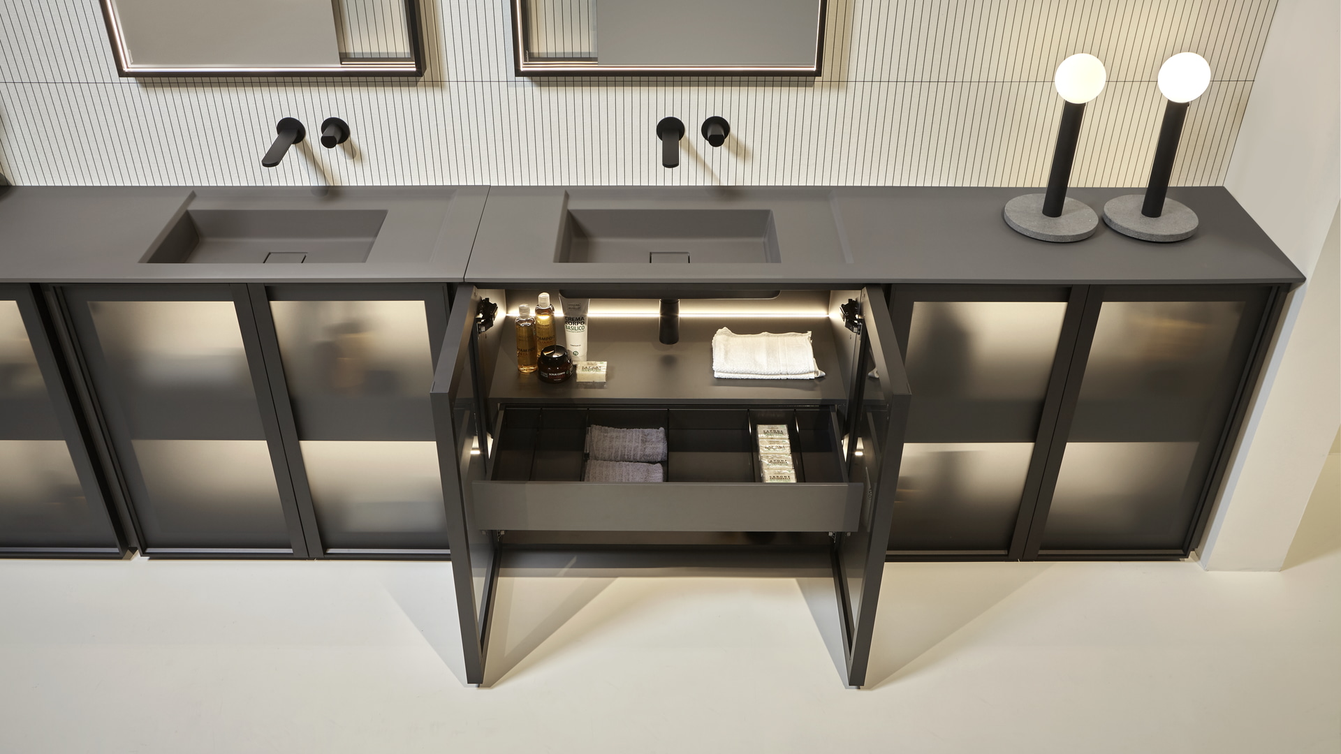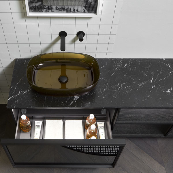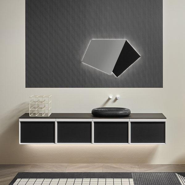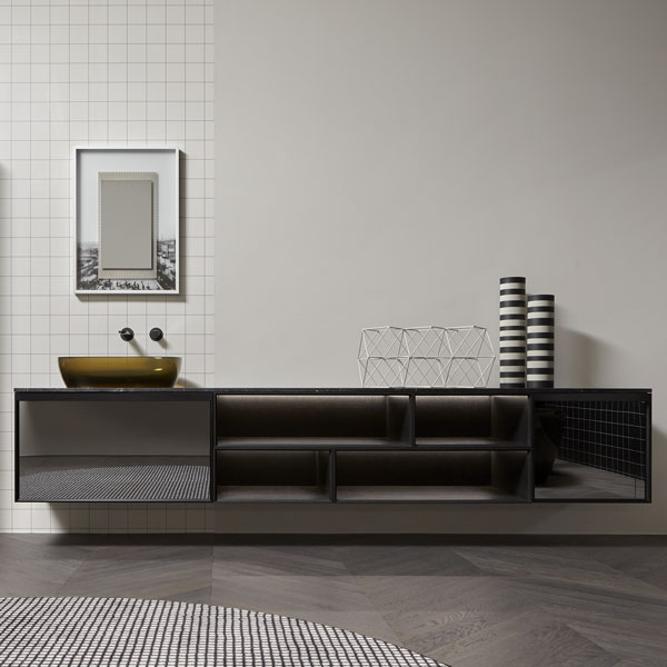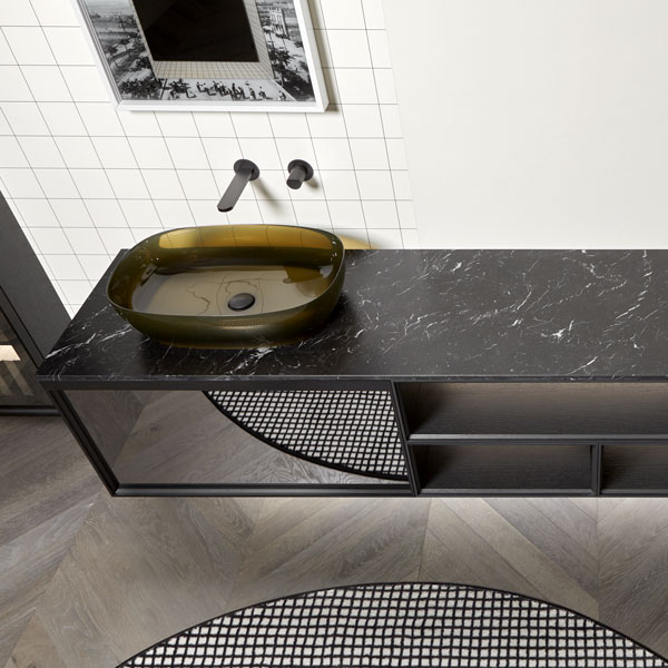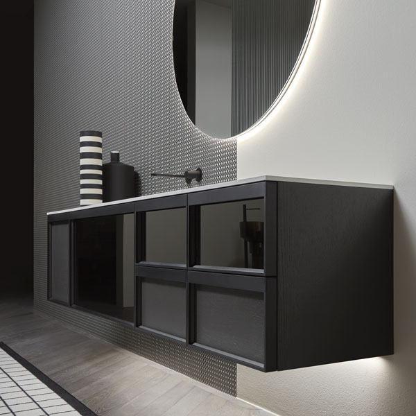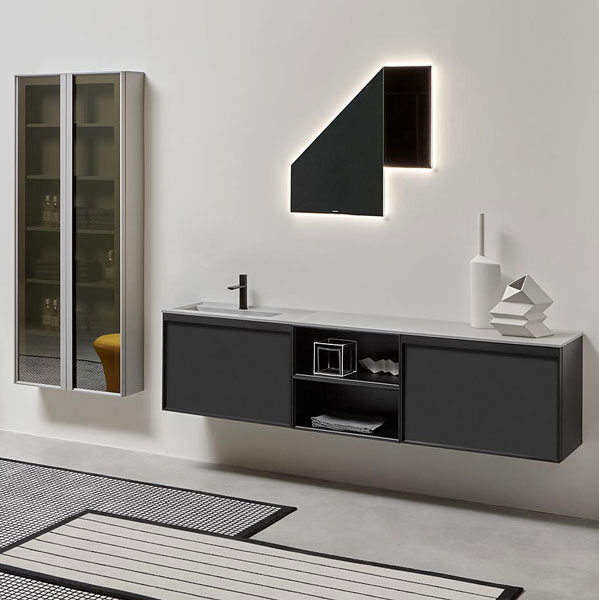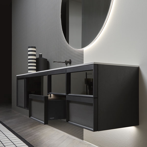 Open wall cabinets in Skin cenere finish. Mirror art. Tratteggio, Indigo tap series in graphite finish, art. Senso sink in Cristalmood Nebbia.
