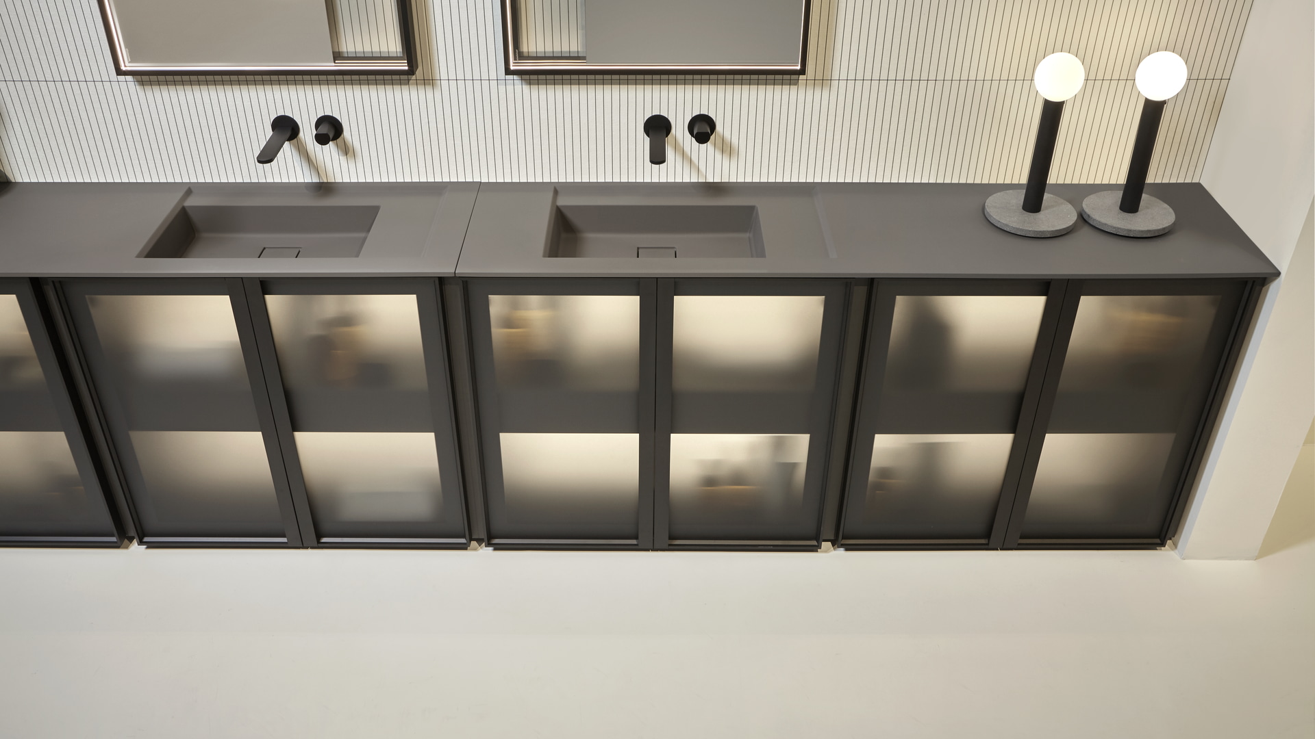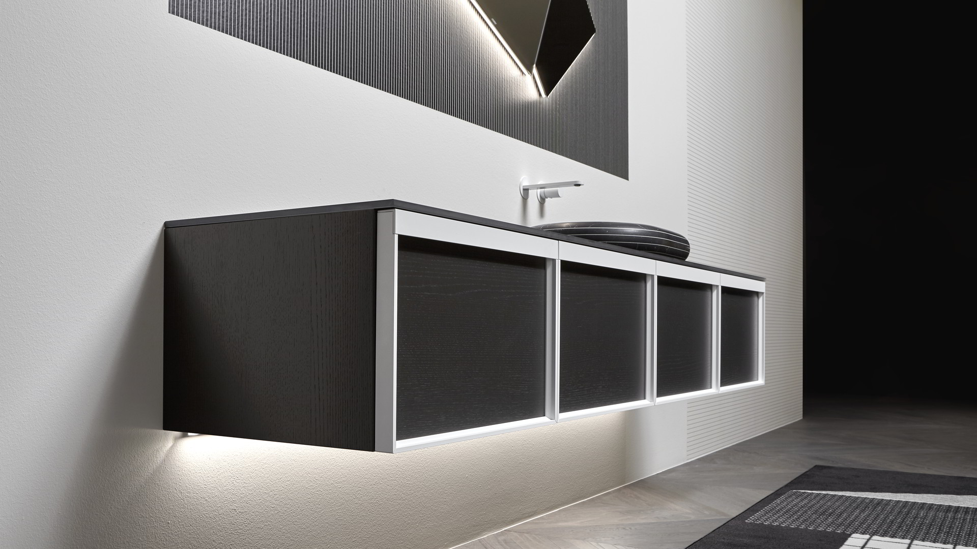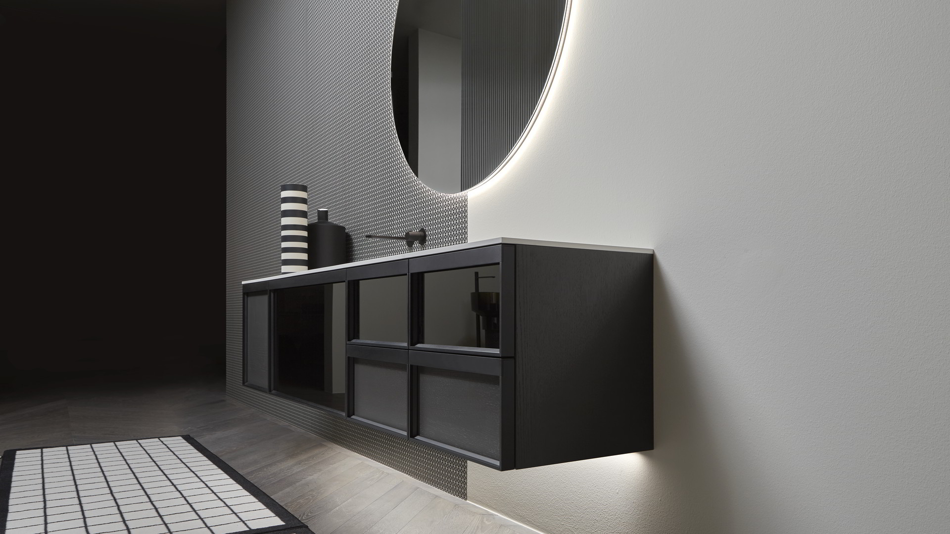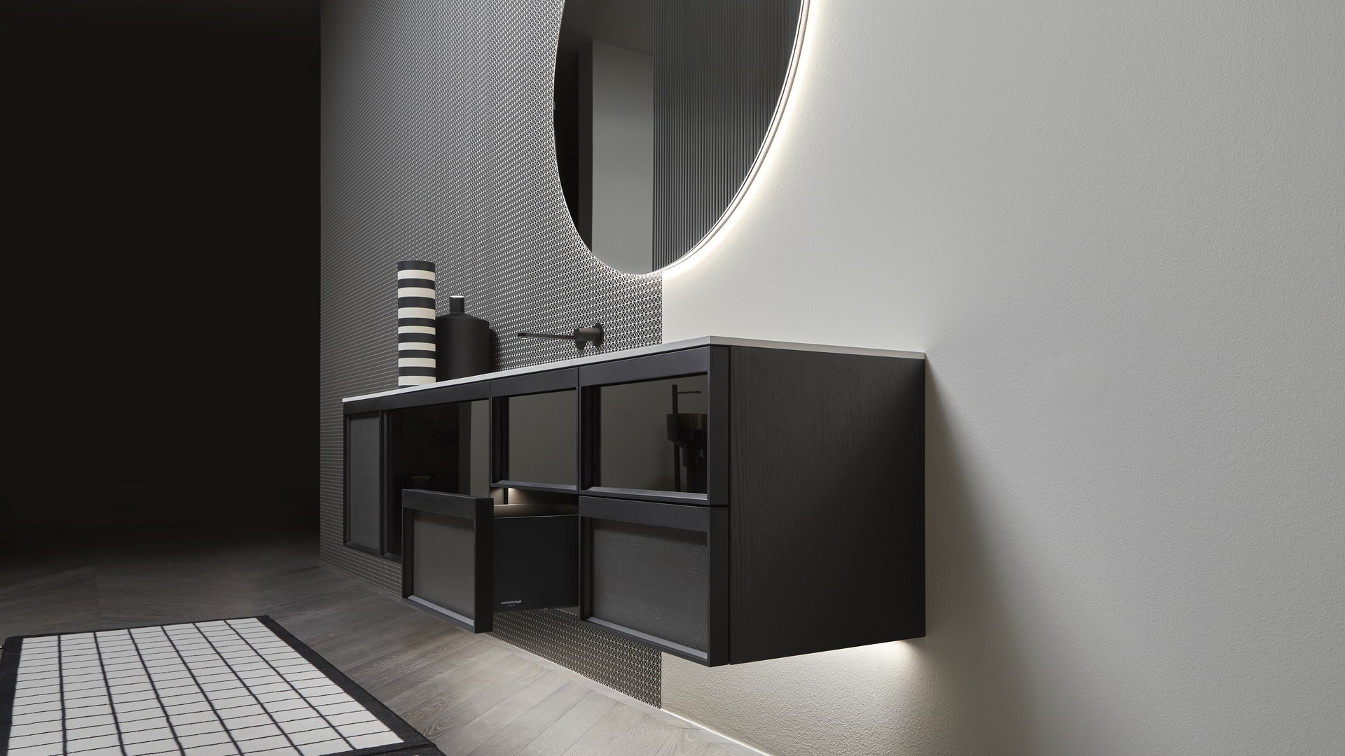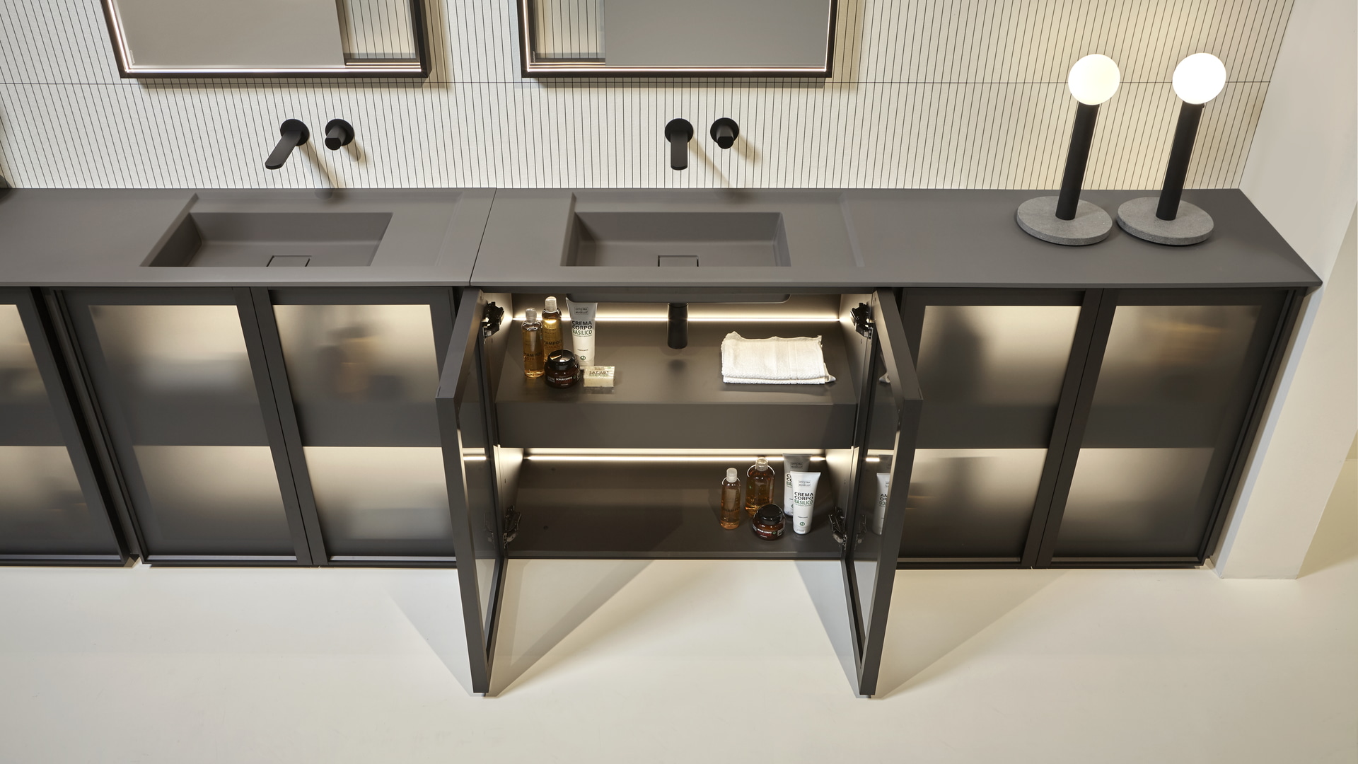 Open wall cabinets in Skin cenere finish. Mirror art. Tratteggio, Indigo tap series in graphite finish, art. Senso sink in Cristalmood Nebbia.