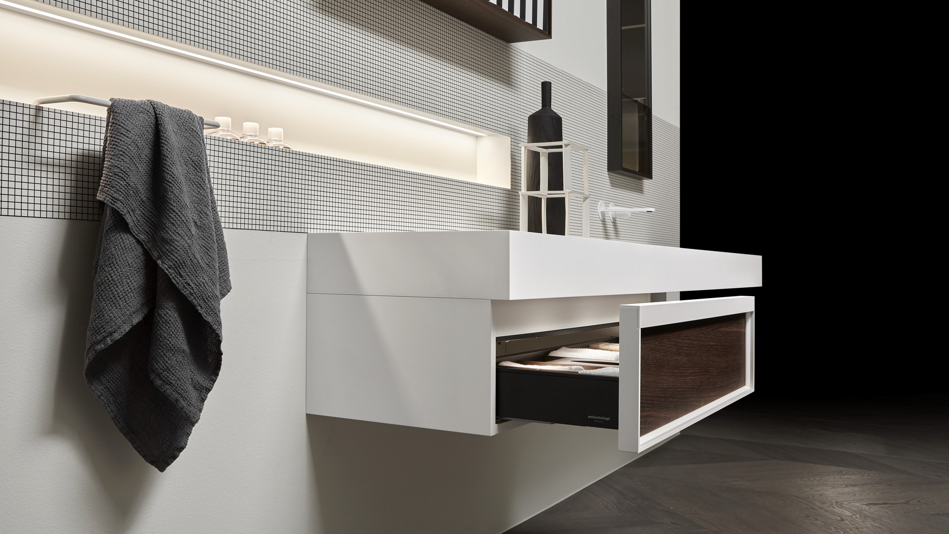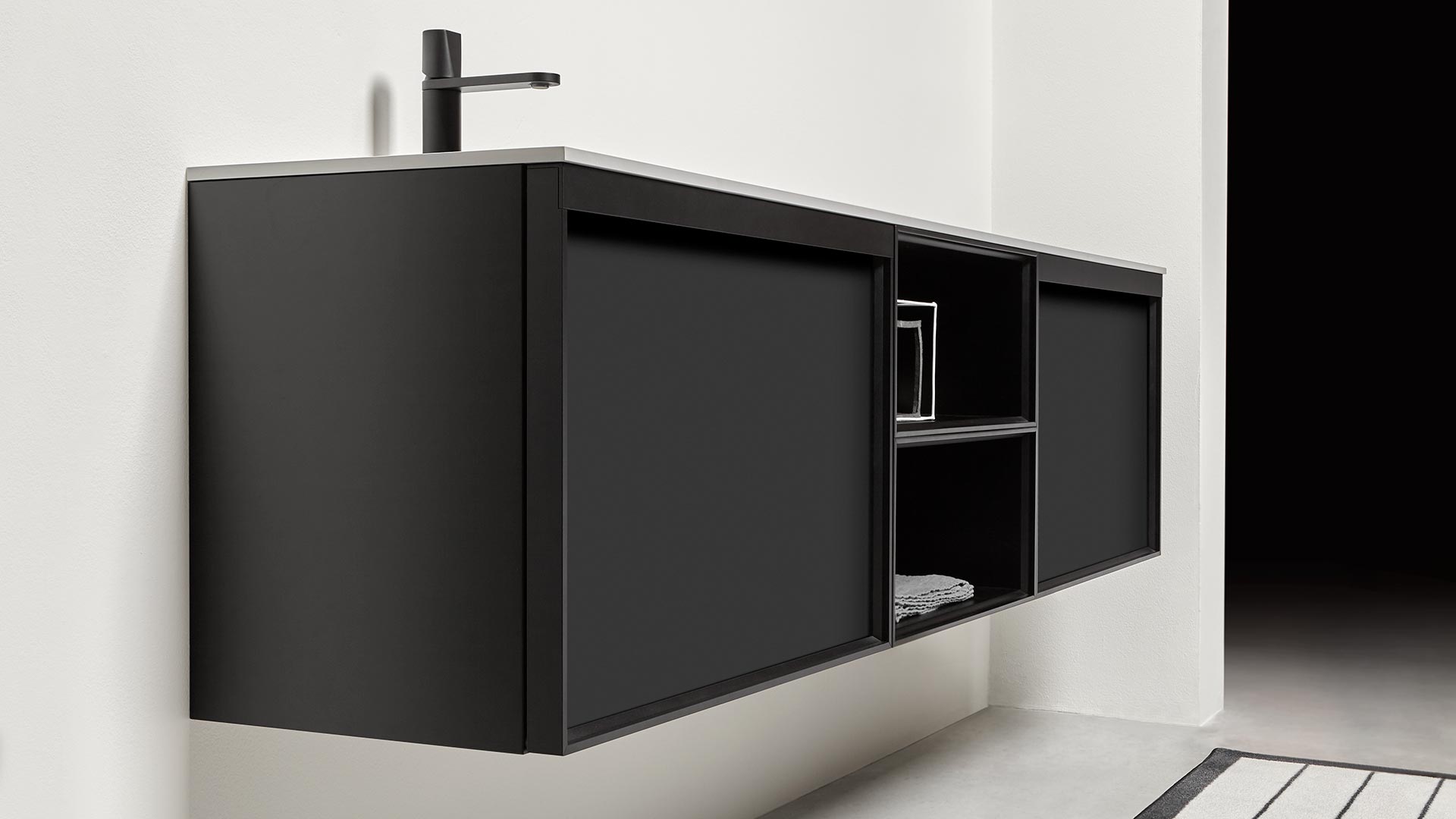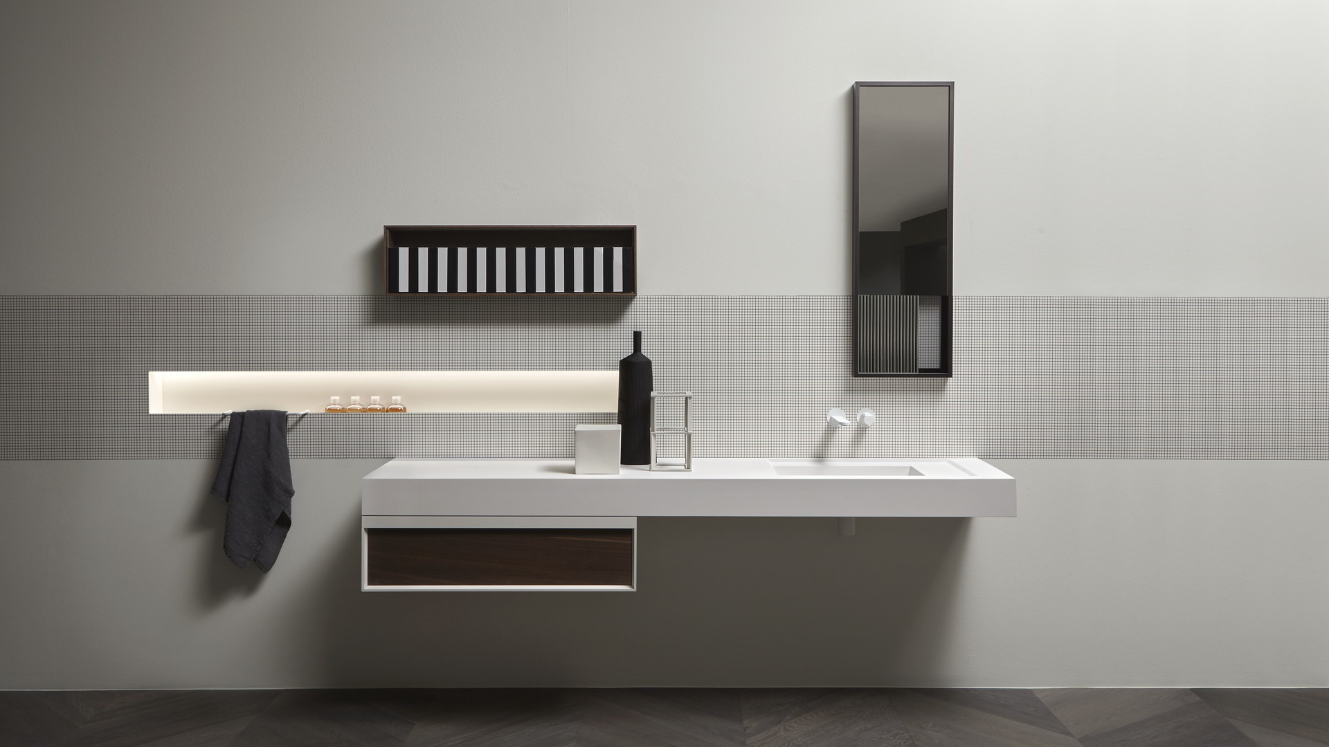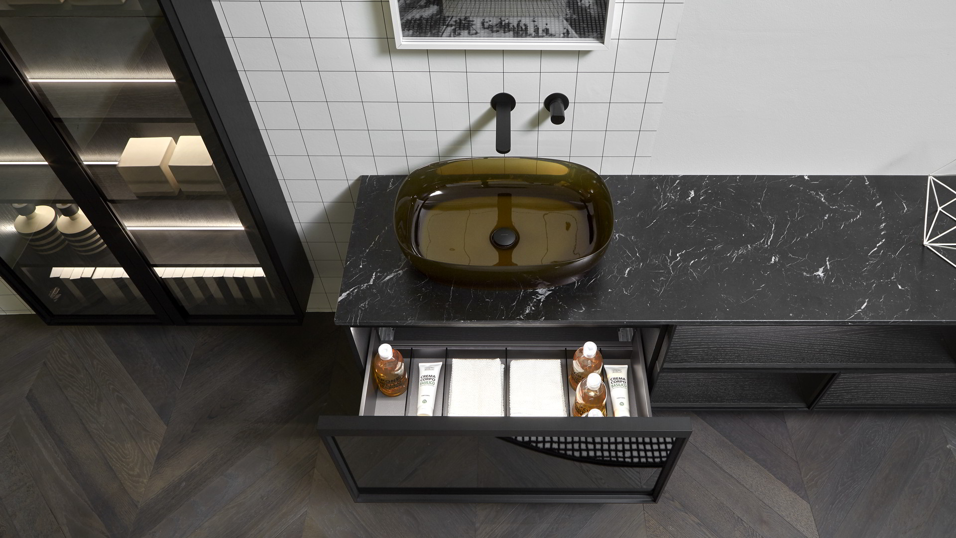Open wall cabinets in Skin cenere finish. Mirror art. Tratteggio, Indigo tap series in graphite finish, art. Senso sink in Cristalmood Nebbia.