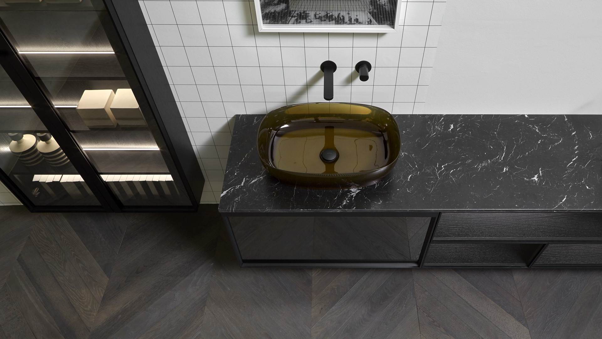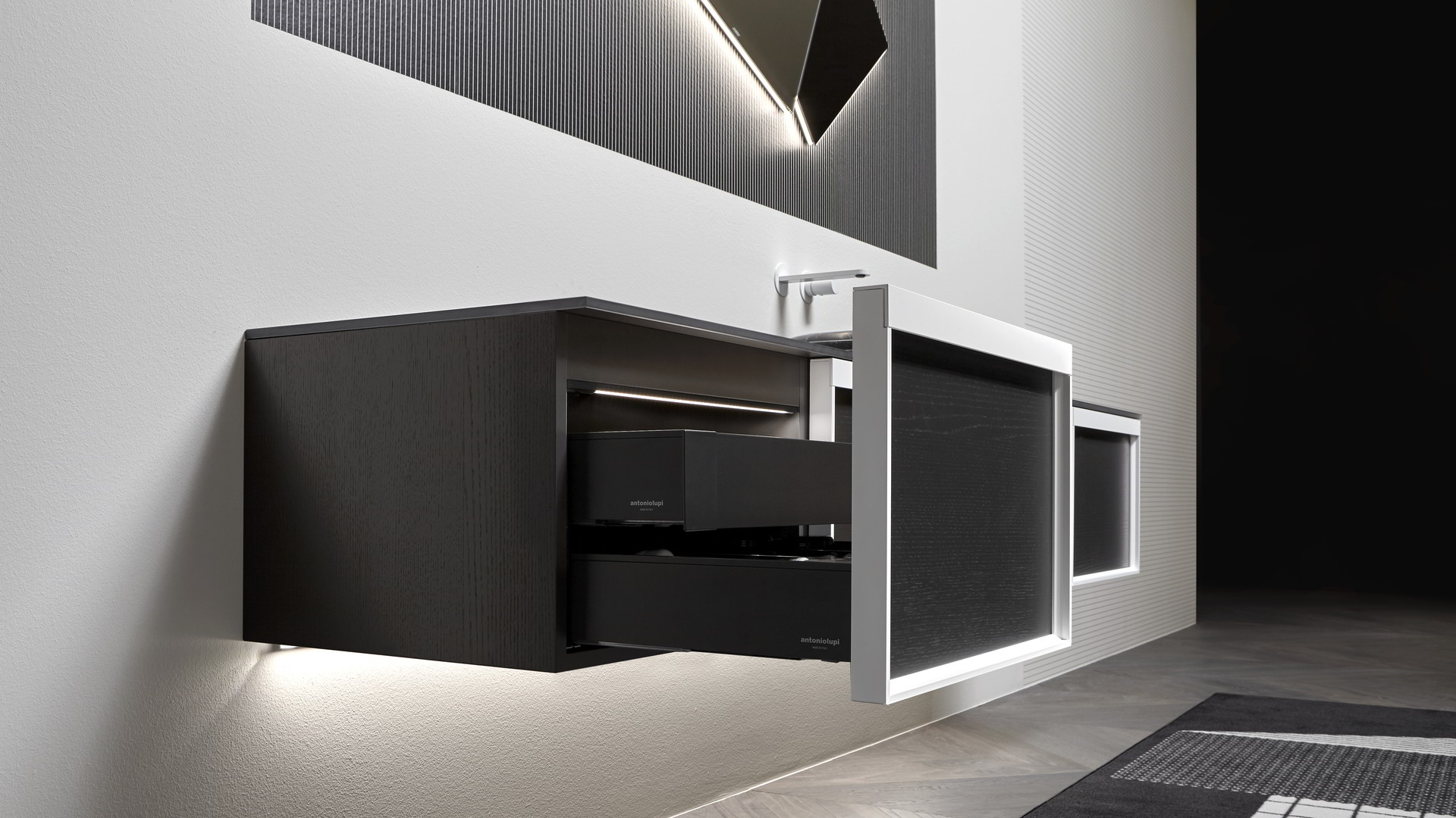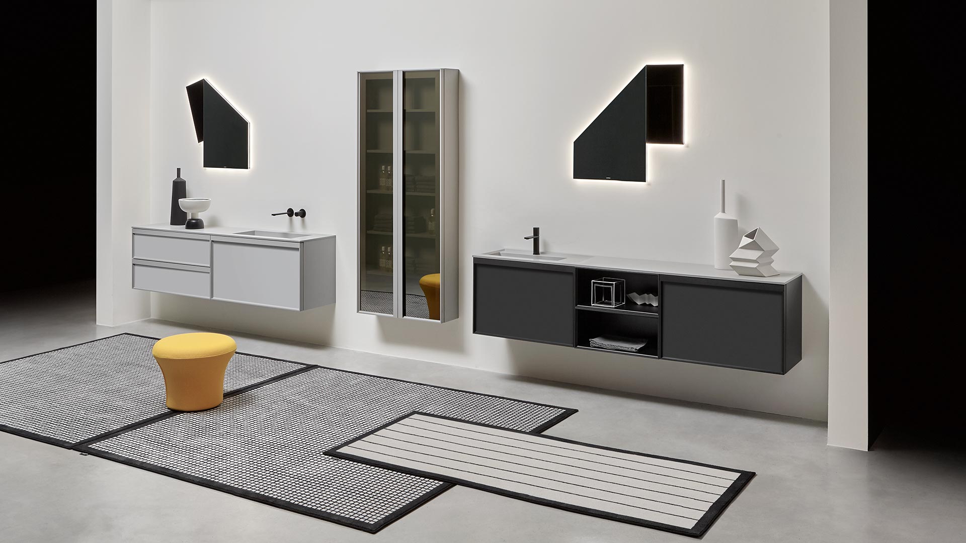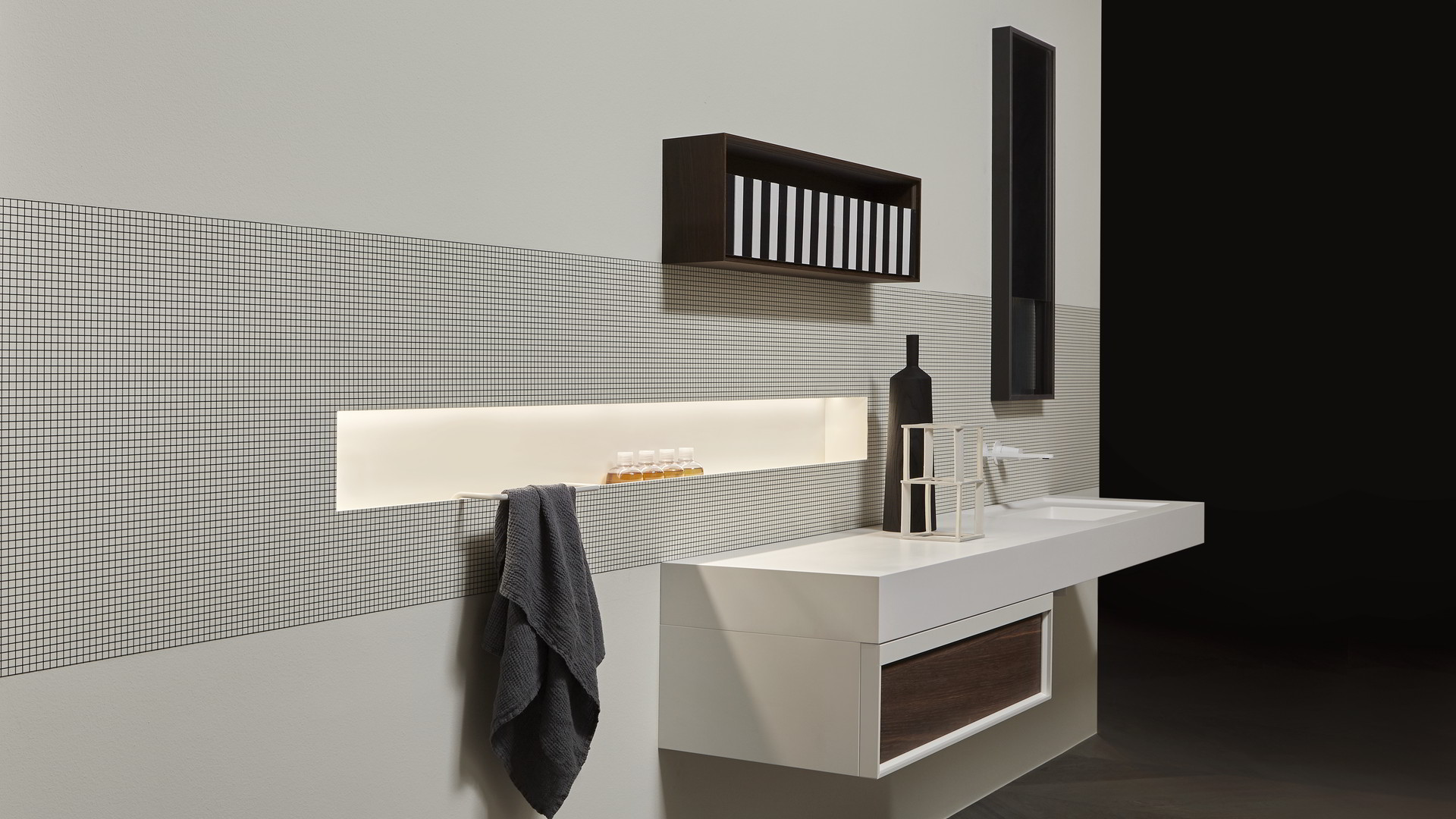 Open wall cabinets in Skin cenere finish. Mirror art. Tratteggio, Indigo tap series in graphite finish, art. Senso sink in Cristalmood Nebbia.
