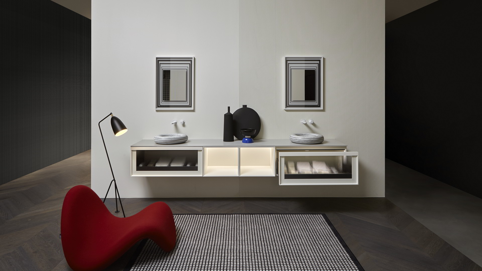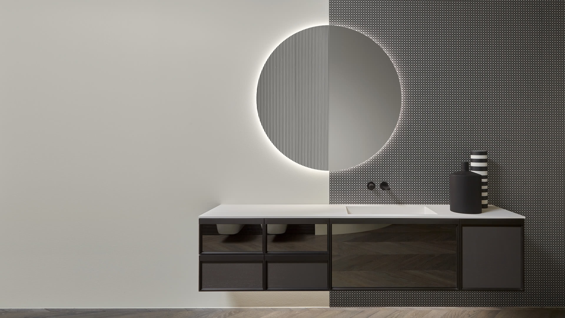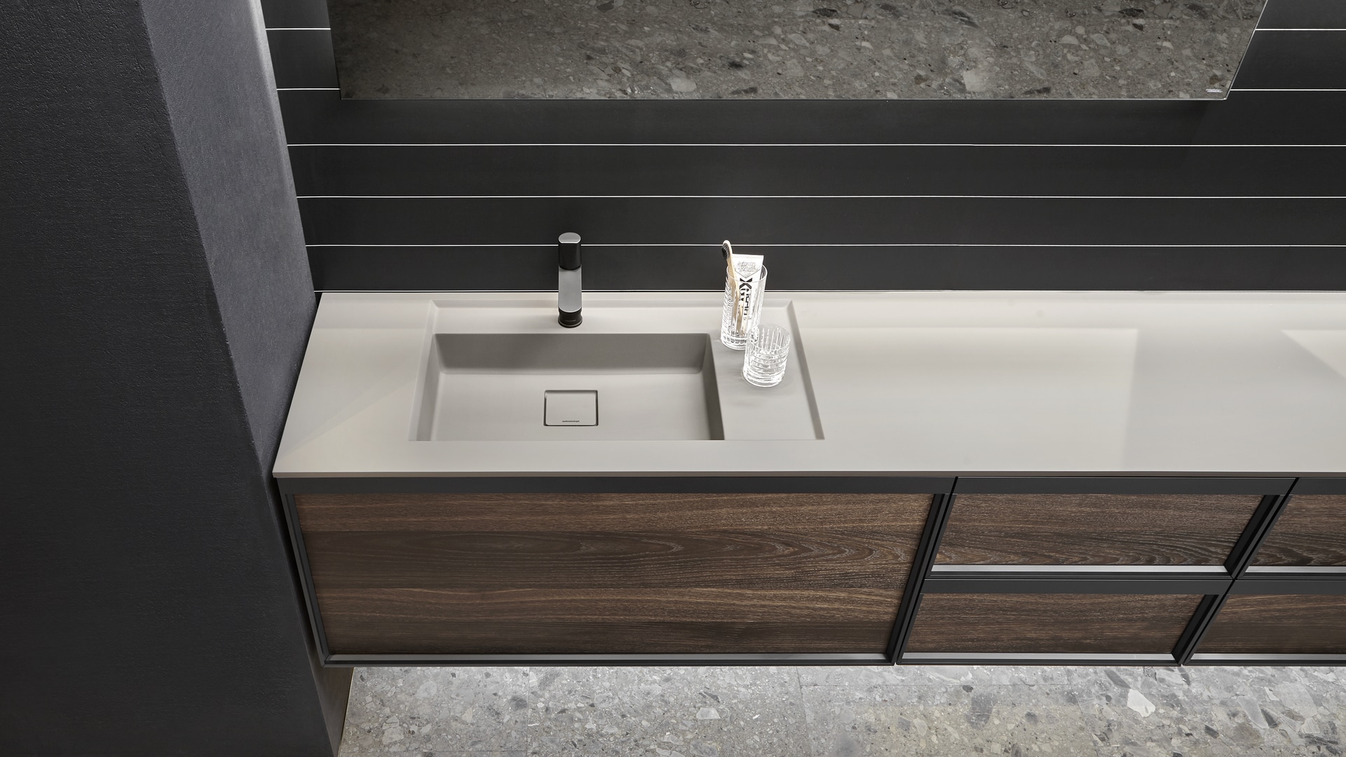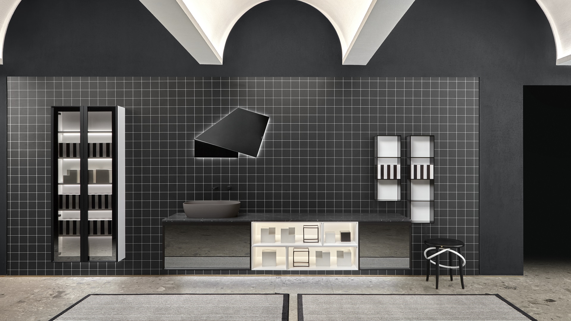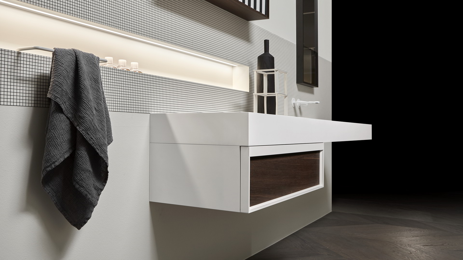 Open wall cabinets in Skin cenere finish. Mirror art. Tratteggio, Indigo tap series in graphite finish, art. Senso sink in Cristalmood Nebbia.
