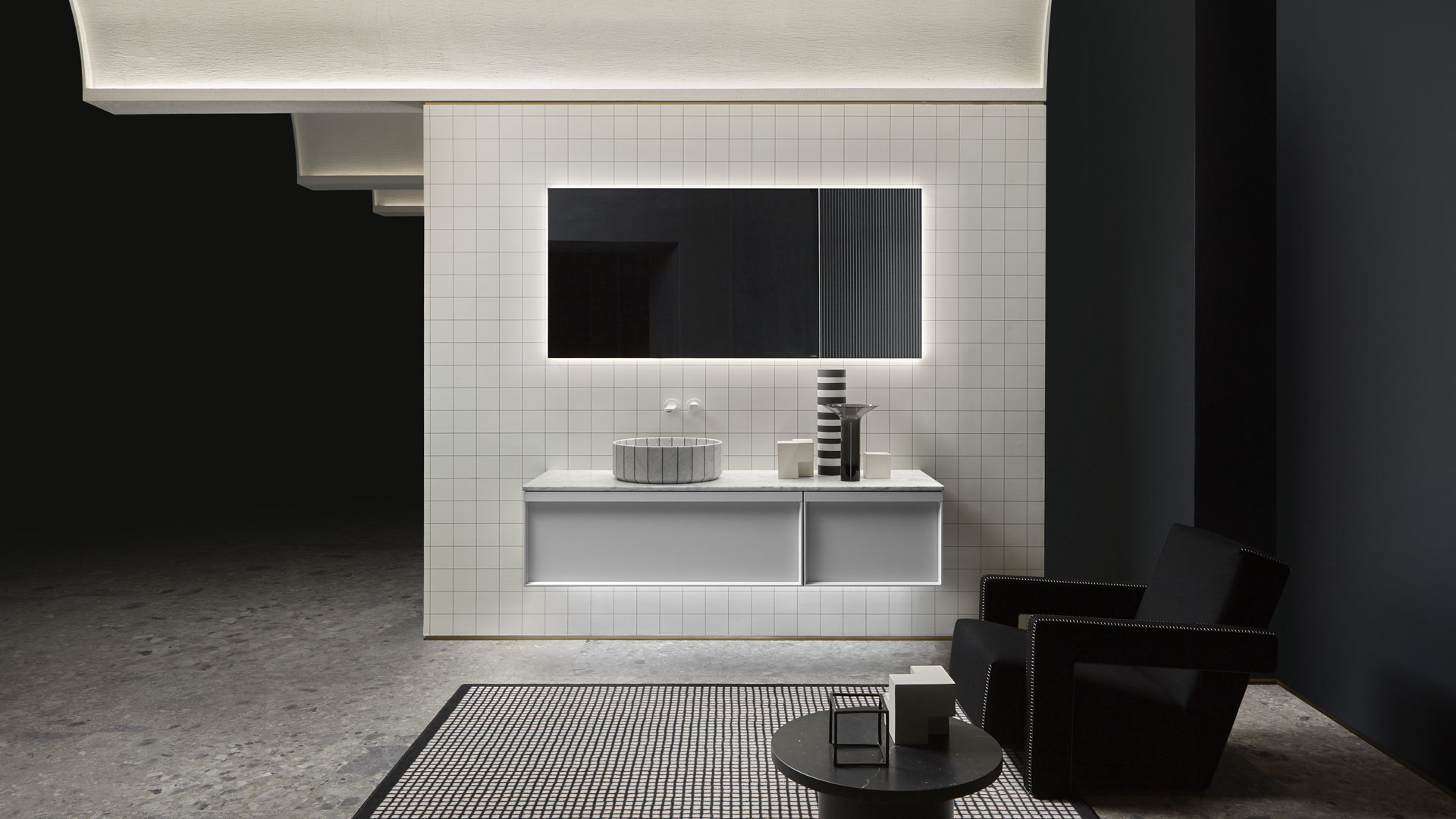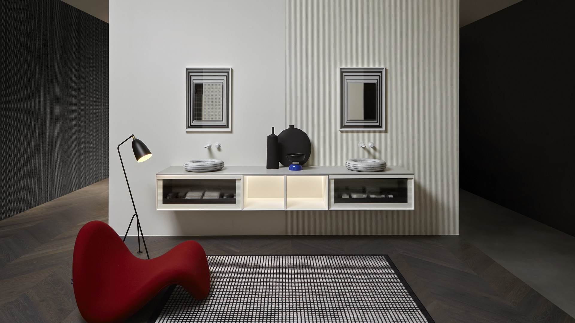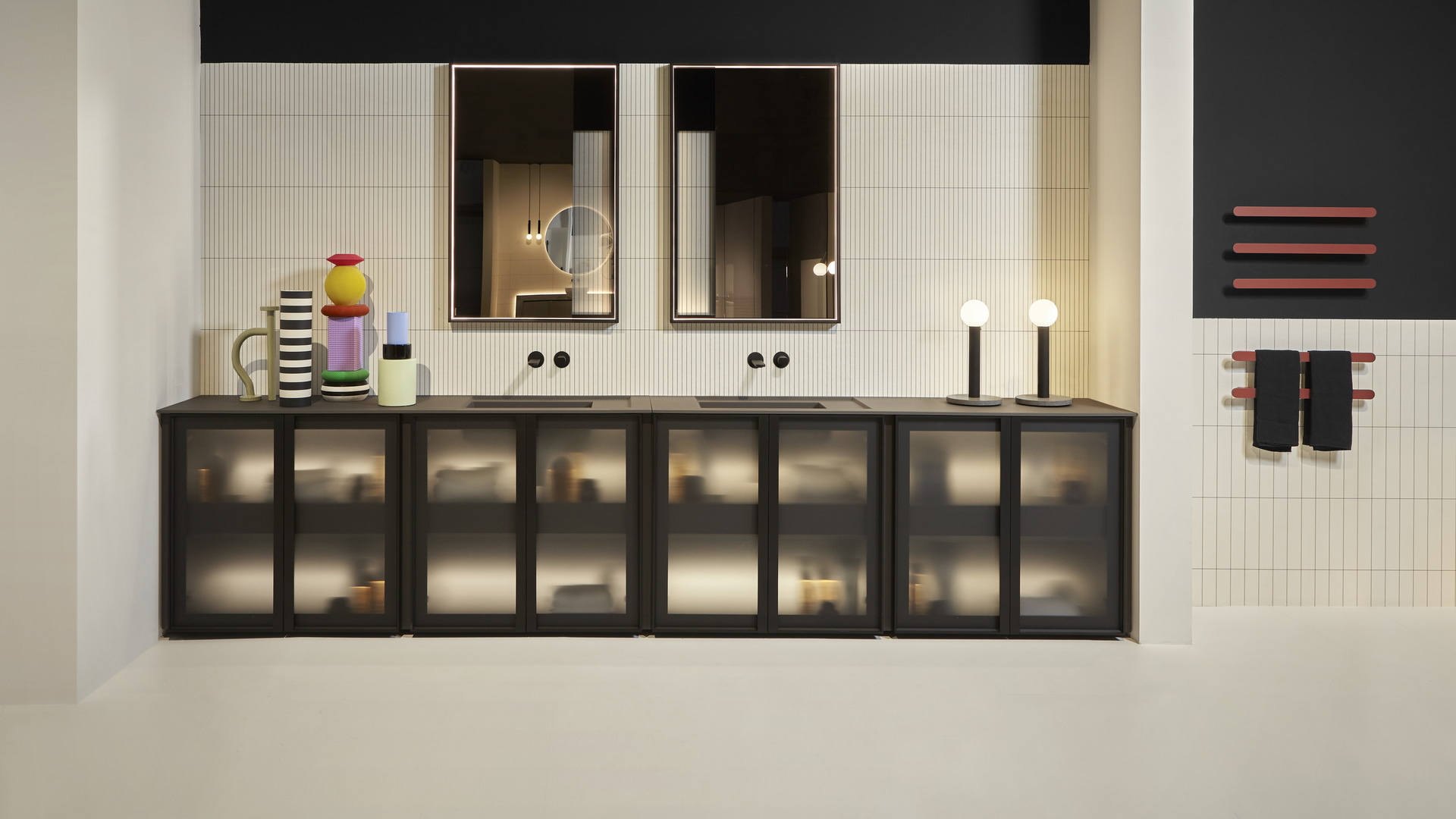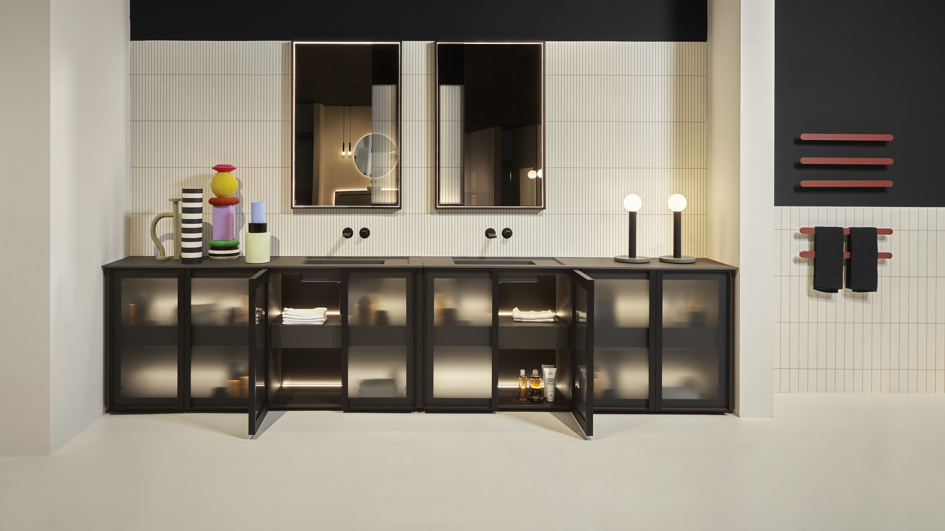 Open wall cabinets in Skin cenere finish. Mirror art. Tratteggio, Indigo tap series in graphite finish, art. Senso sink in Cristalmood Nebbia.