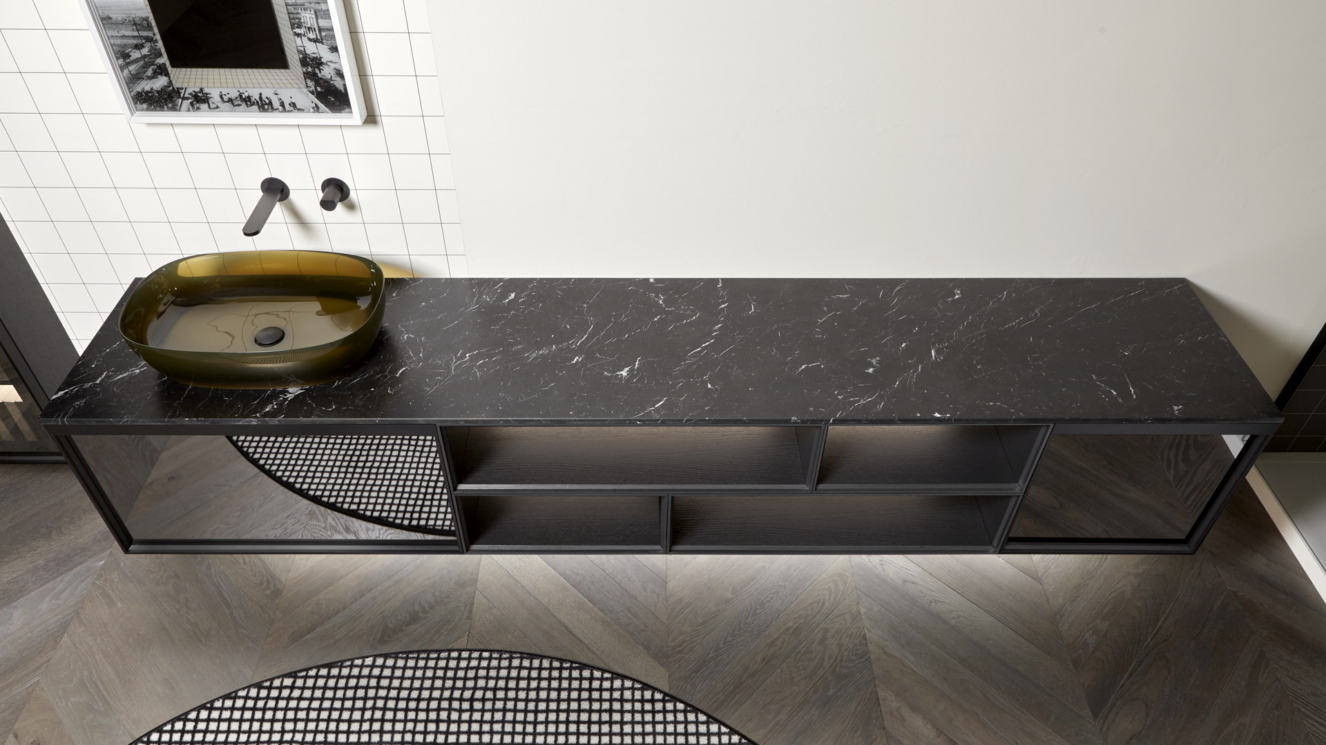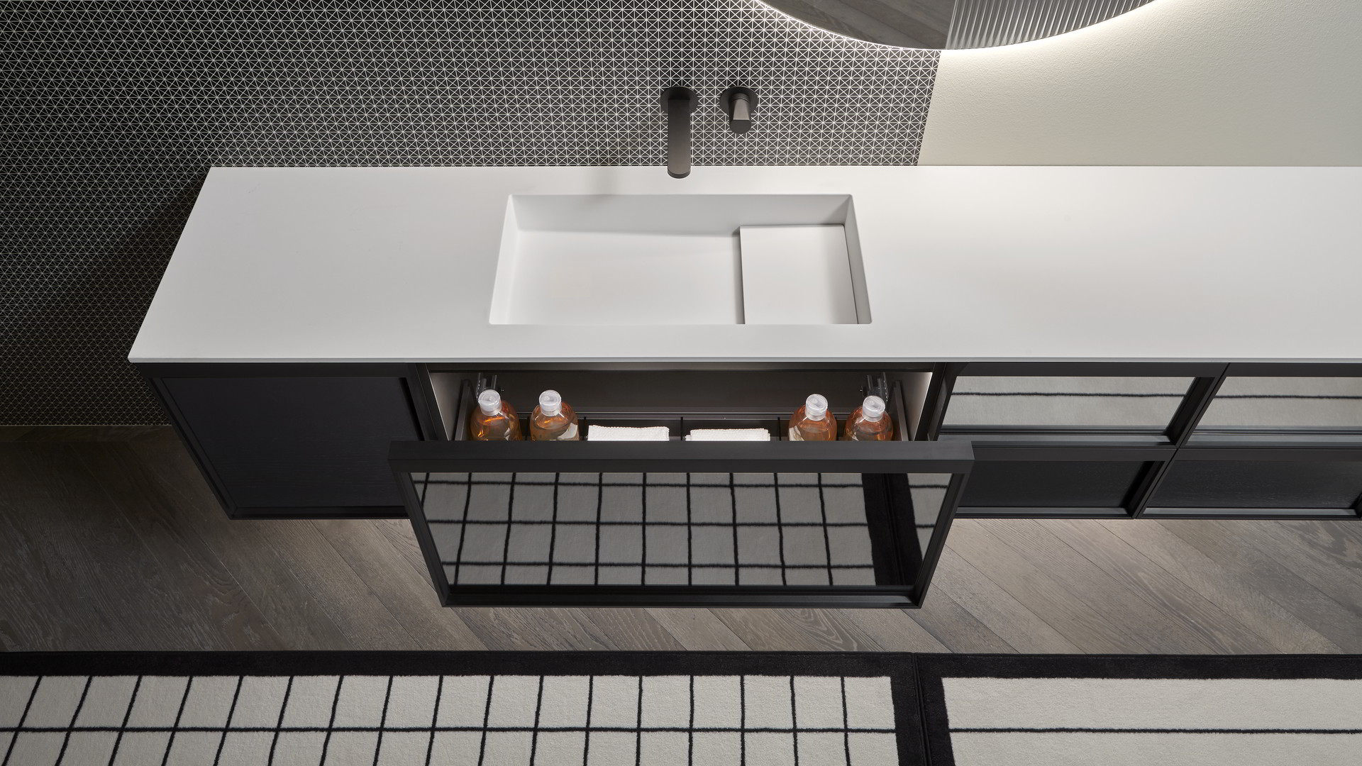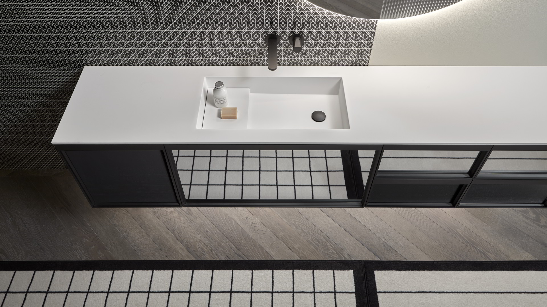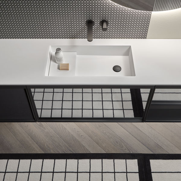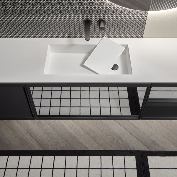 Integrated sink model art. Graffio, mirror Specchidicarta, Indigo tap series matt black.