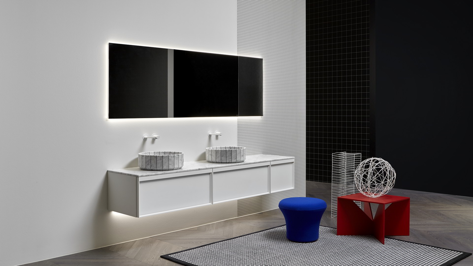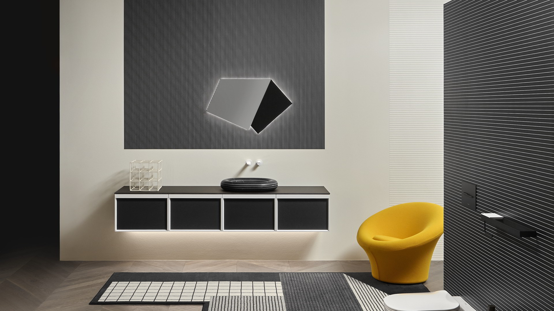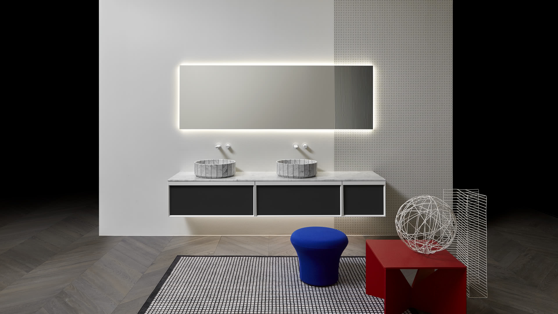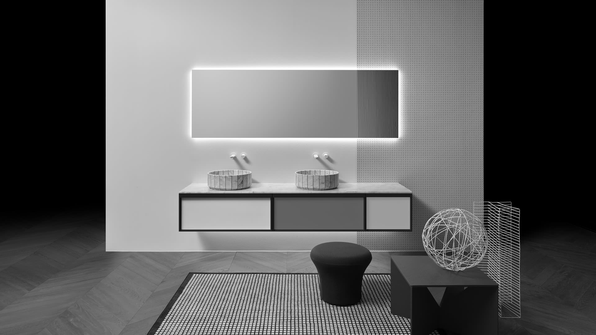 Integrated sink model art. Graffio, mirror Specchidicarta, Indigo tap series matt black.