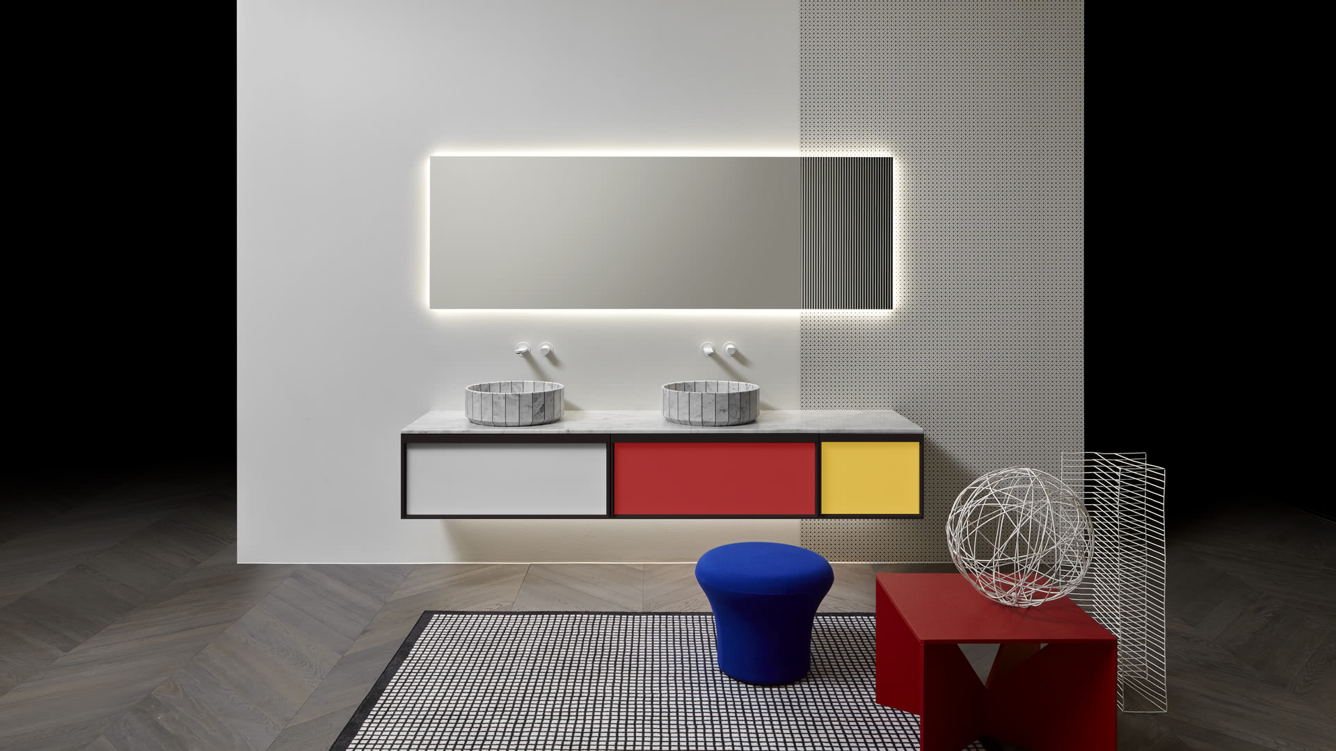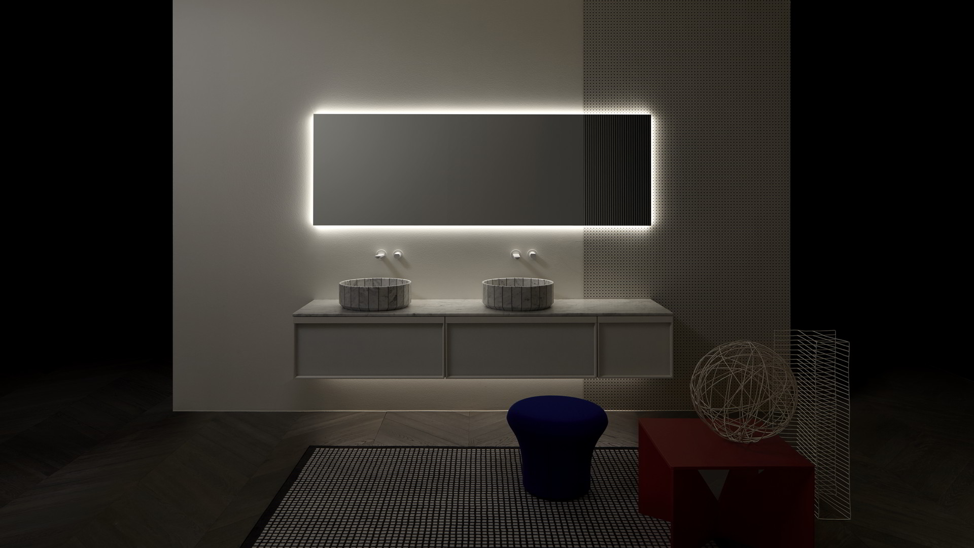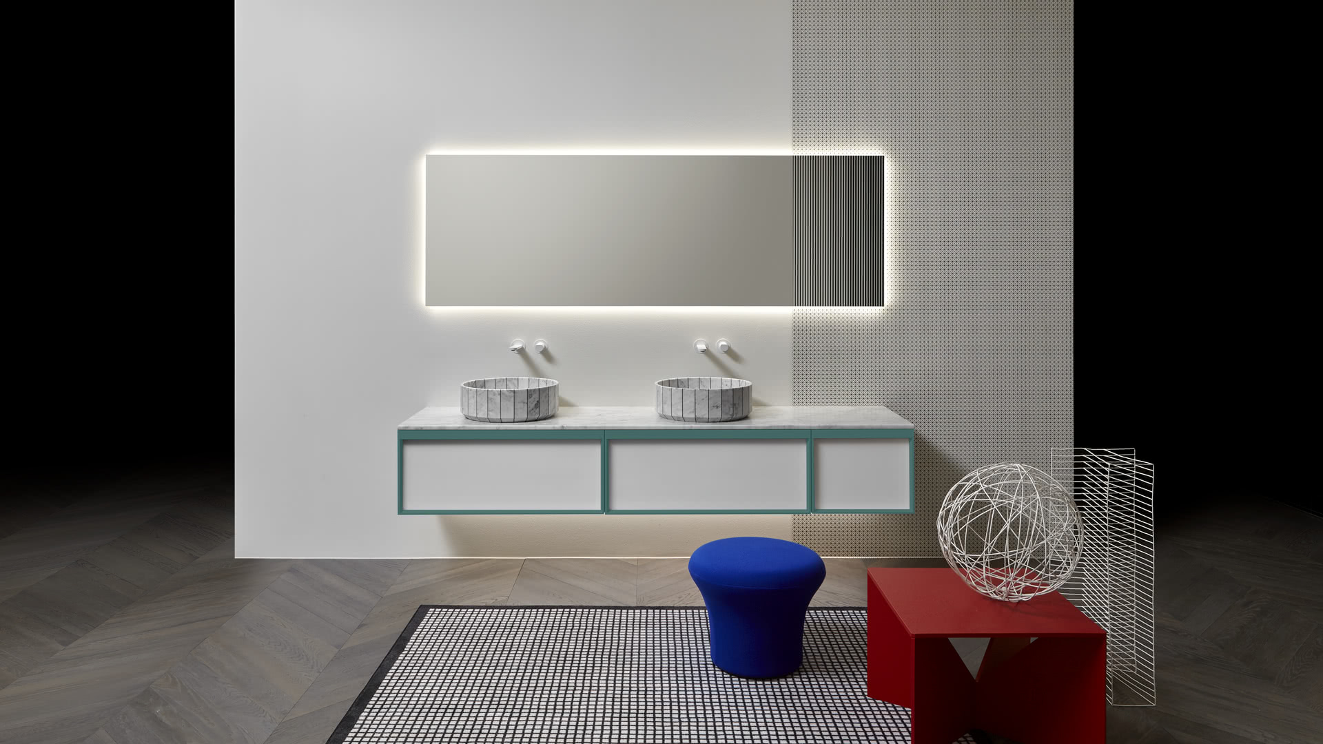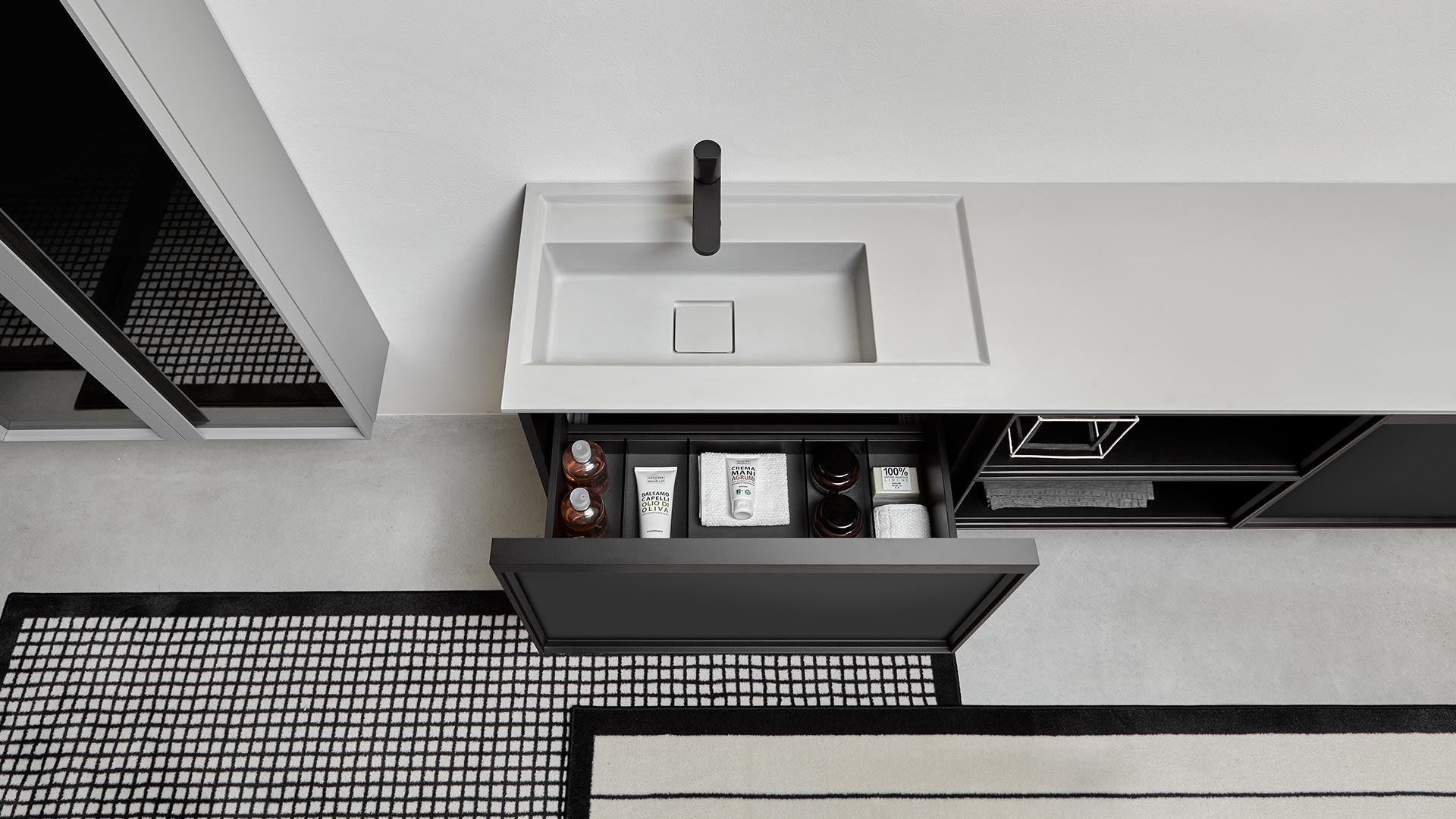 Integrated sink model art. Graffio, mirror Specchidicarta, Indigo tap series matt black.