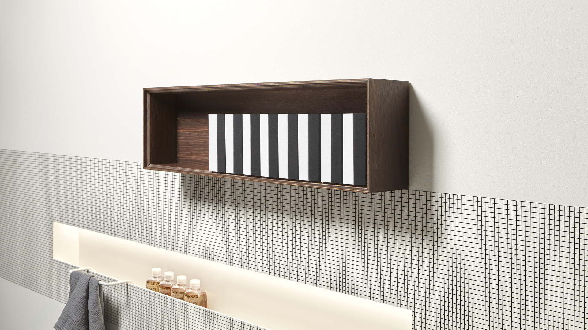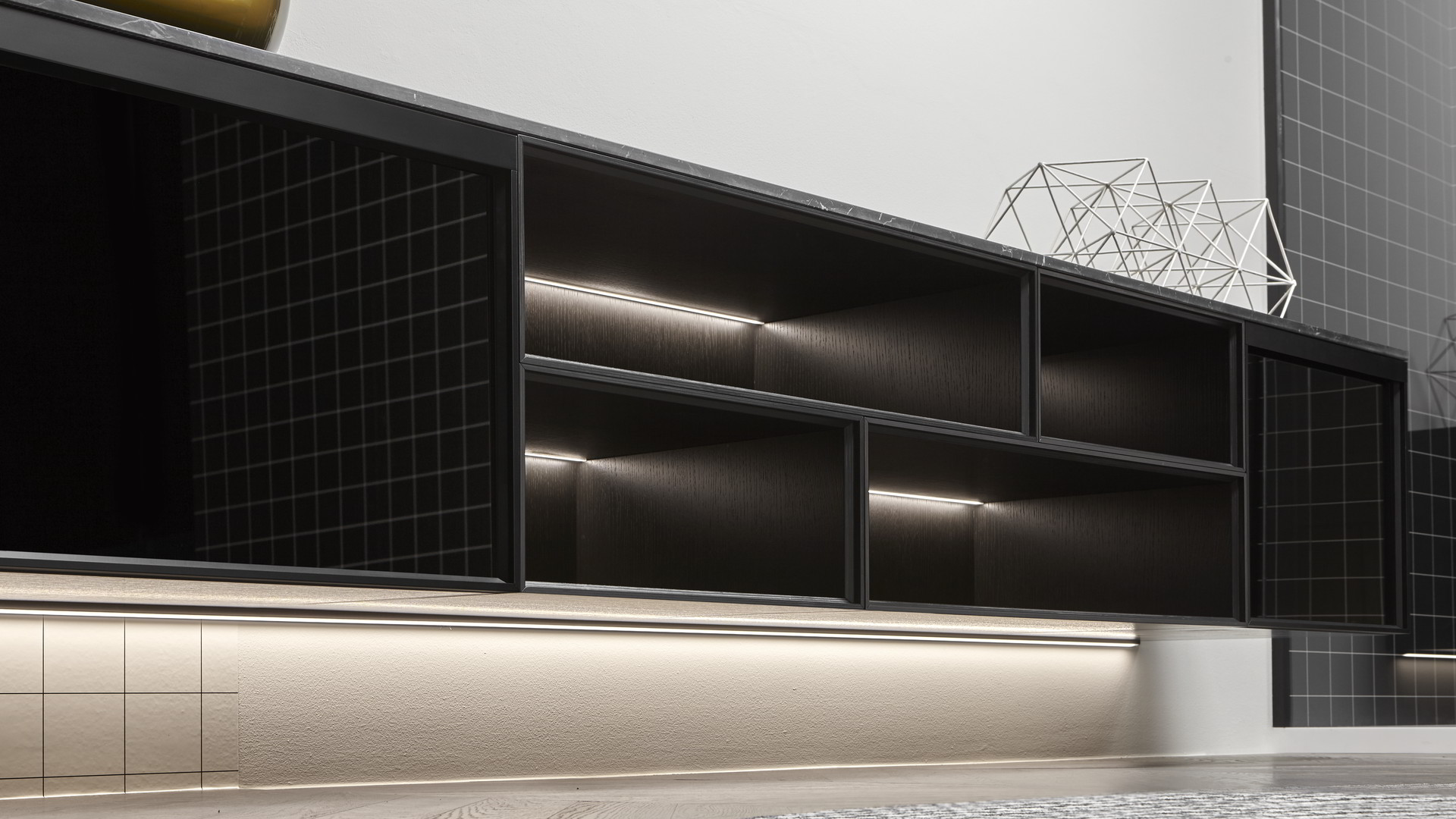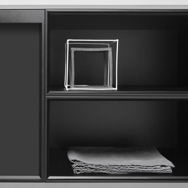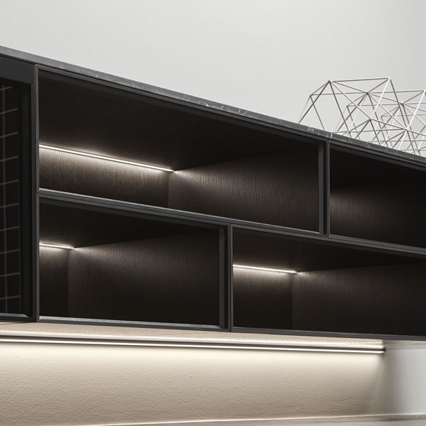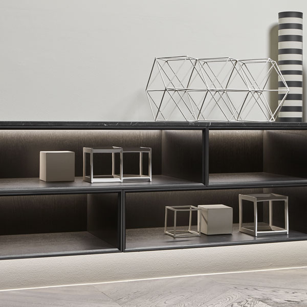 Structure Skin cenere, sides veneered in Rovere ardesia, matt white frame, fronts in Rovere ardesia; top in a black acid etched glass.