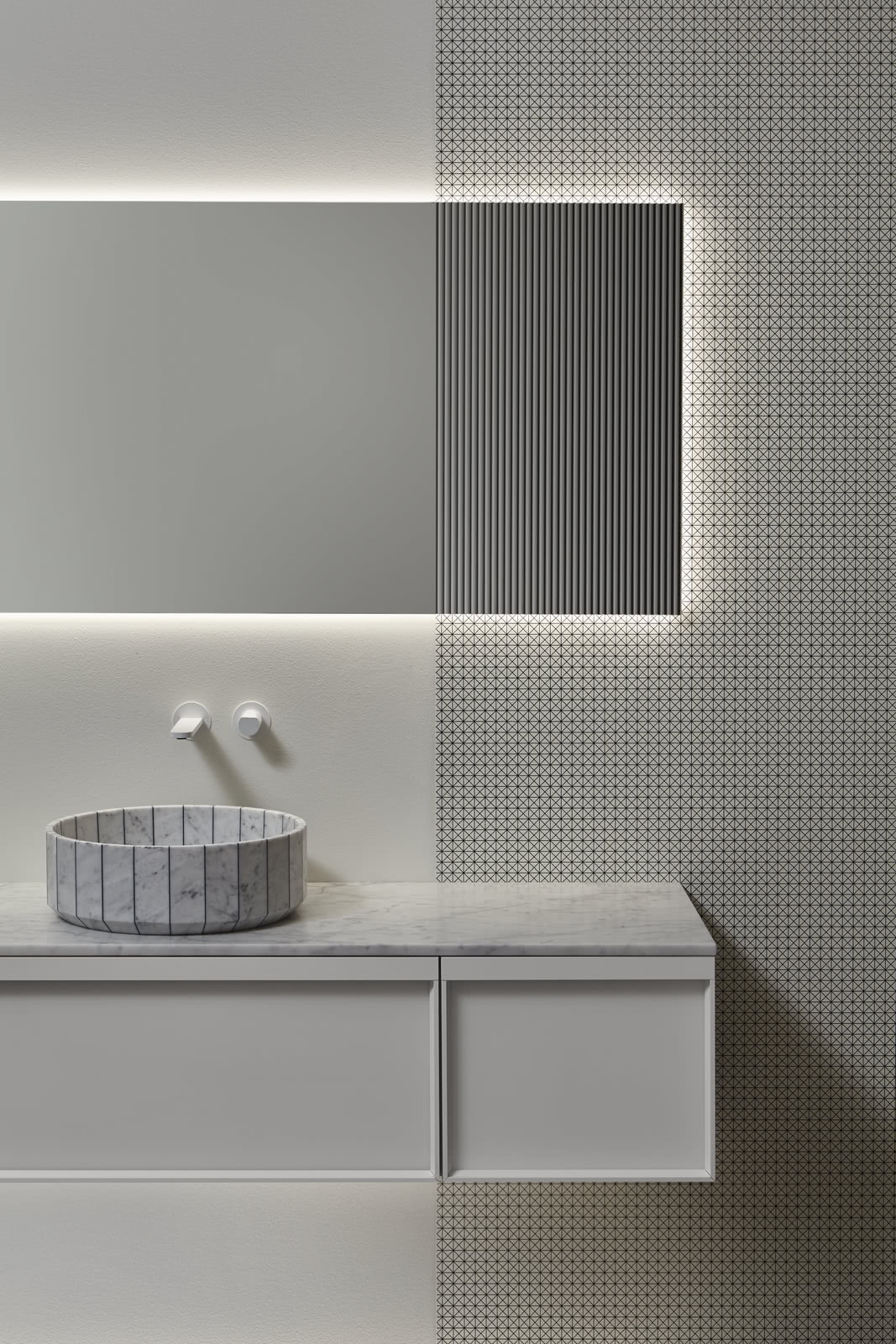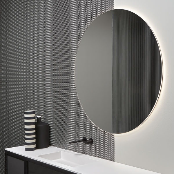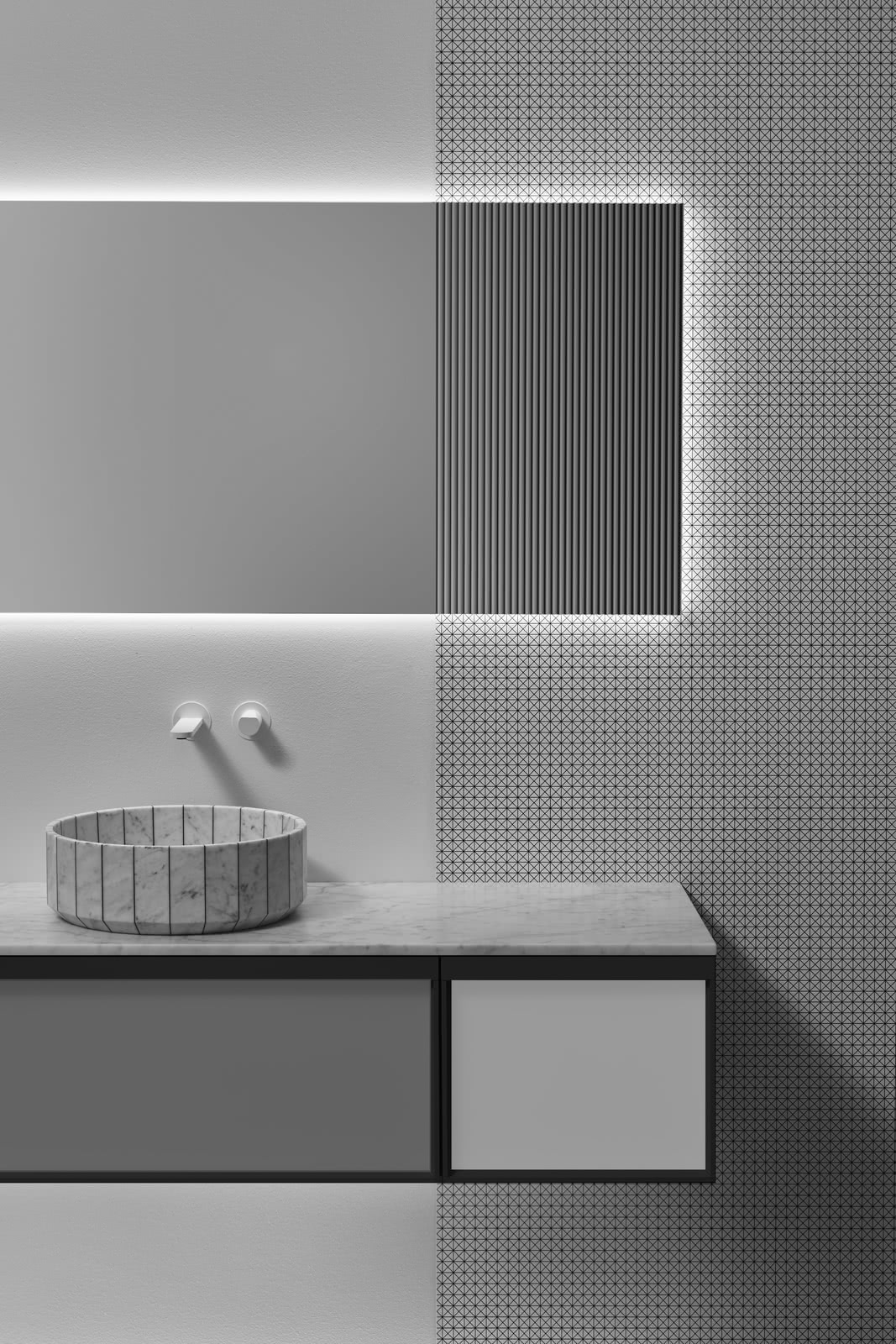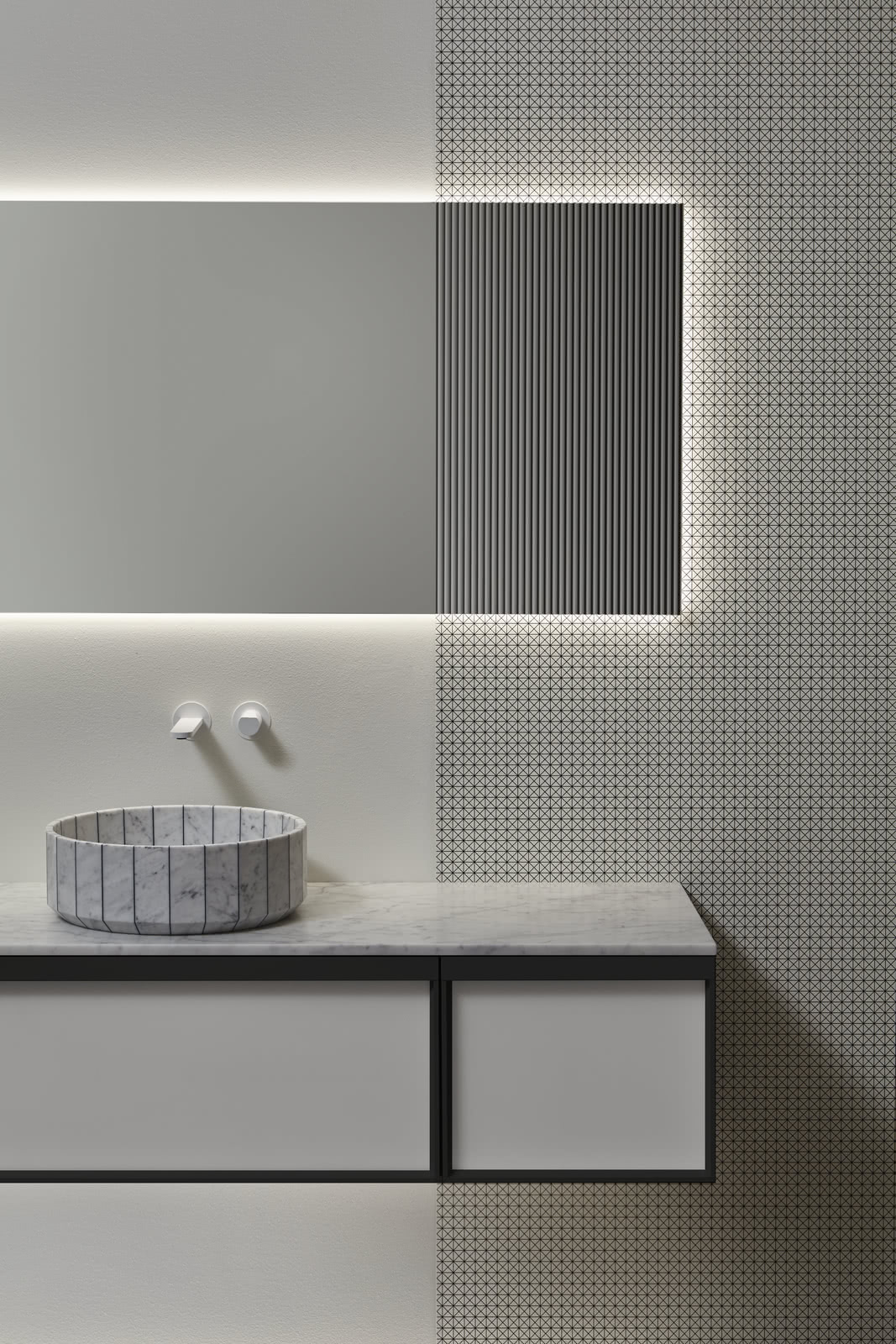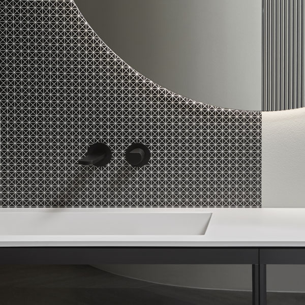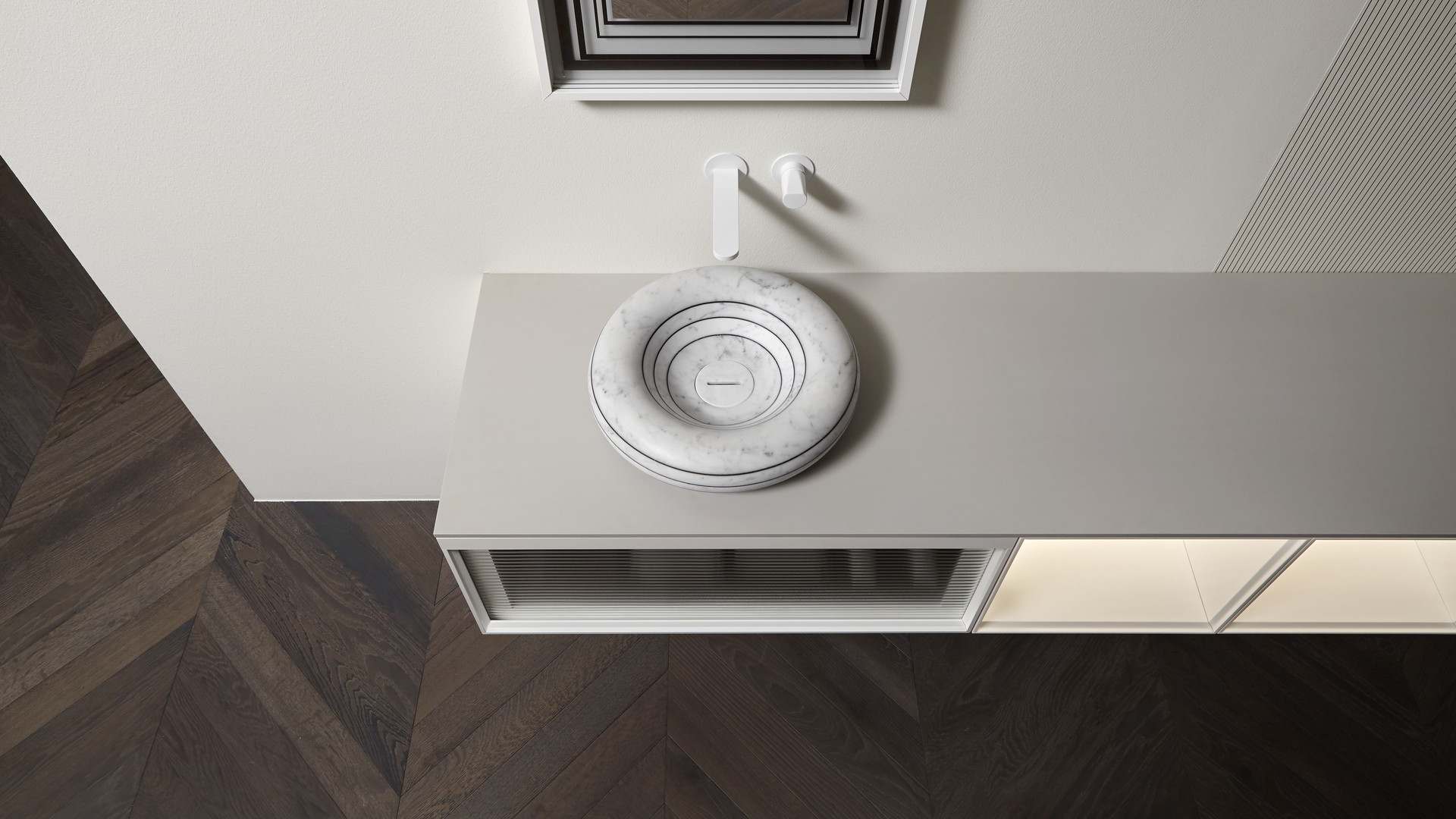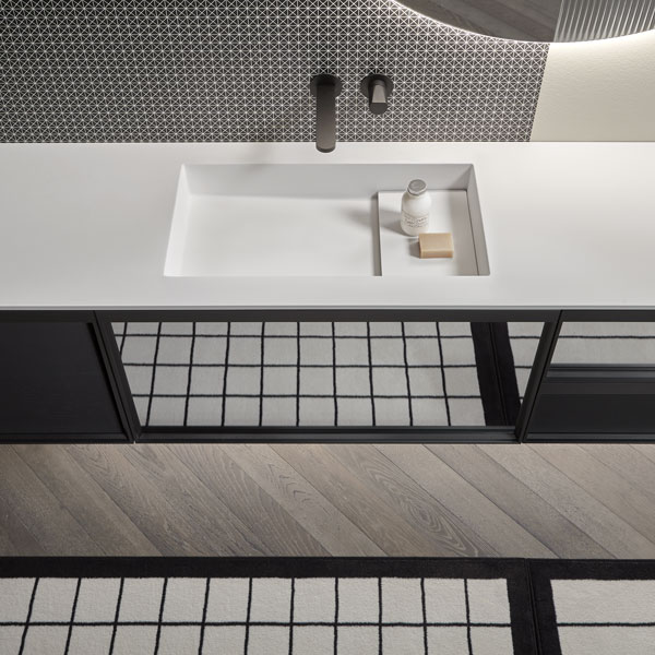 Integrated sink model Graffio, Indigo tap series in matt white, mirror art. Tratteggio.