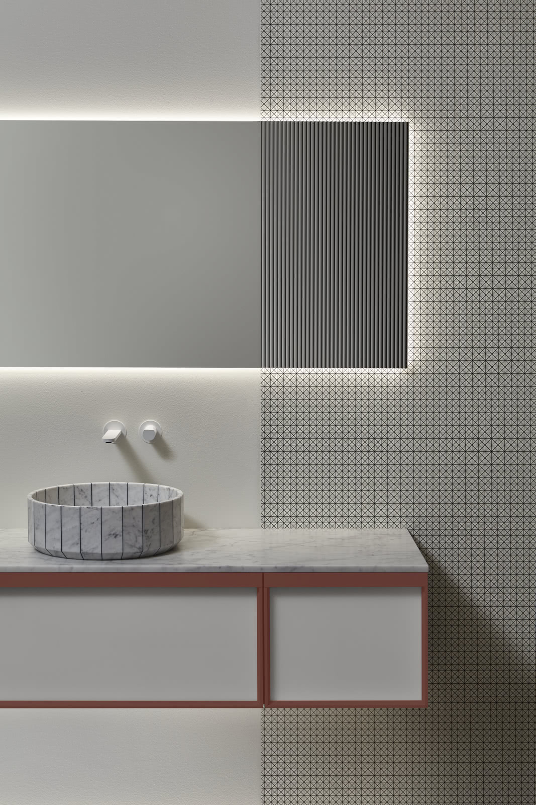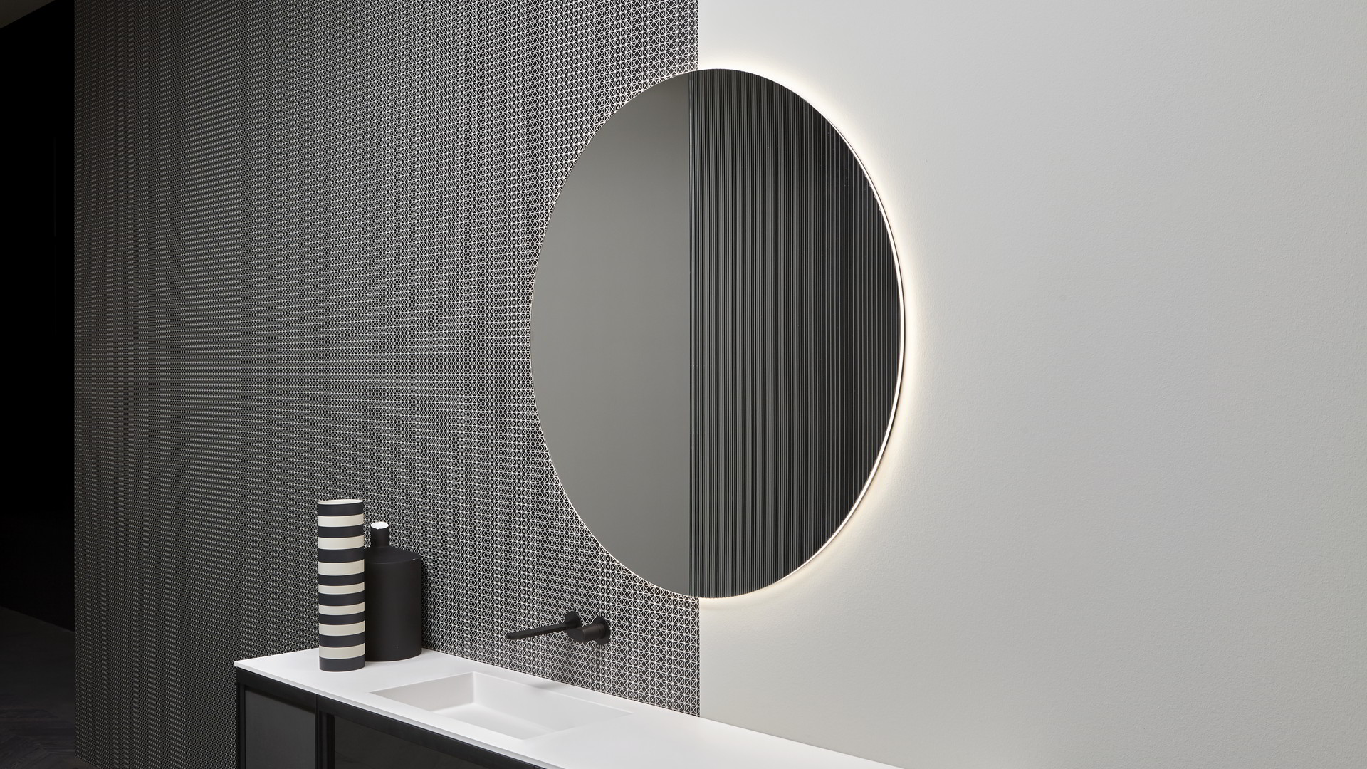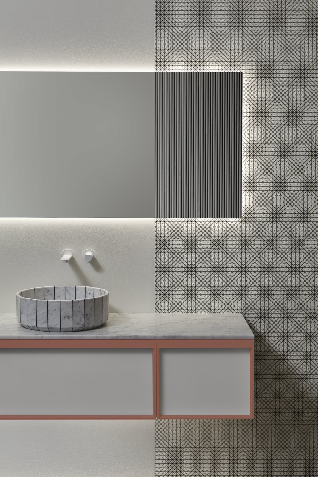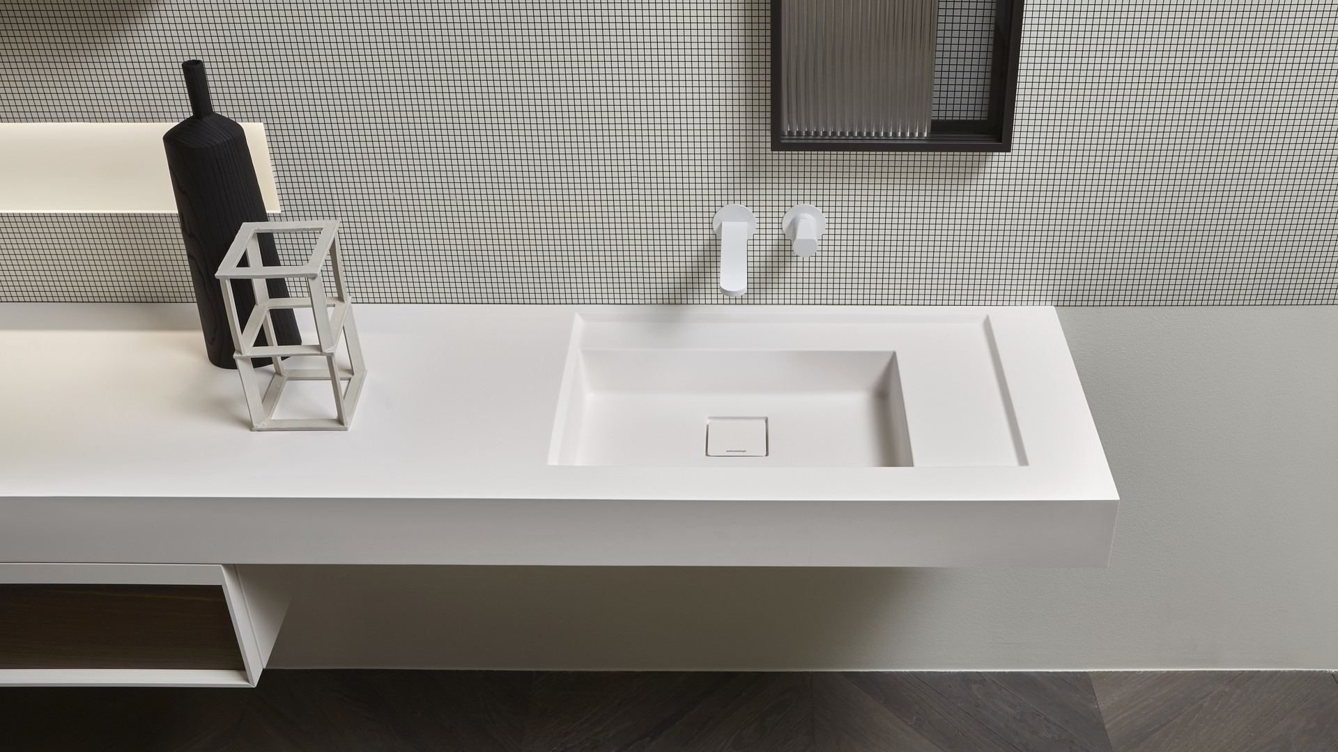 Integrated sink model Graffio, Indigo tap series in matt white, mirror art. Tratteggio.