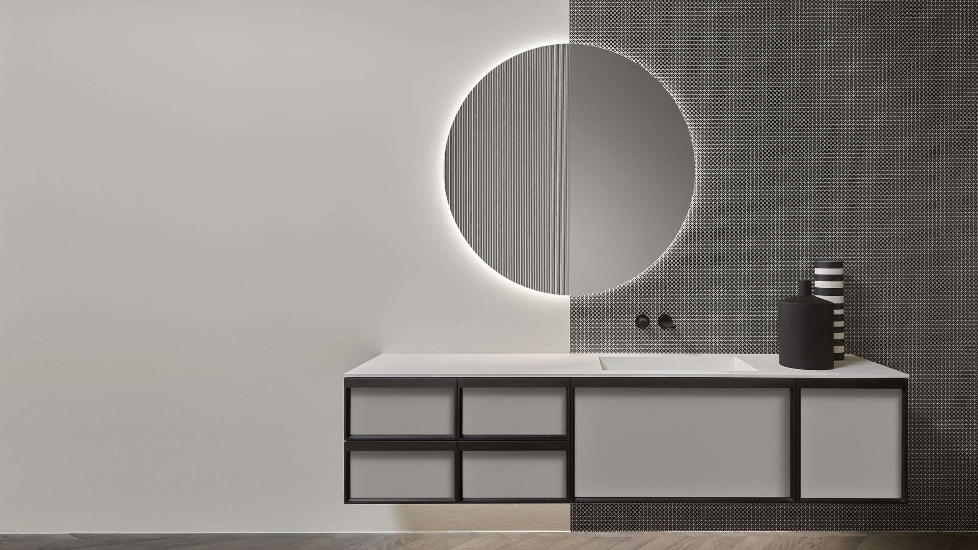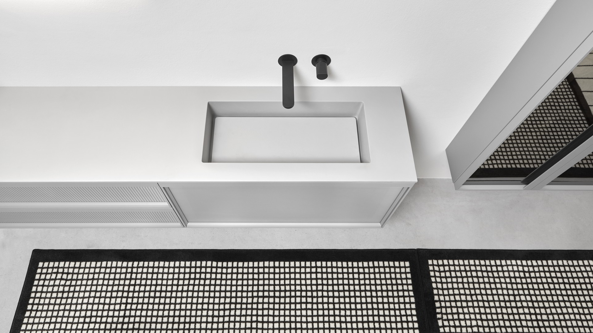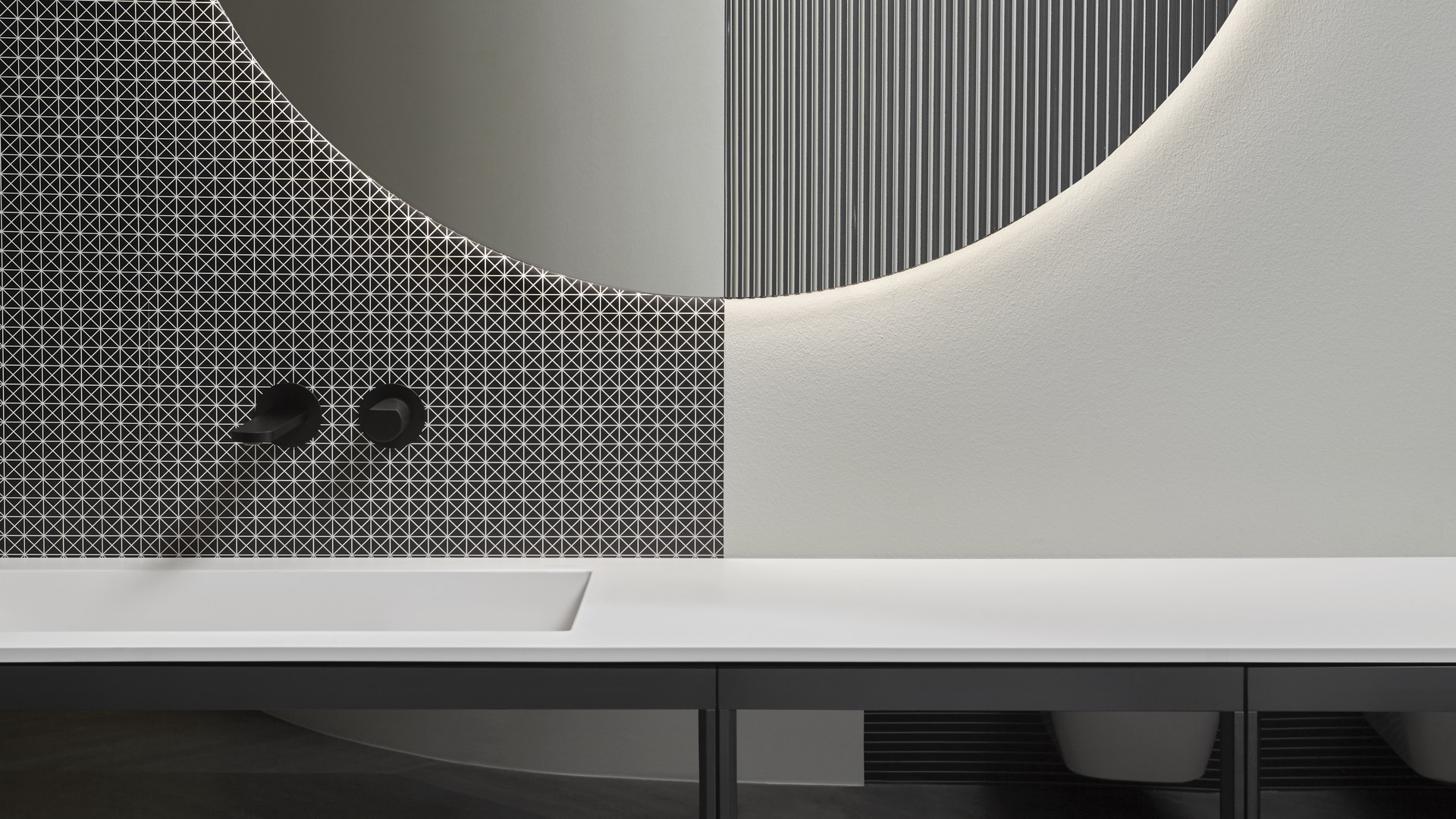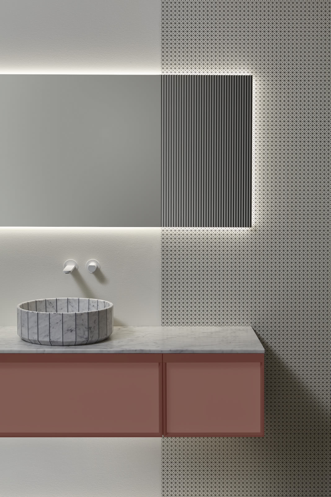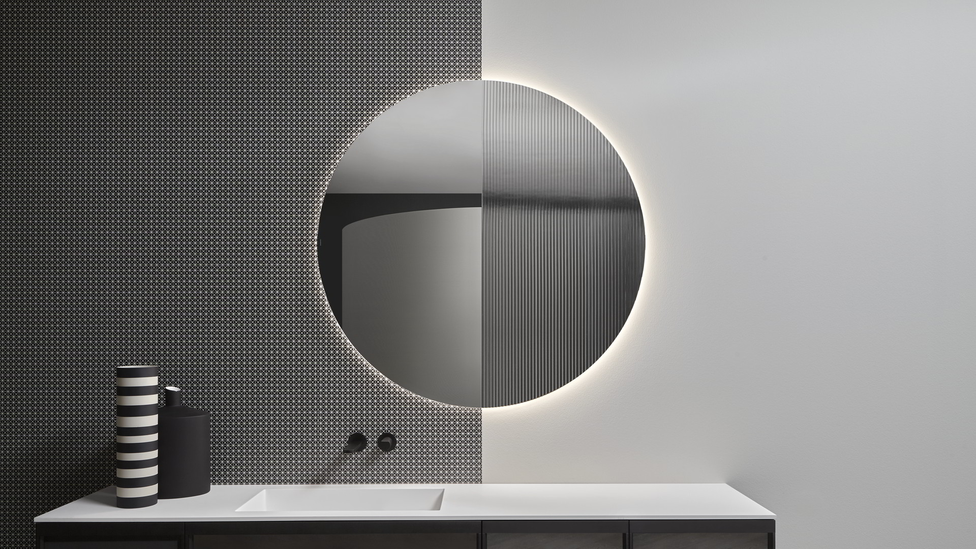 Integrated sink model Graffio, Indigo tap series in matt white, mirror art. Tratteggio.