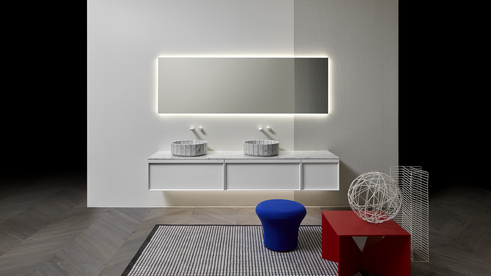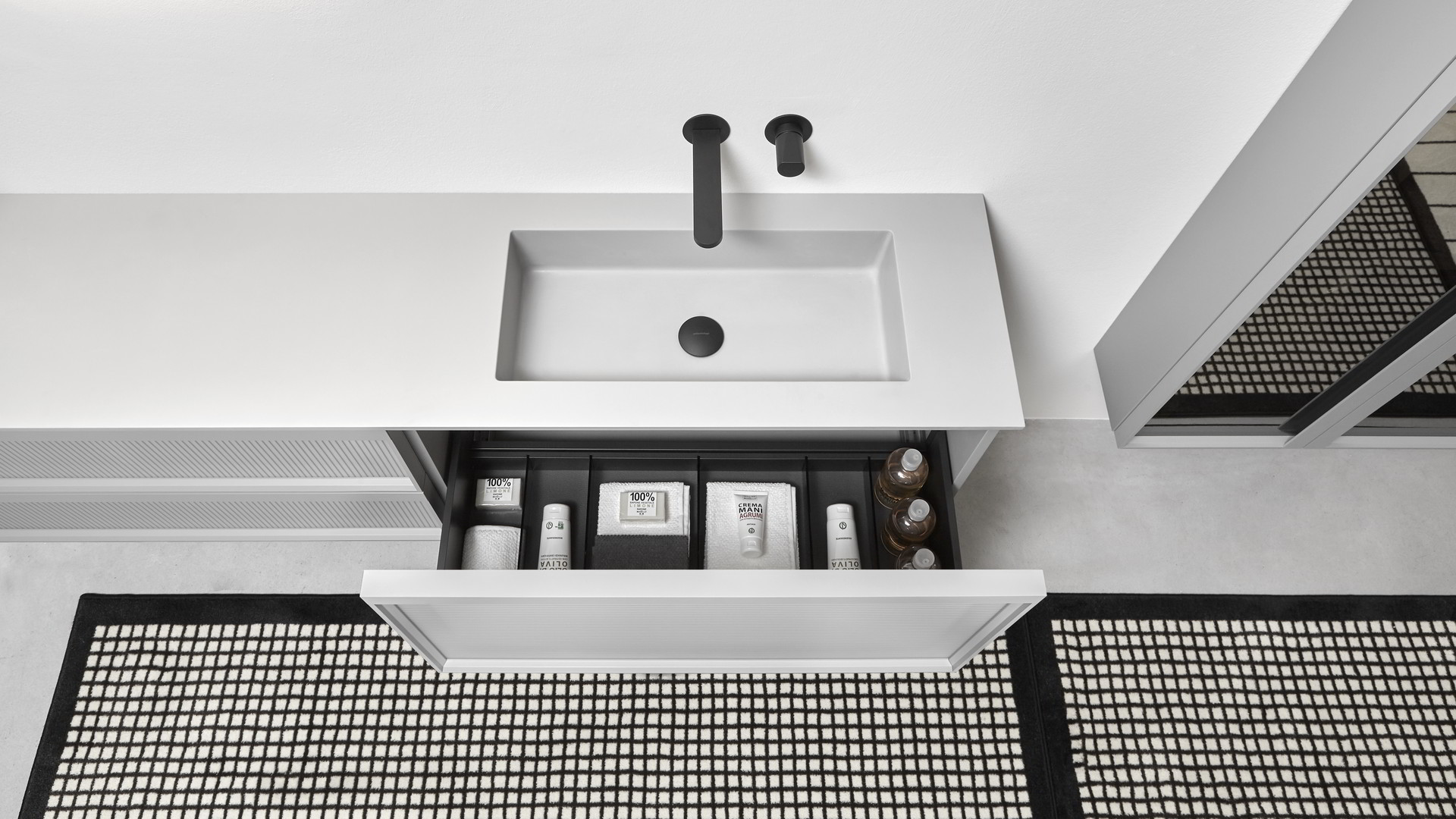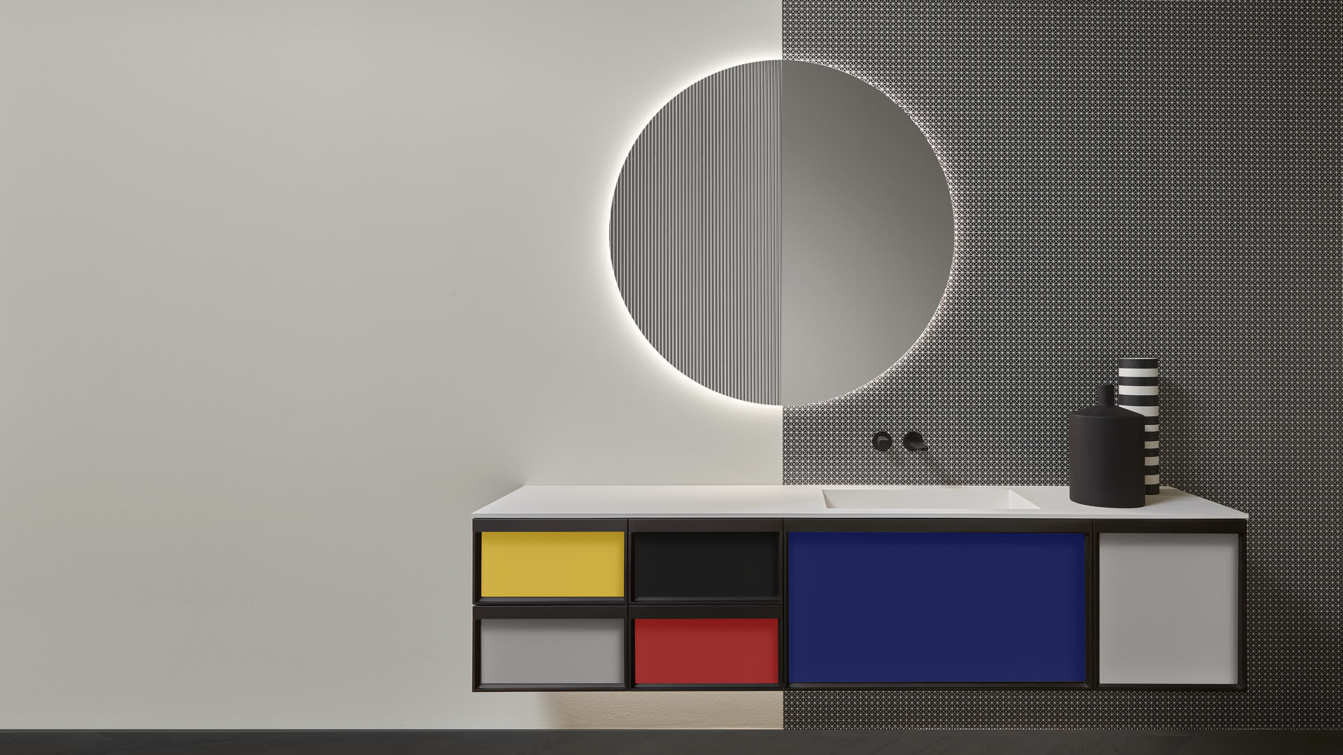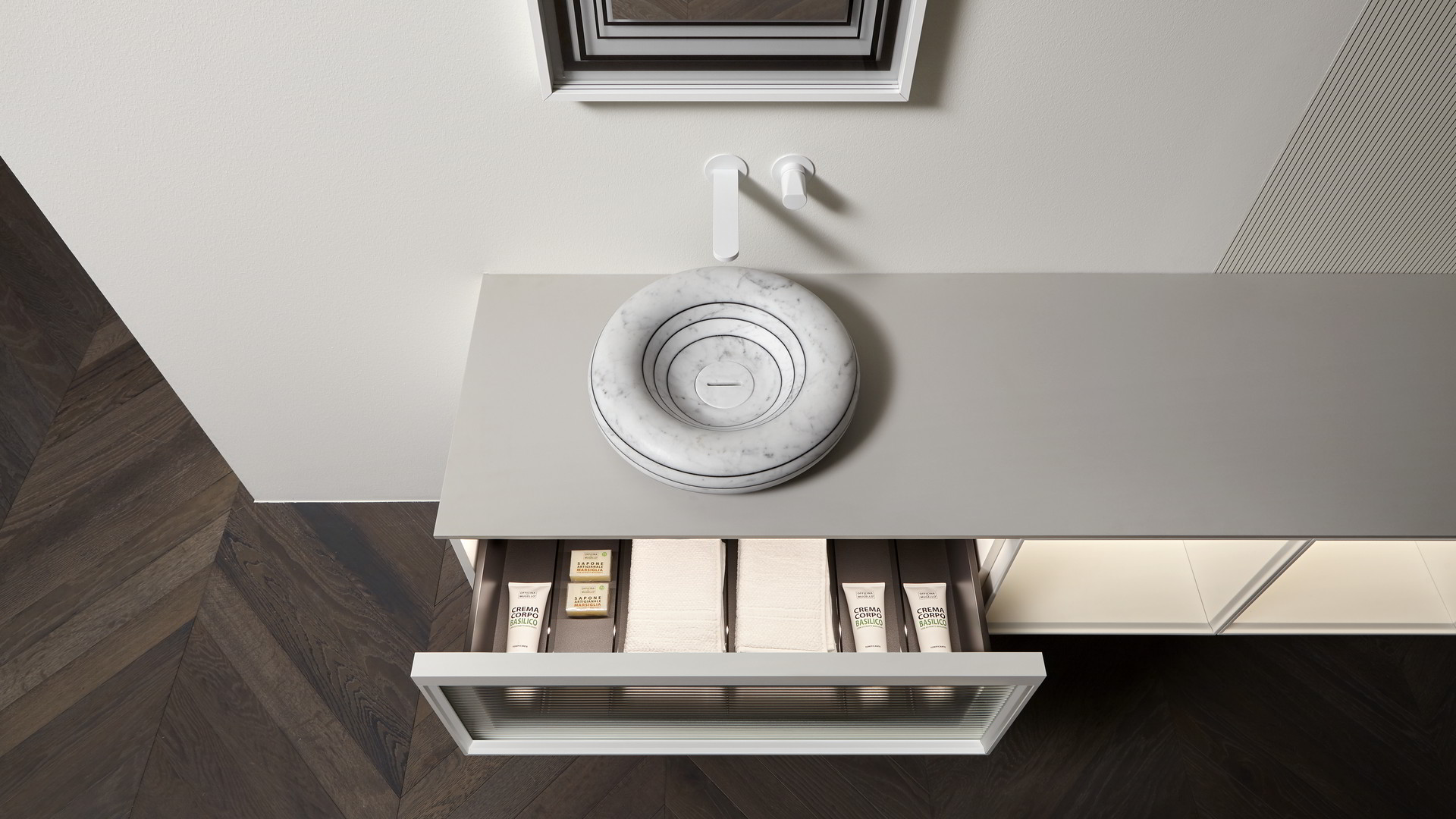 Integrated sink model Graffio, Indigo tap series in matt white, mirror art. Tratteggio.