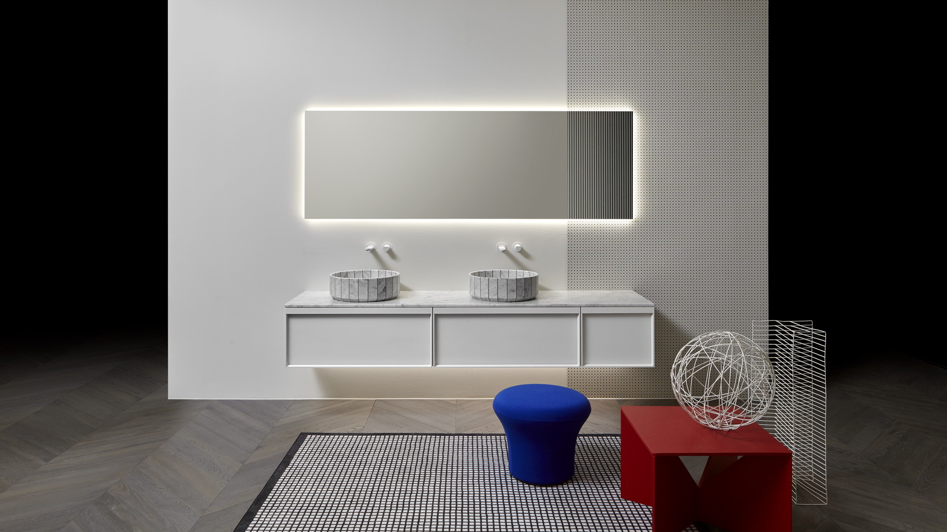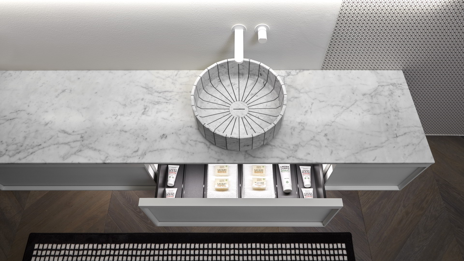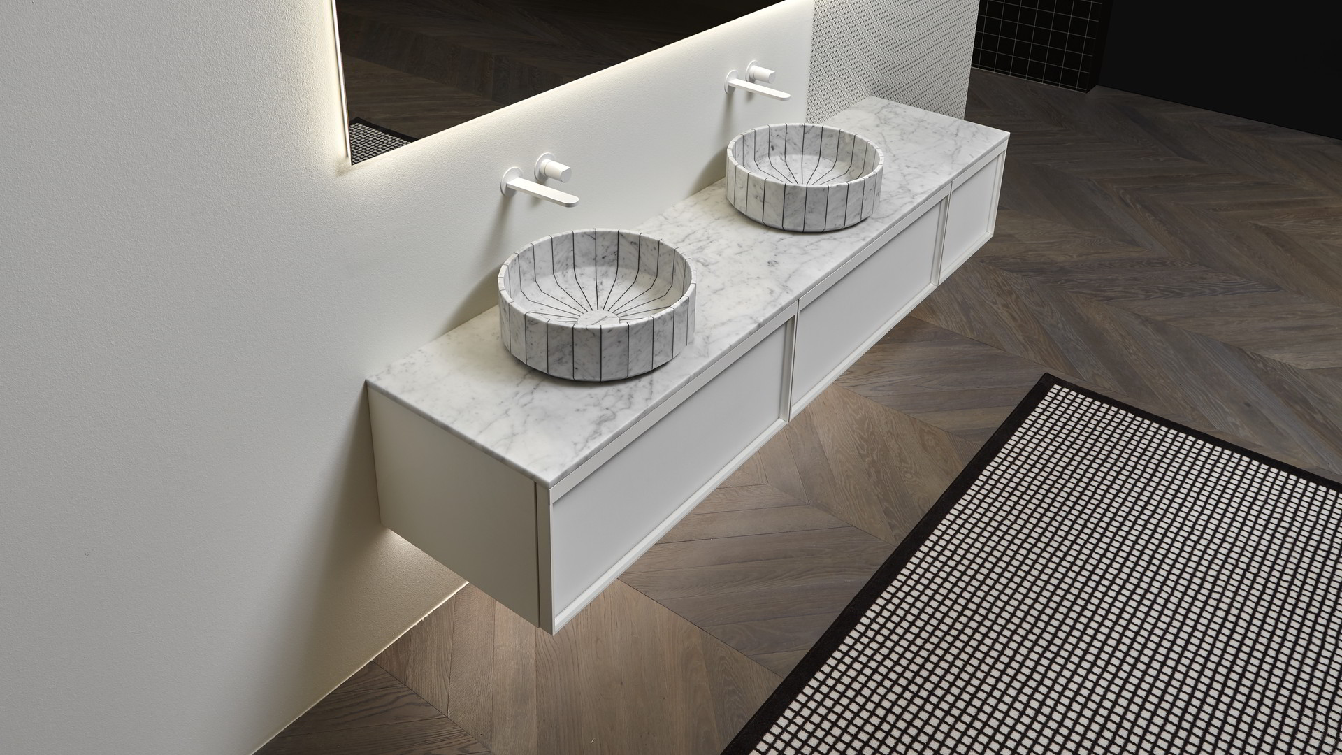 Sinks art. Gessati in Carrara marble, Indigo tap series matt white.