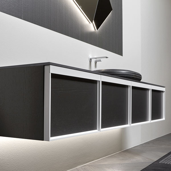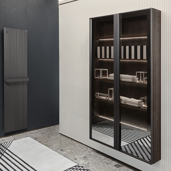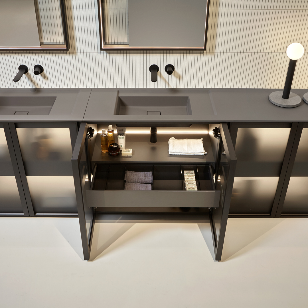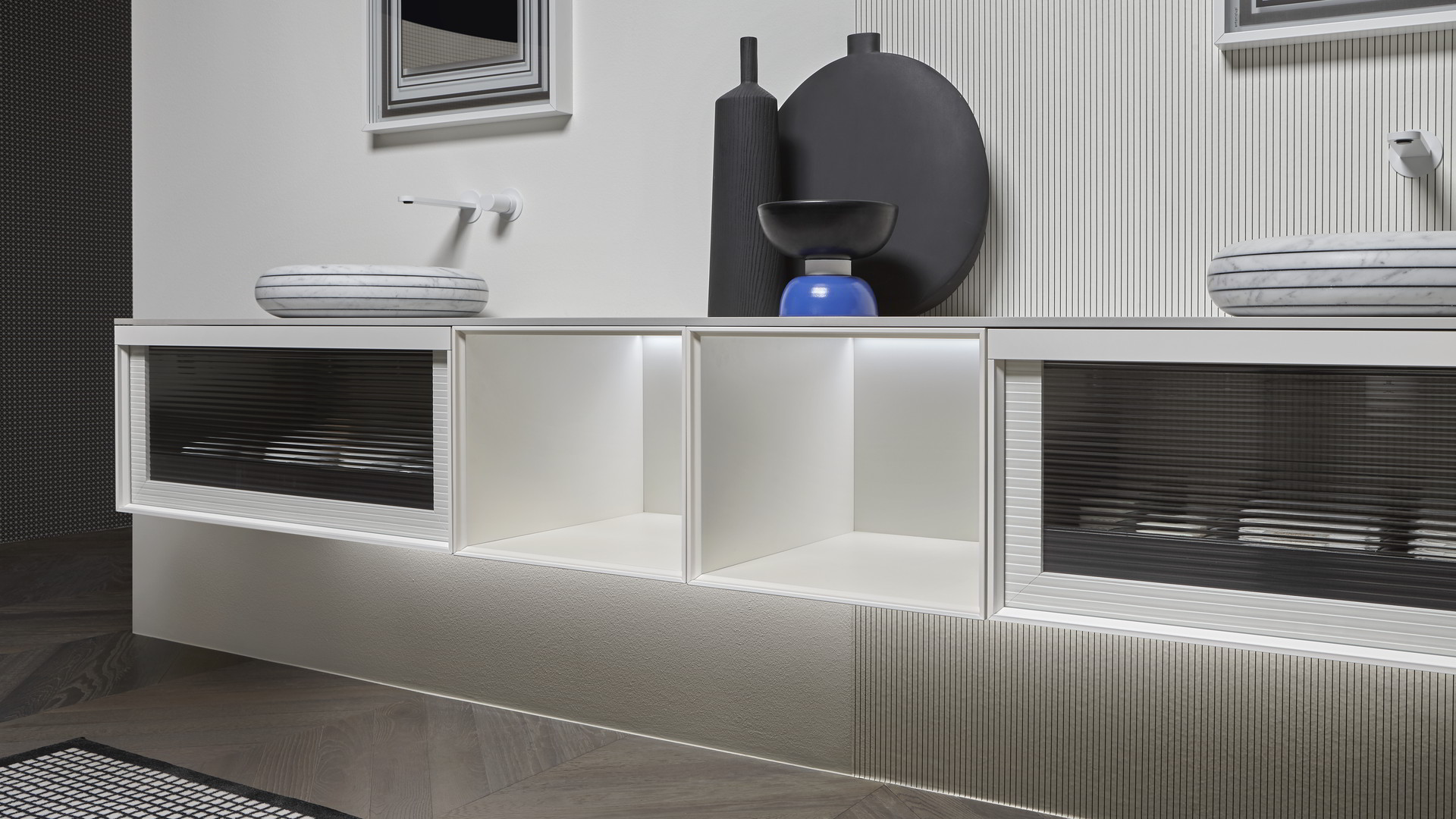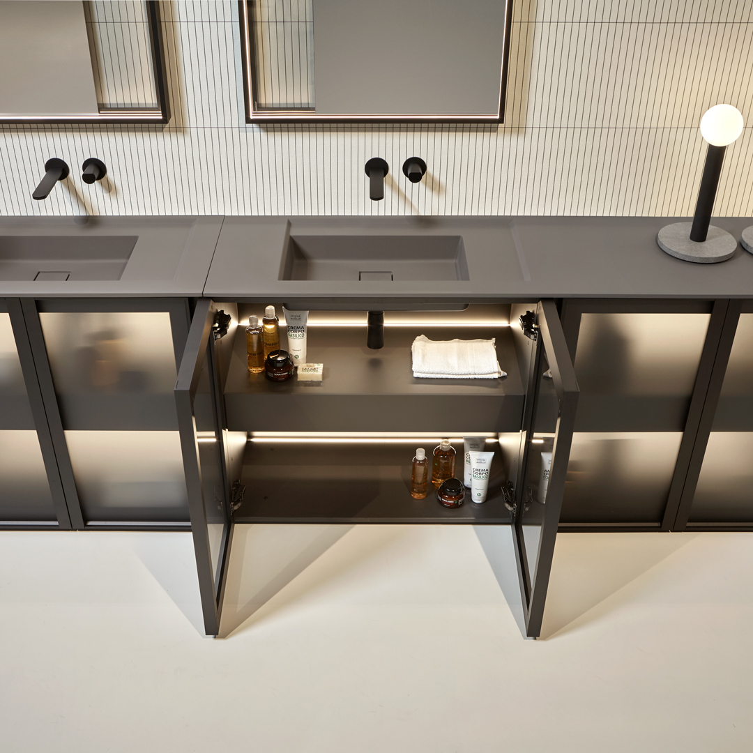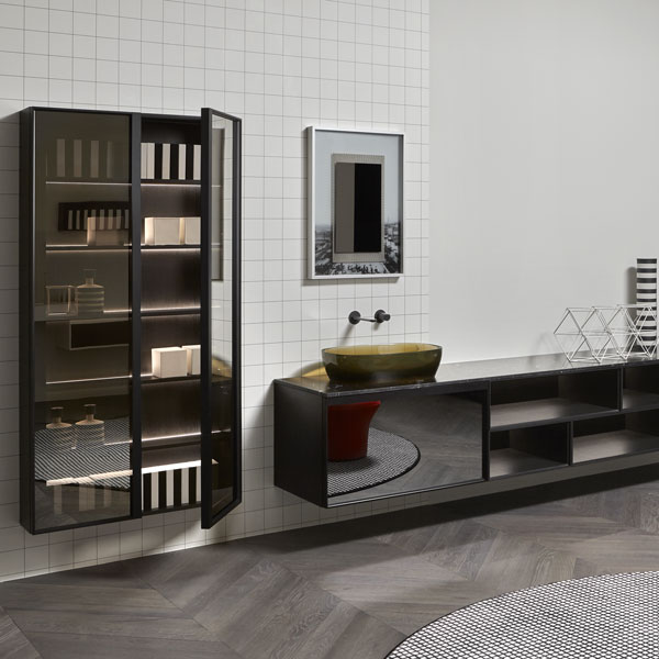The finishes of the aluminum frame already available in the Bespoke program (bronze, titanium, zirconium and palladio) are now joined by matt black, matt white and all the lacquered colors of our collection. These selections match the trends of contemporary interior and dialogue with the matt finishes of other metal elements or ceramic volumes. The wide range of glass fronts (natural silver/ fumè and bronze silver / reflective / acid etched fumè or bronze glass /clear fumè or bronze /clear ribbed or back-lacquered in all the colors of our collection) as well as the wooden finishes and the addition of open compartments that expand the way the series is used to embrace the living environment and bring the unmistakable style of antoniolupi to all spaces in the home.