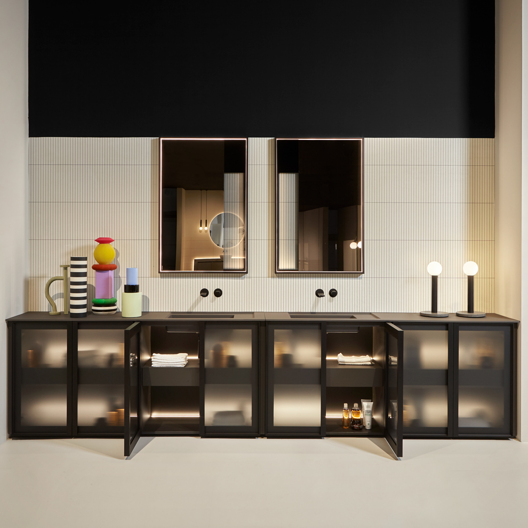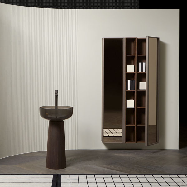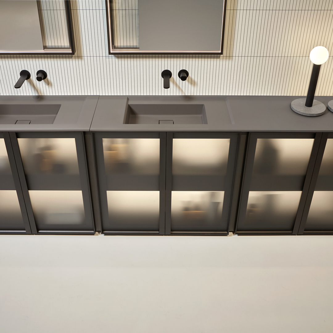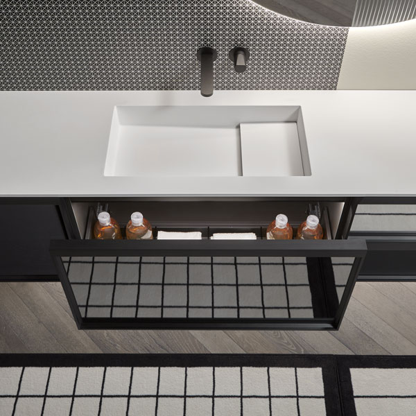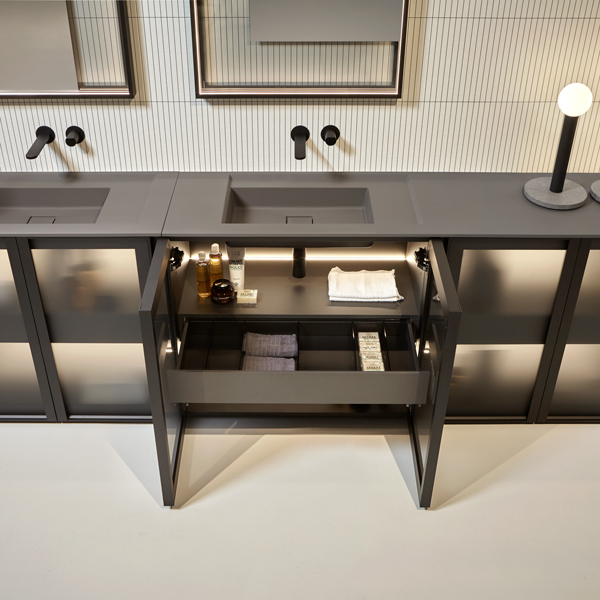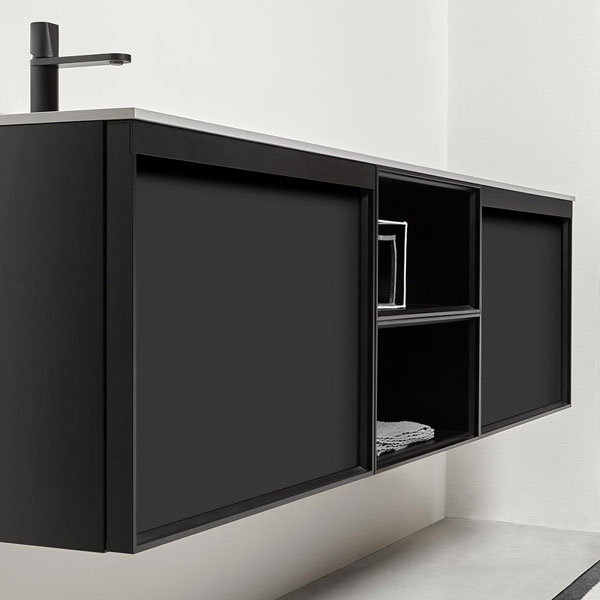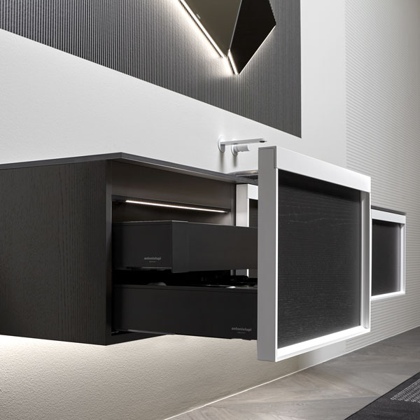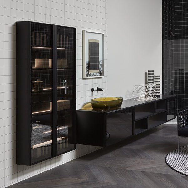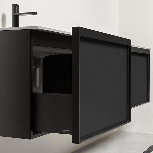 The finishes of the aluminum frame already available in the Bespoke program (bronze, titanium, zirconium and palladio) are now joined by matt black, matt white and all the lacquered colors of our collection. These selections match the trends of contemporary interior and dialogue with the matt finishes of other metal elements or ceramic volumes. The wide range of glass fronts (natural silver/ fumè and bronze silver / reflective / acid etched fumè or bronze glass /clear fumè or bronze /clear ribbed or back-lacquered in all the colors of our collection) as well as the wooden finishes and the addition of open compartments that expand the way the series is used to embrace the living environment and bring the unmistakable style of antoniolupi to all spaces in the home.