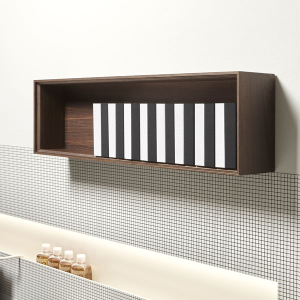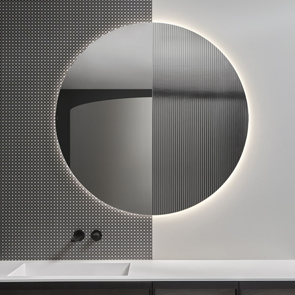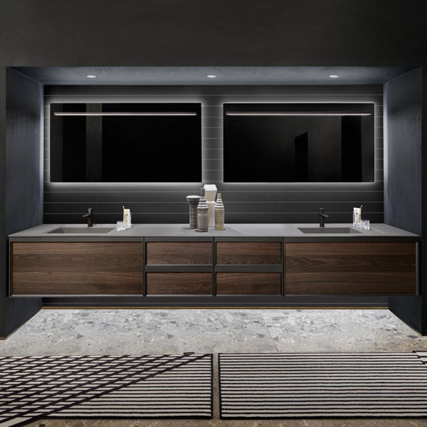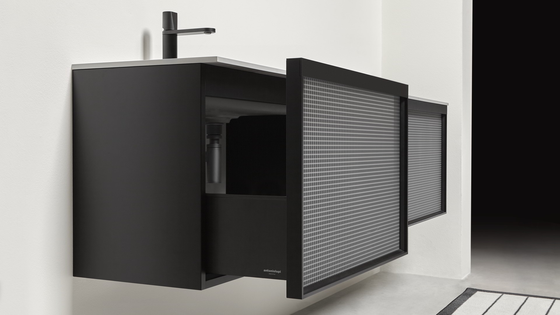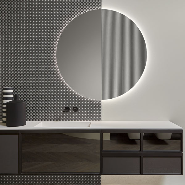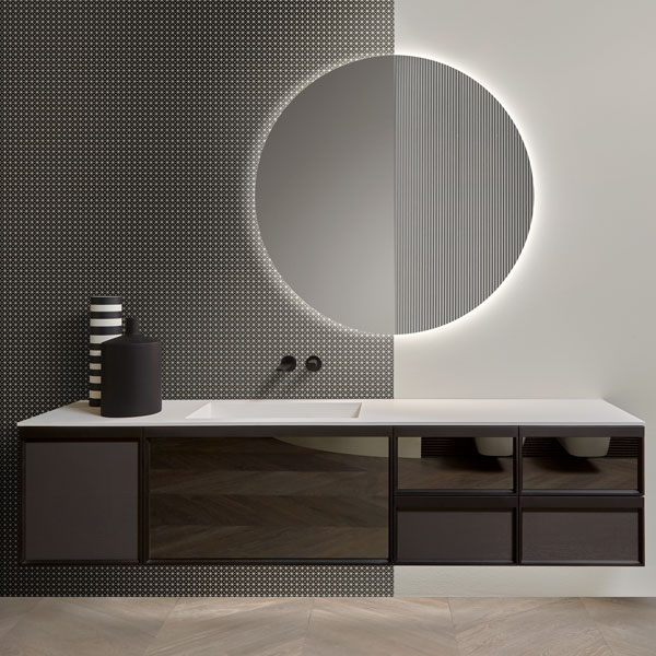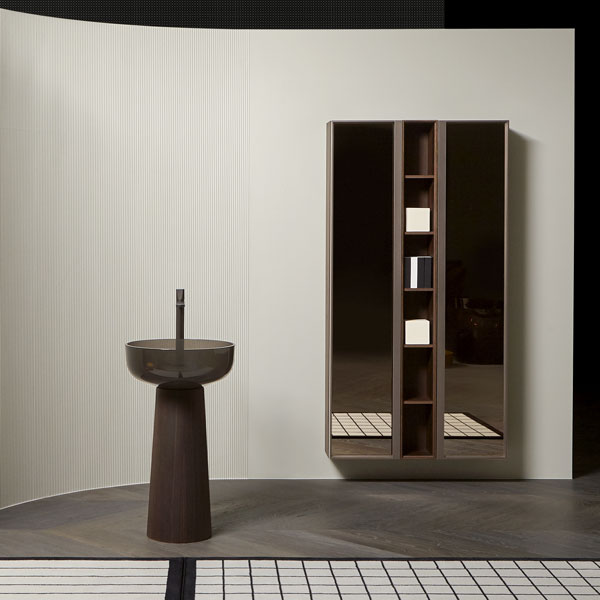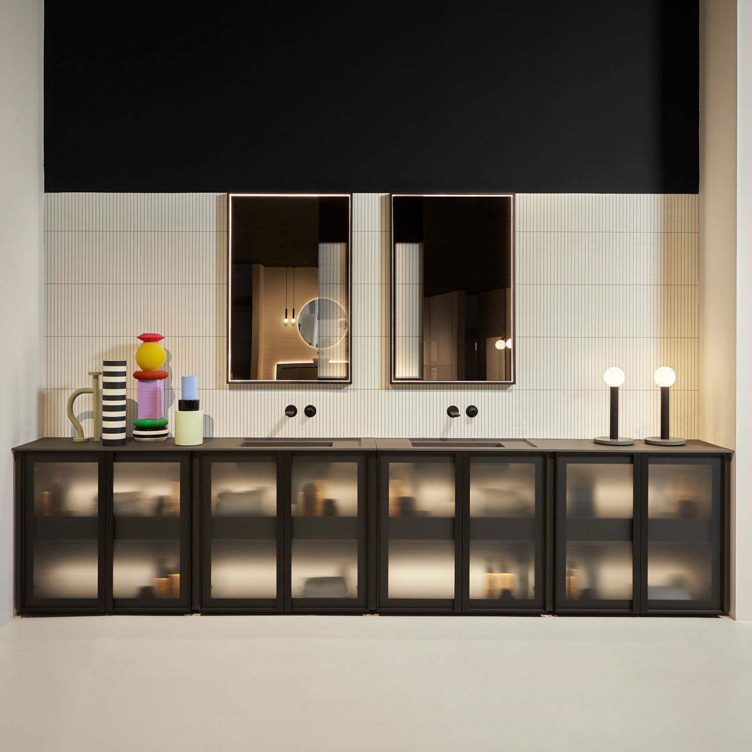 The finishes of the aluminum frame already available in the Bespoke program (bronze, titanium, zirconium and palladio) are now joined by matt black, matt white and all the lacquered colors of our collection. These selections match the trends of contemporary interior and dialogue with the matt finishes of other metal elements or ceramic volumes. The wide range of glass fronts (natural silver/ fumè and bronze silver / reflective / acid etched fumè or bronze glass /clear fumè or bronze /clear ribbed or back-lacquered in all the colors of our collection) as well as the wooden finishes and the addition of open compartments that expand the way the series is used to embrace the living environment and bring the unmistakable style of antoniolupi to all spaces in the home.