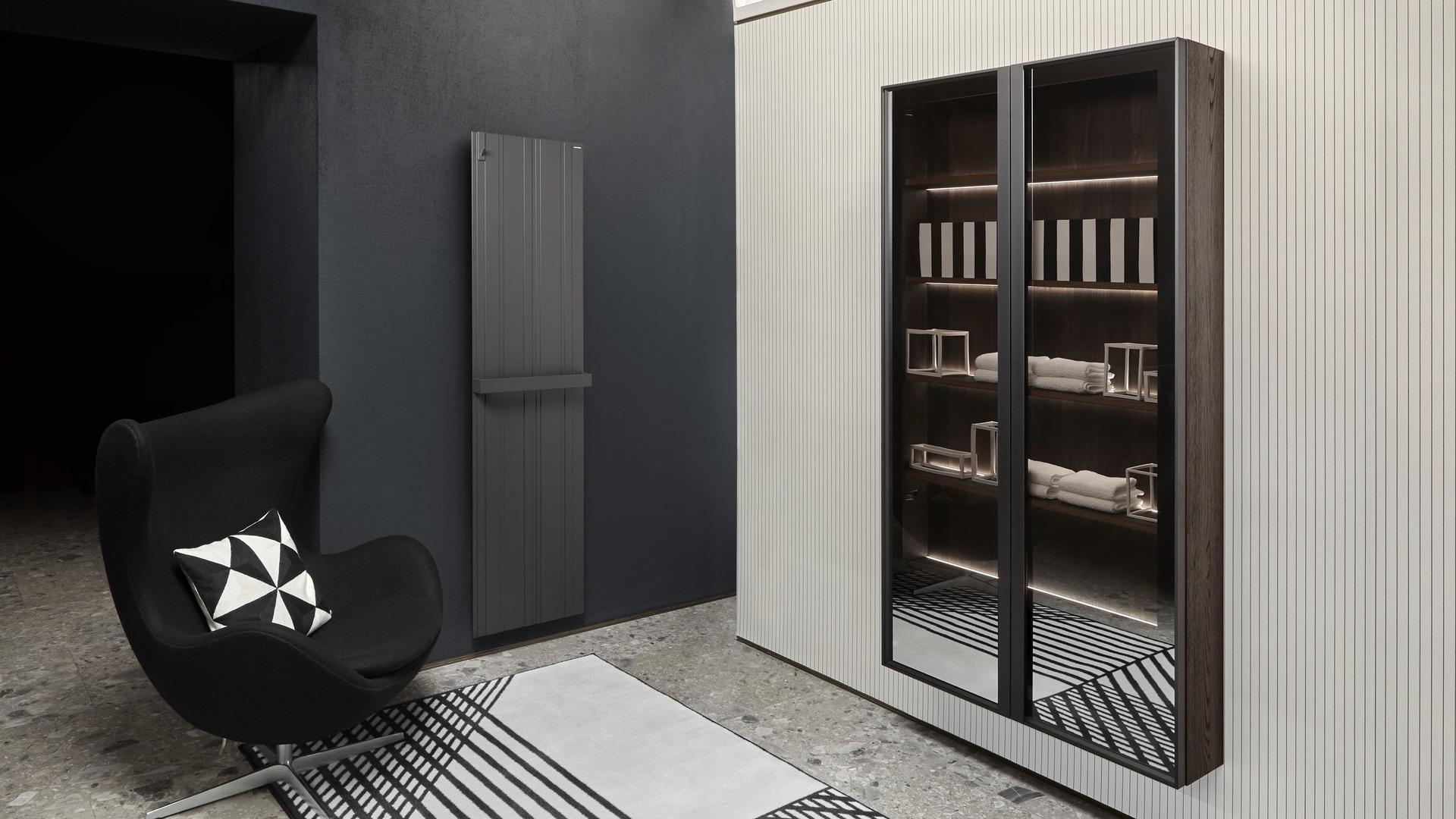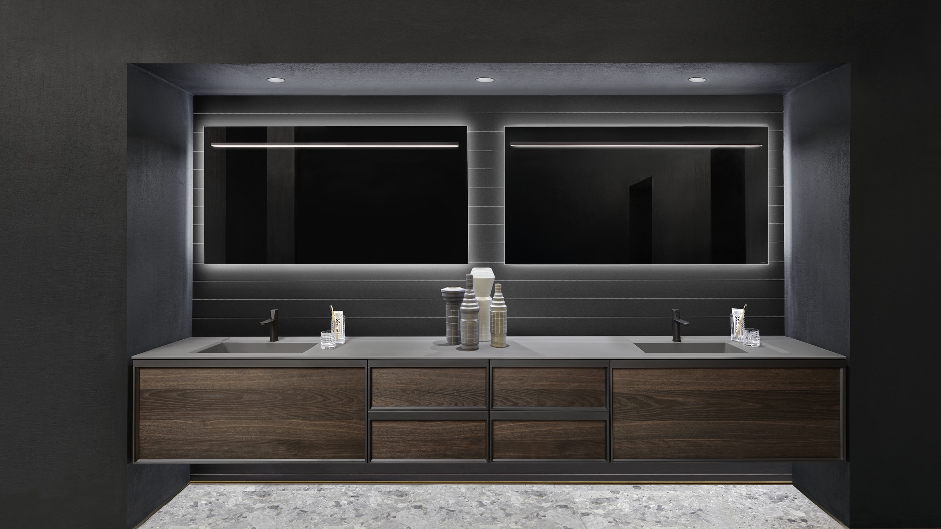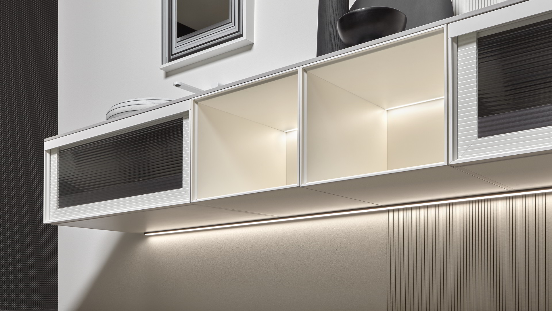Rovere ardesia, with matt black frame, fronts in reflective fumè glass.