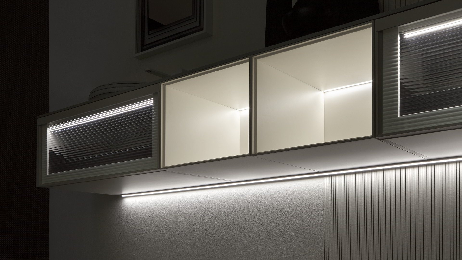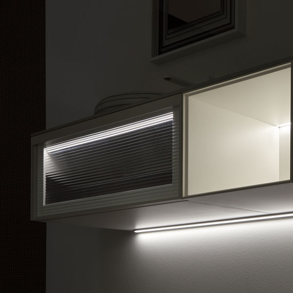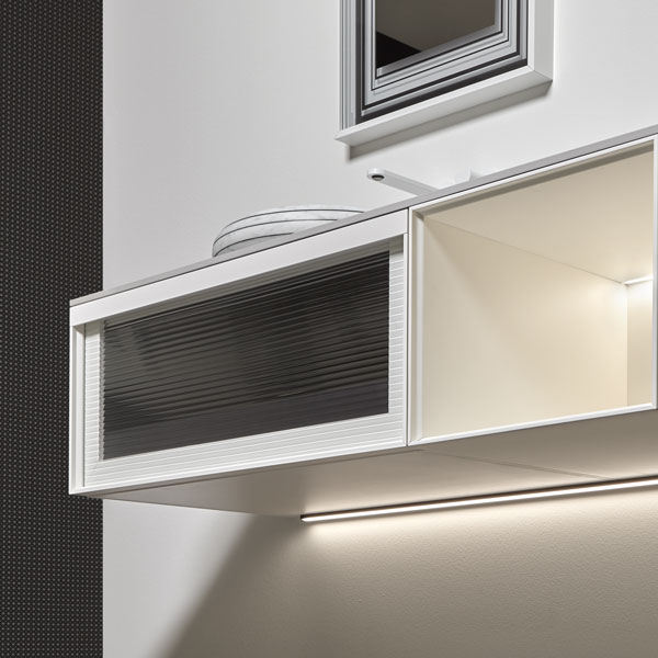 Lacquered embossed white, frame in matt white, fronts in clear ribbed glass; top in Colormood color serena.