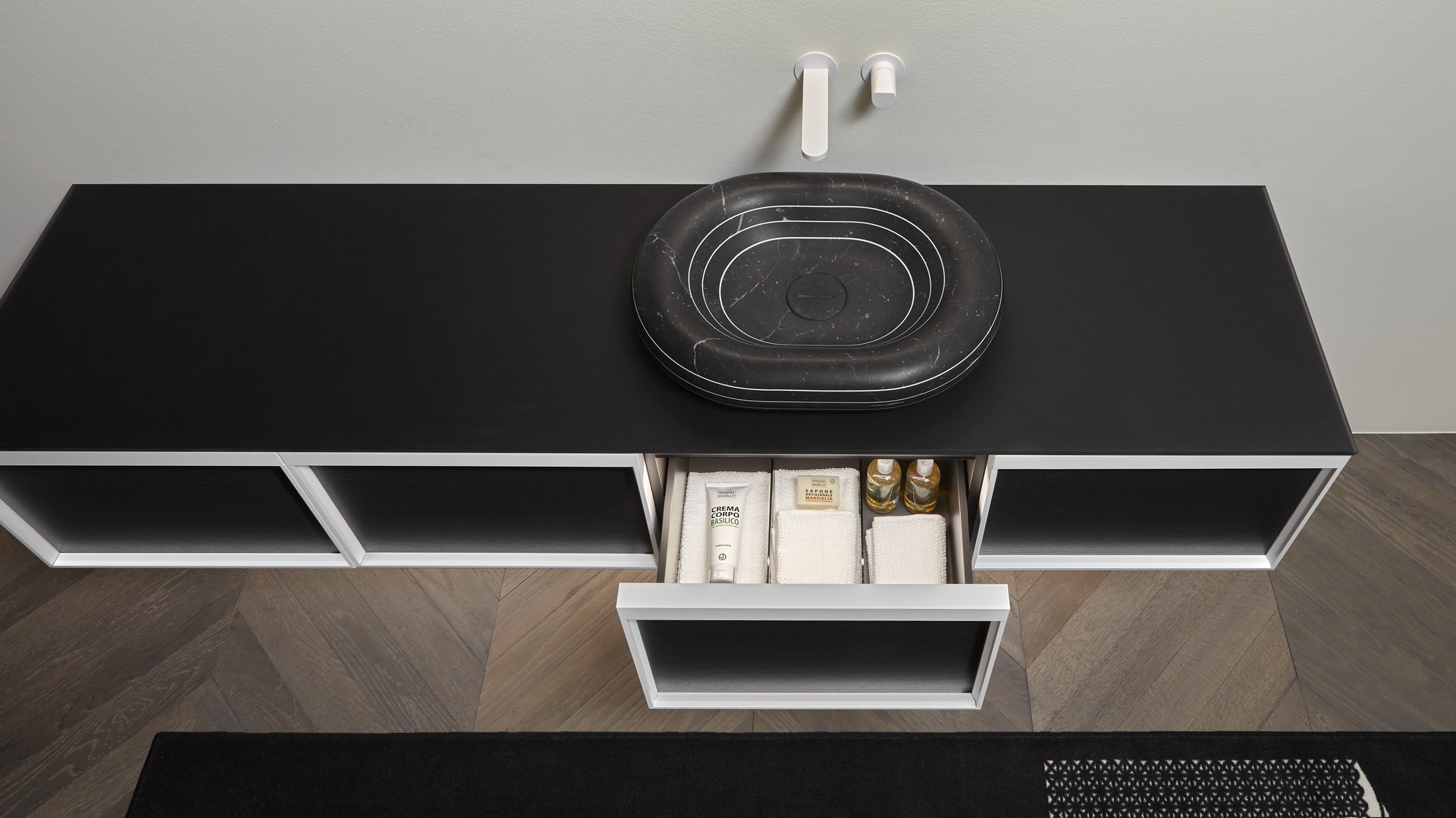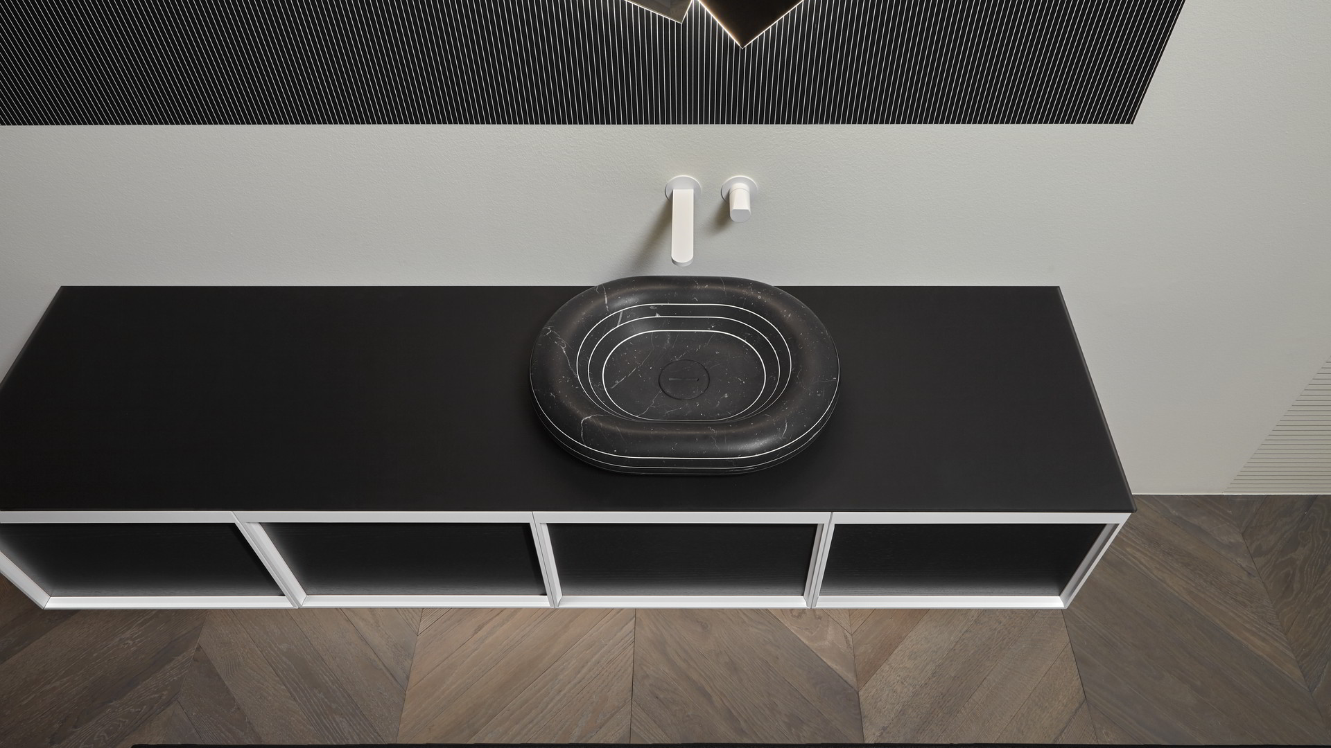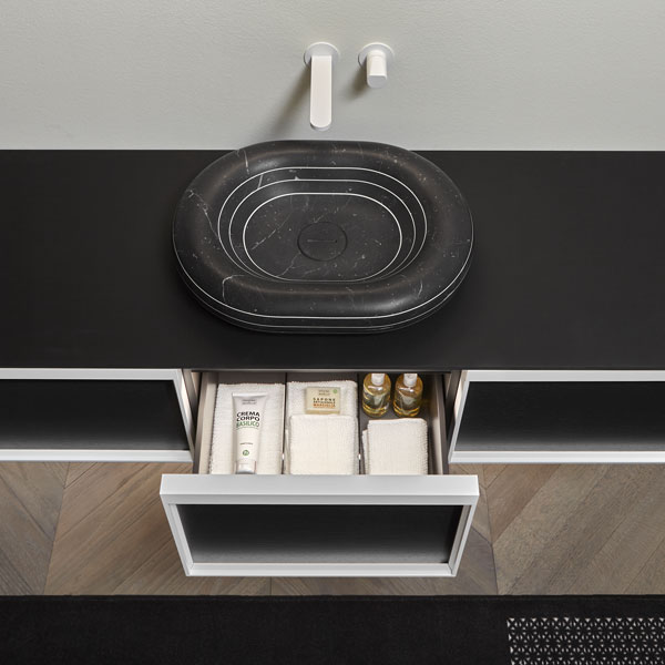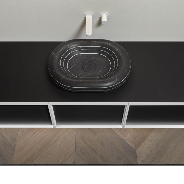 Sink art. Rigati in Nero Marquinia marble, Indigo tap series in matt white.