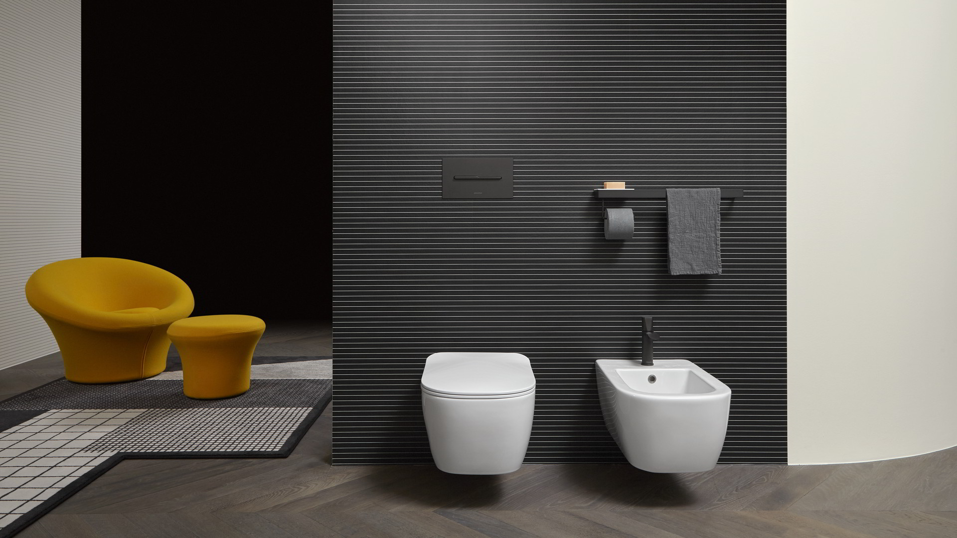 Tralerighe wallpaper art. O2N, Indigo tap series in matt black, flush plate art. Onda matt black.