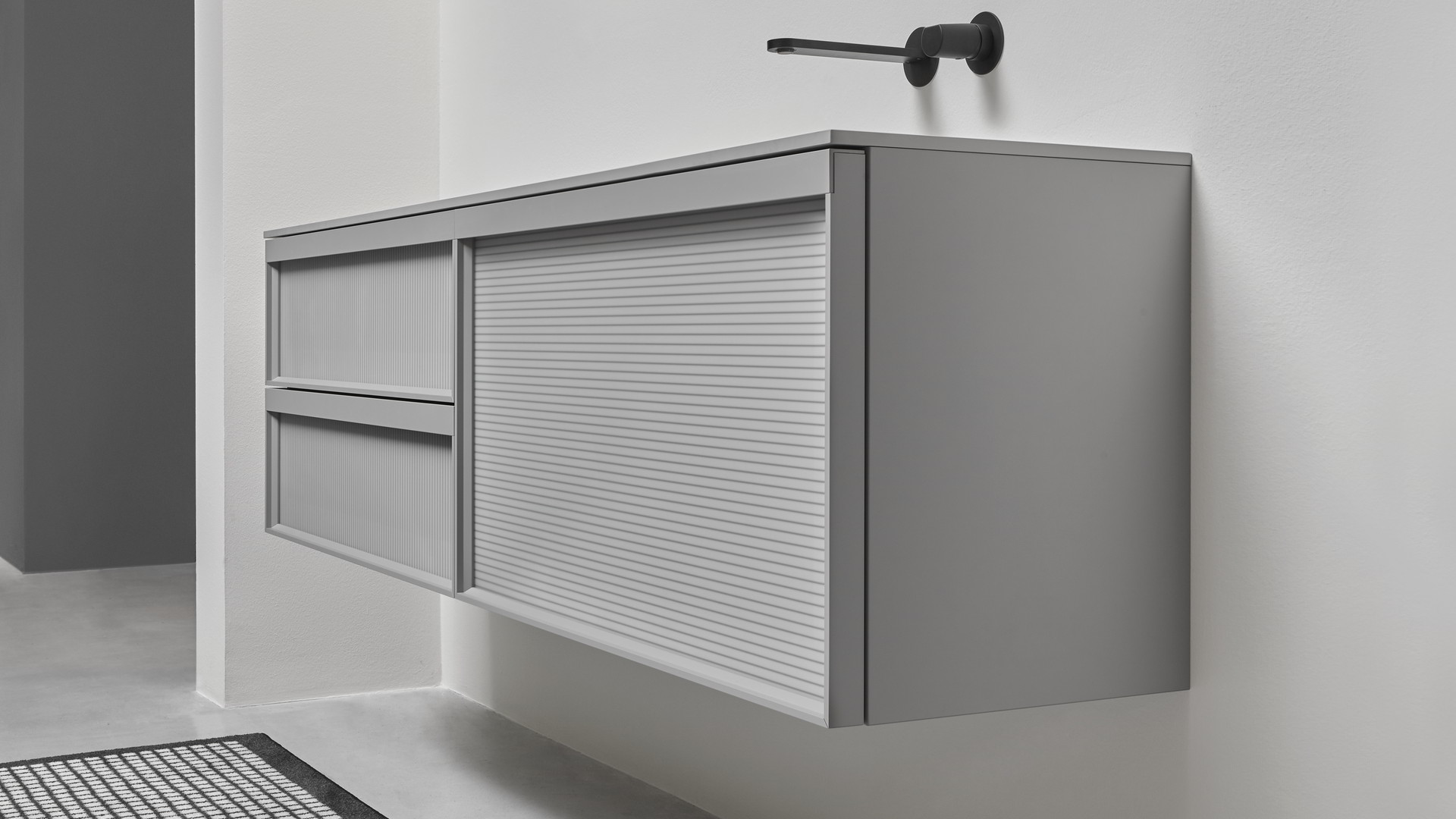 Lacquered embossed grigio smog, frame lacquered grigio smog, fronts in acid etched lacquered grigio smog glass; top in Colormood color serena.