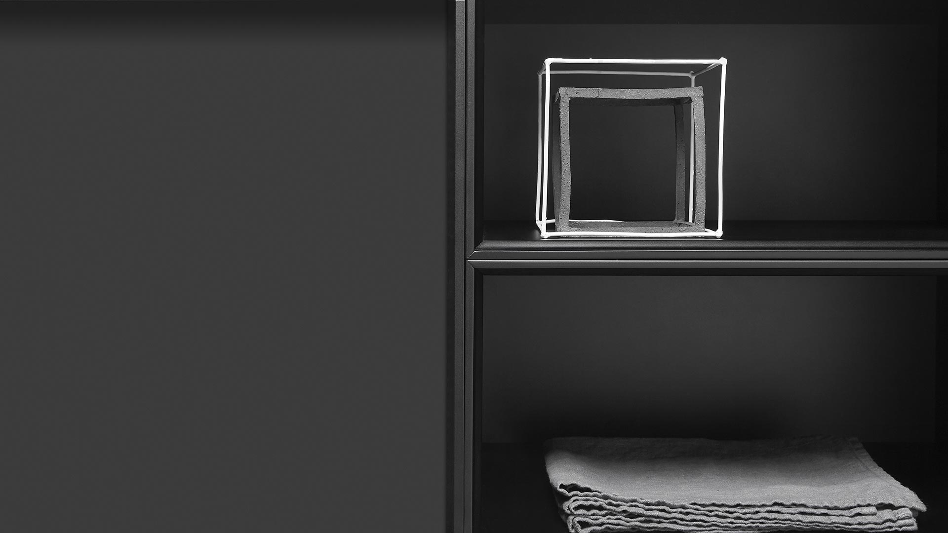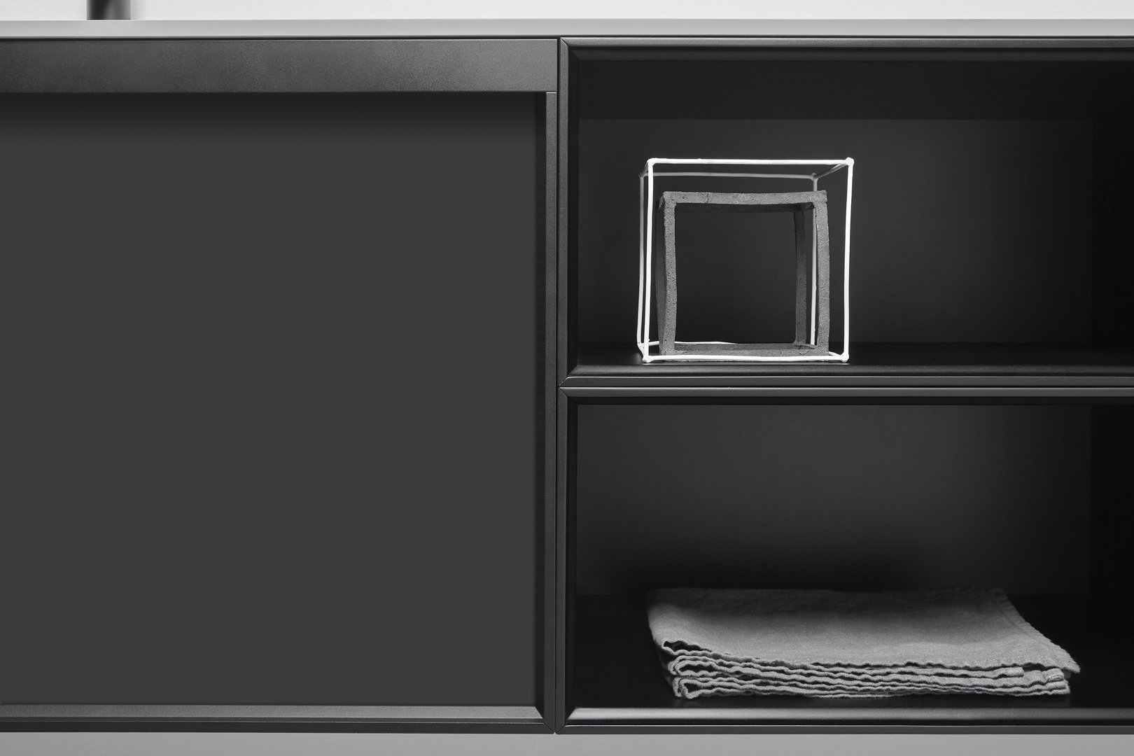 Open cabinets lacquered matt black.