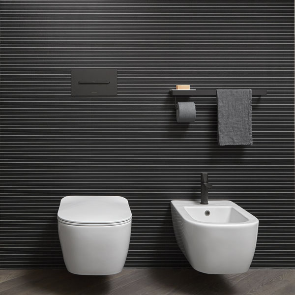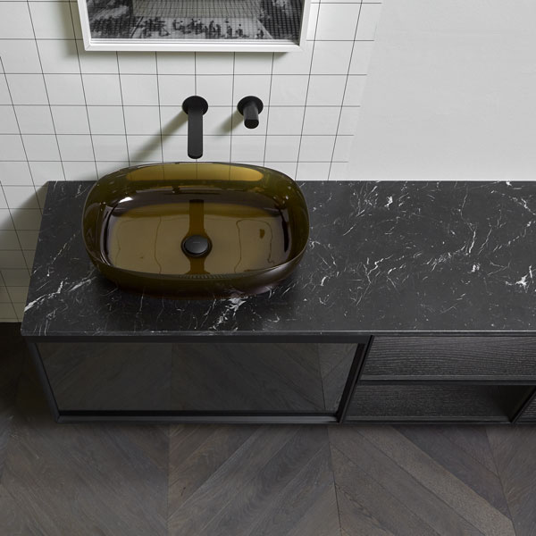 art. Senso sink in Colormood Basalto; Indigo tap series in matt black. Specchidicarta mirror.