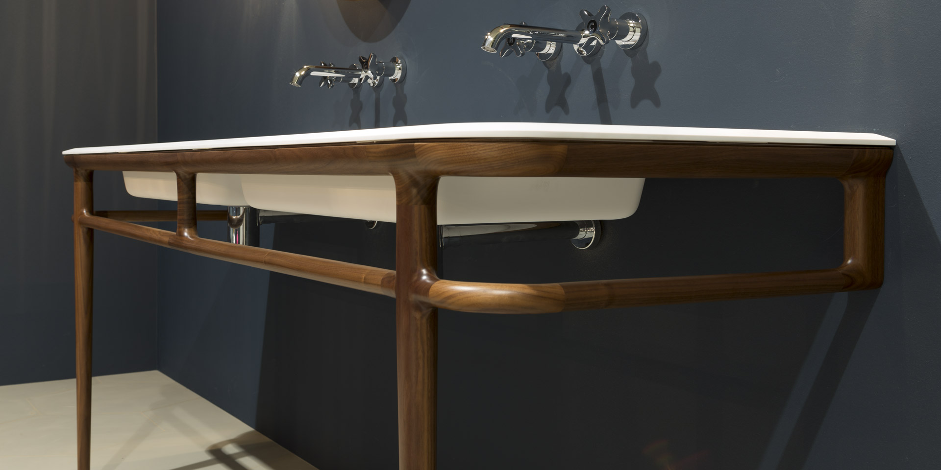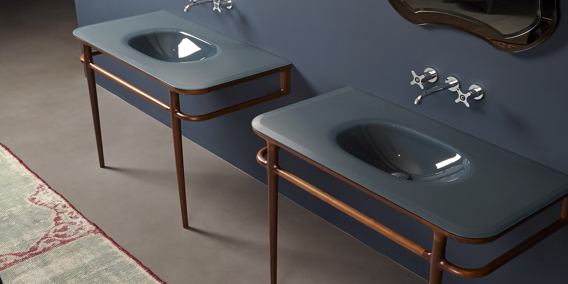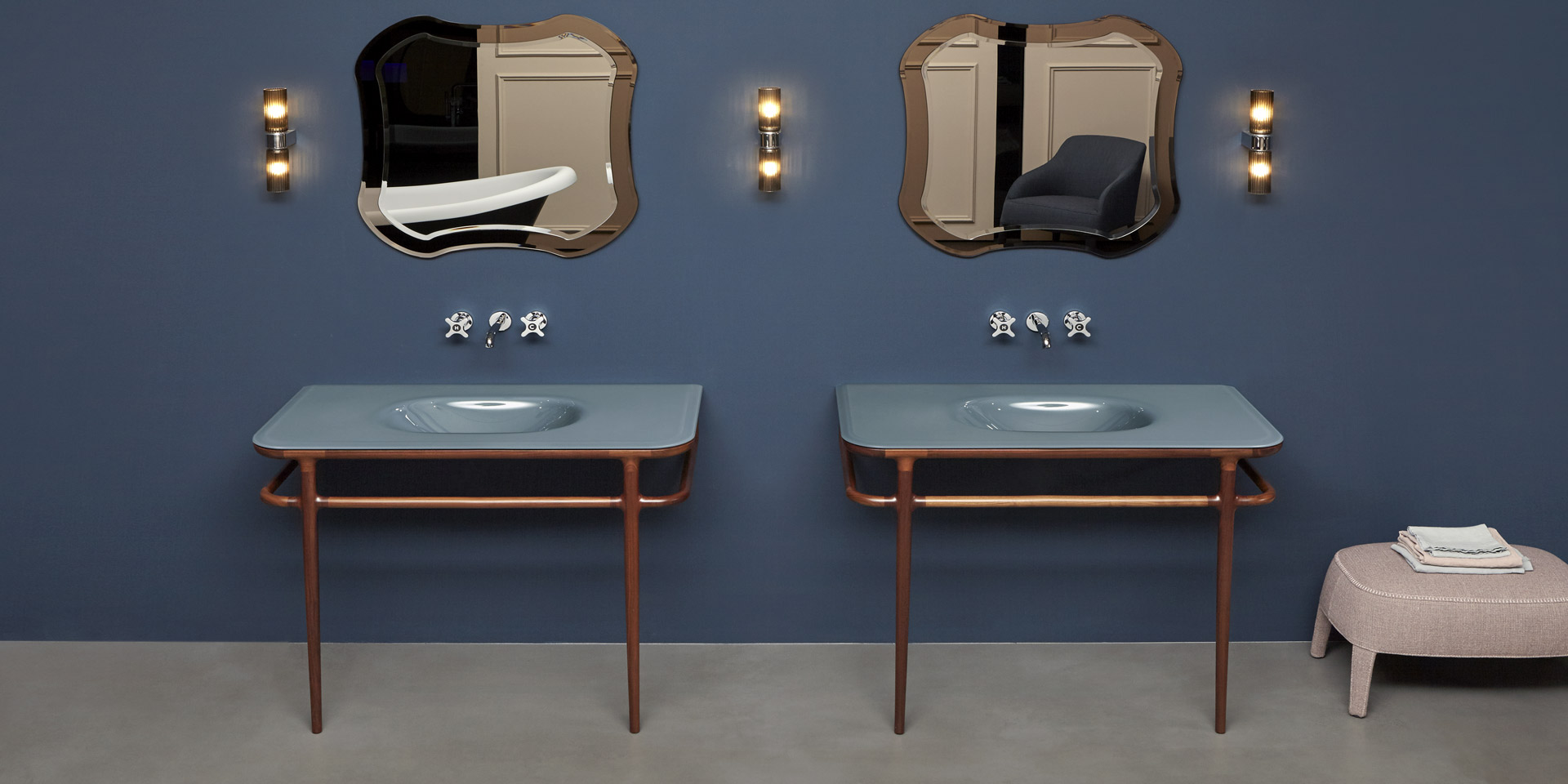 " I thought it would be right to find a link between what we were doing and the past of the company. The mirrors seemed to me the most appropriate element, we decided to redesign and adapt them to current tastes. We designed a family of very large objects, console and American walnut furniture, of various sizes, faucets, toilet and bidet, bath and shower with legs decorated glass, one full bathroom scene "