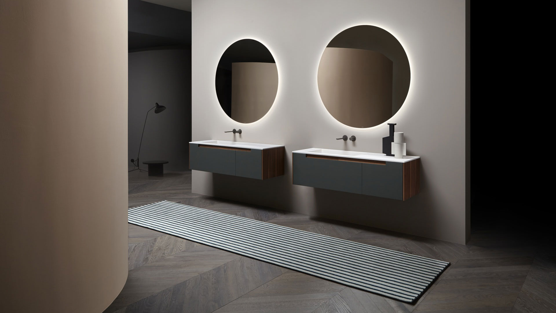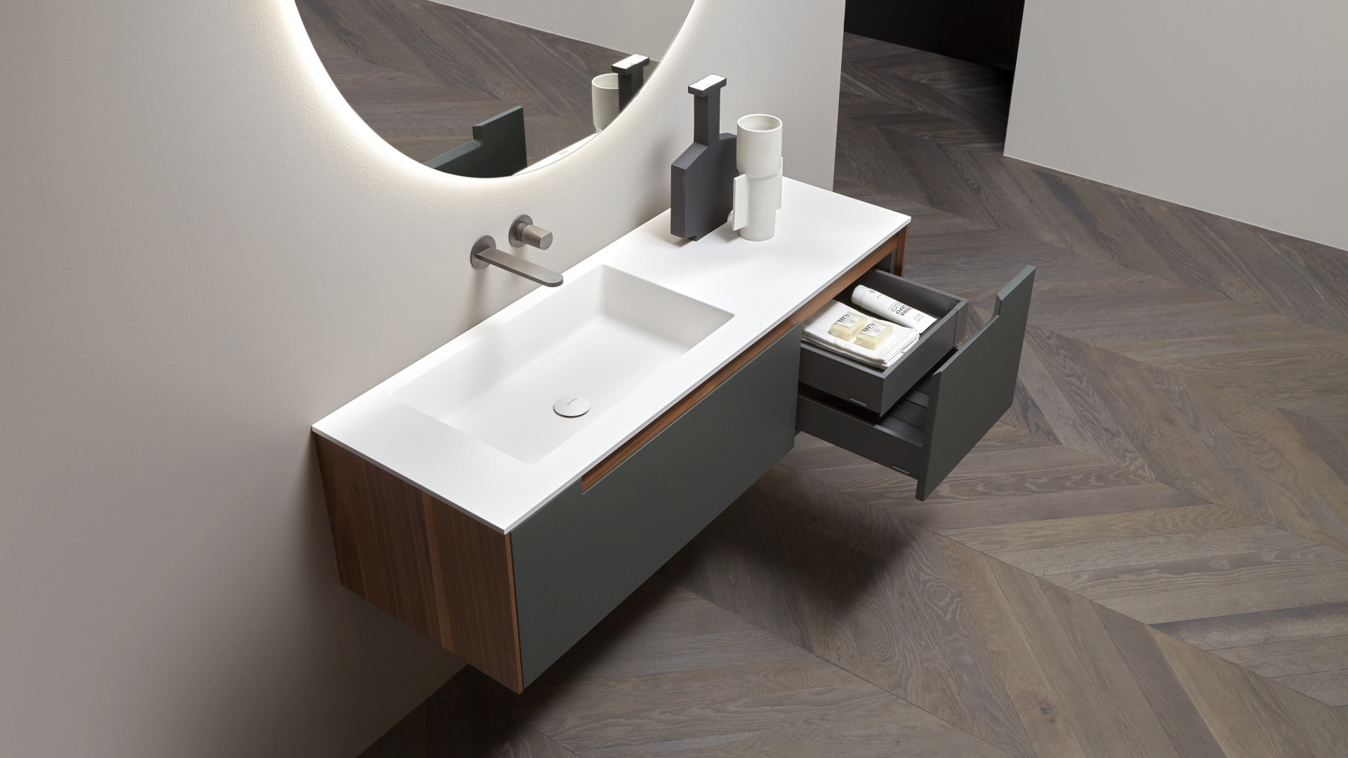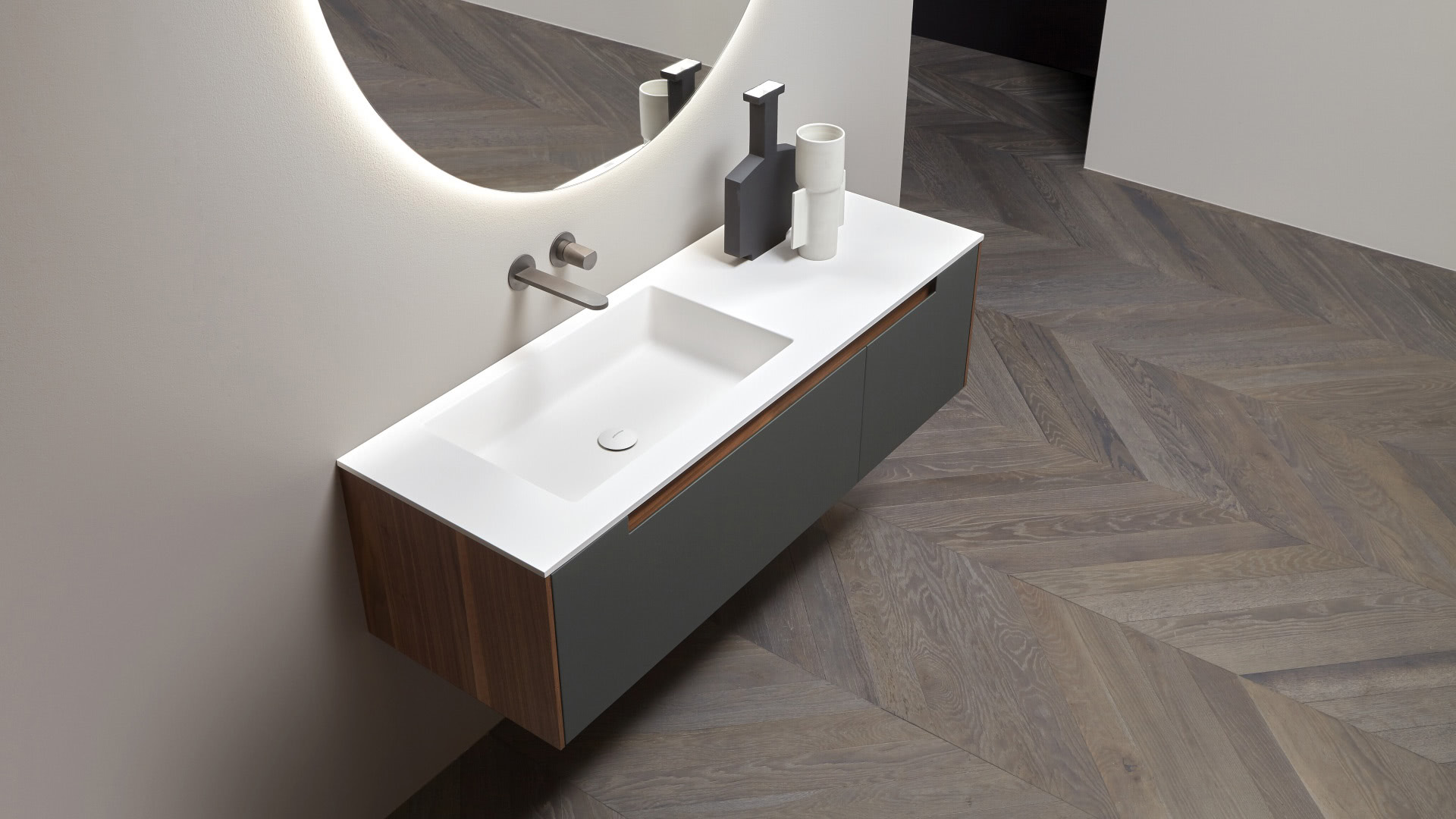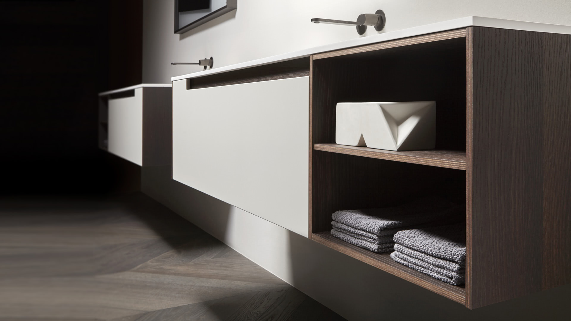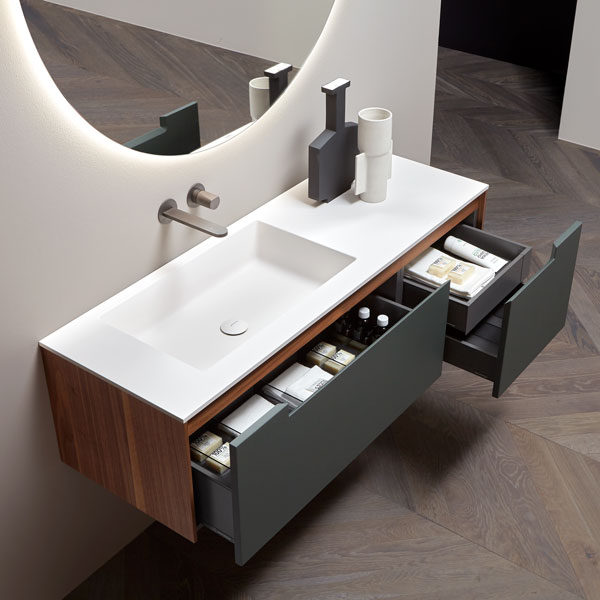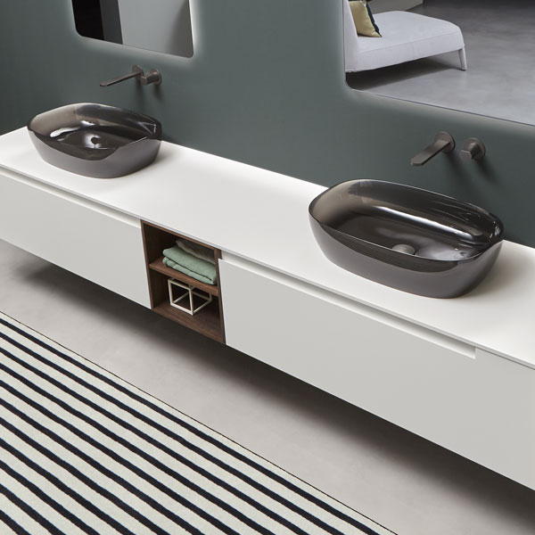 A pure and timeless collection, a simple geometric shape with rigorous and essential structure embellished by the quality of the finishes and materials used. A refined color range and identifying trait of the handle integrated into the door. Orma is a concrete collection, a series of furniture made from a "core" in laminated support, and an external "skin" in wood, lacquered or with possible coverings with other materials. A construction technique that leaves room for numerous custom possibilities and combinations of materials and textures for both the doors and the structures, as well as open compartments, drawers and containers.