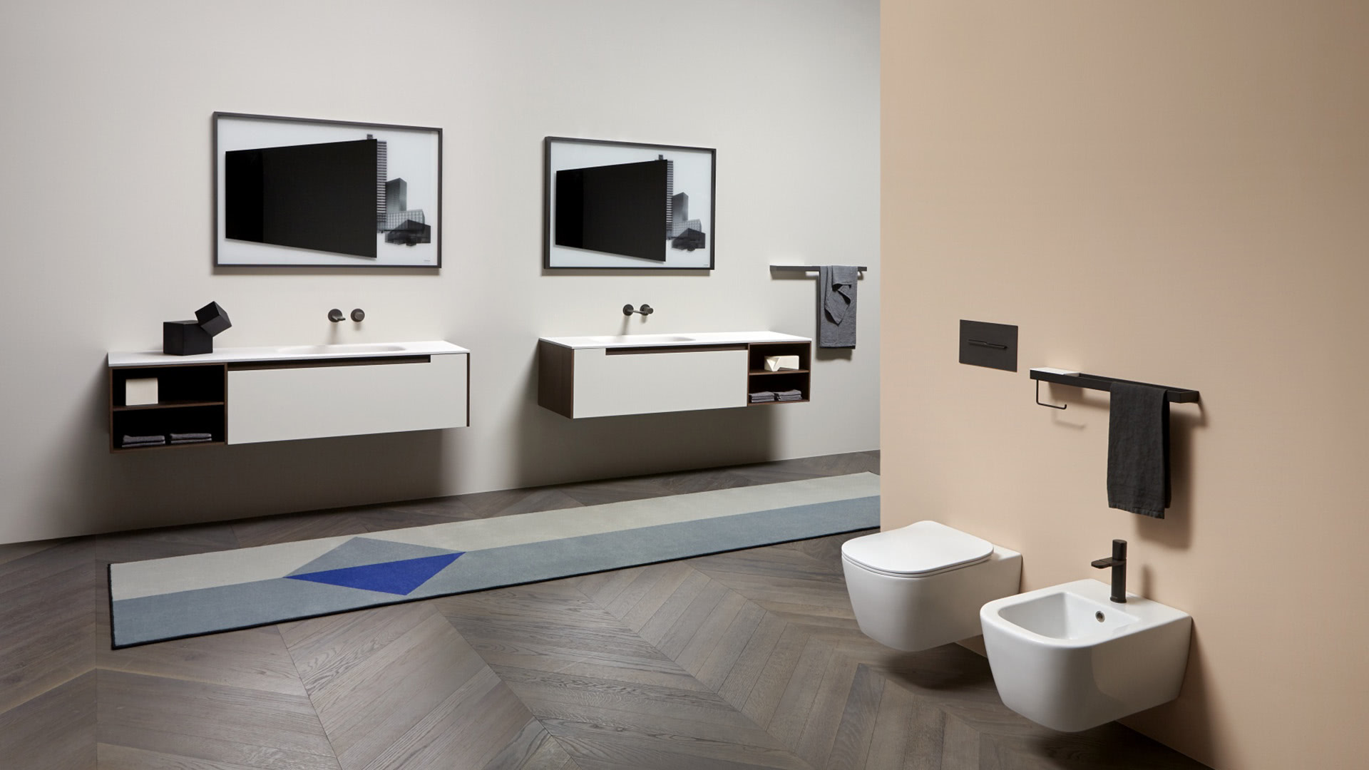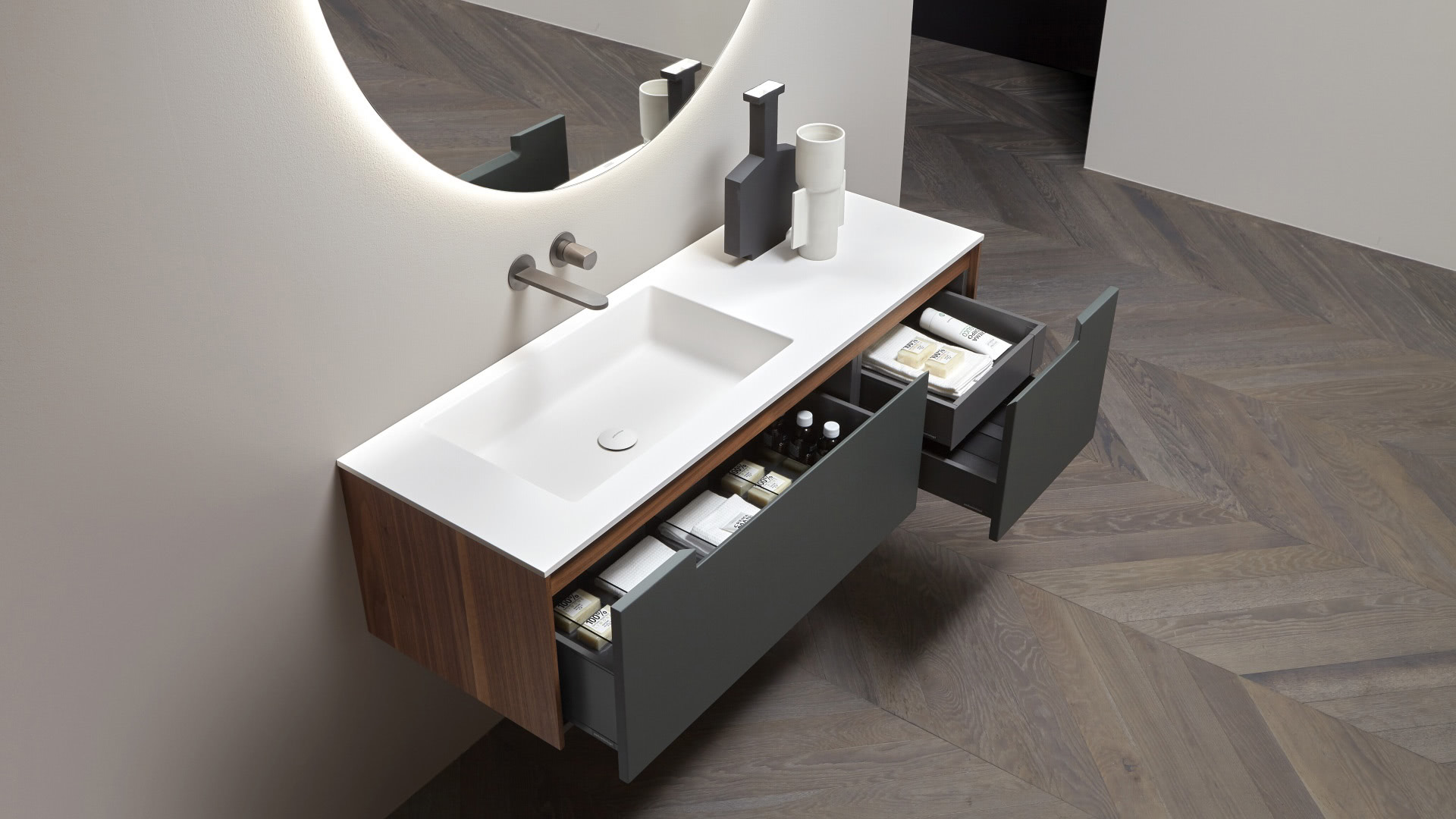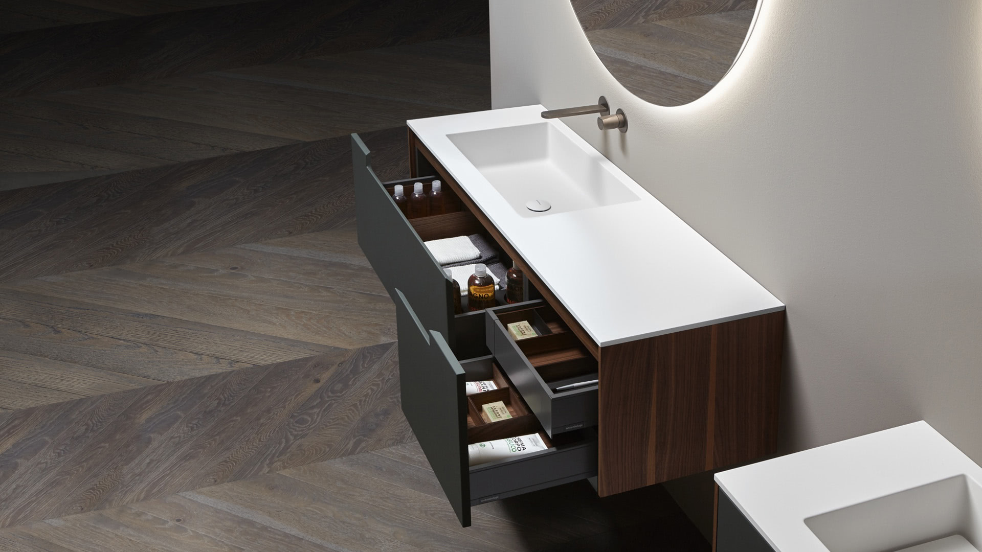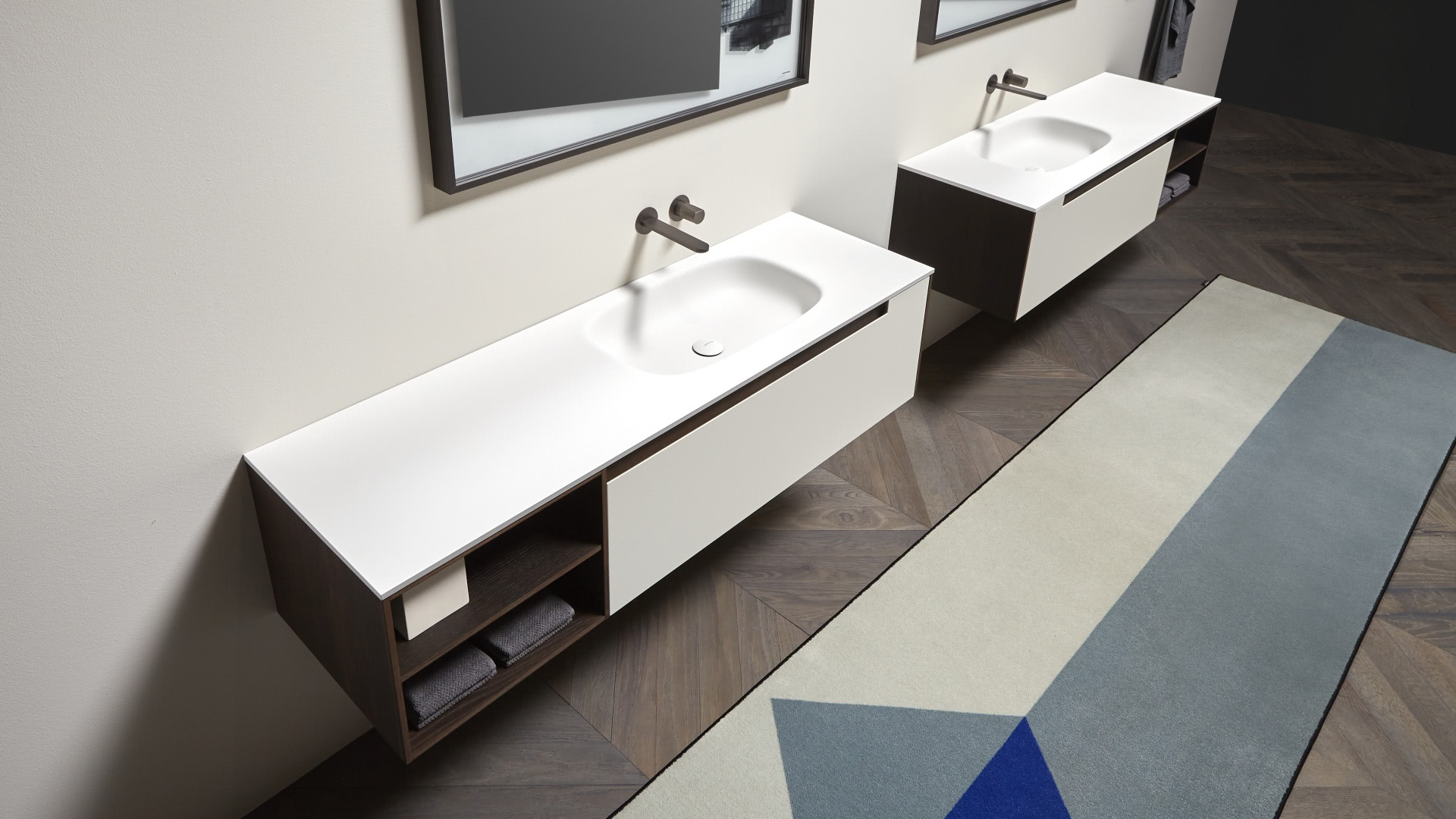 A pure and timeless collection, a simple geometric shape with rigorous and essential structure embellished by the quality of the finishes and materials used. A refined color range and identifying trait of the handle integrated into the door. Orma is a concrete collection, a series of furniture made from a "core" in laminated support, and an external "skin" in wood, lacquered or with possible coverings with other materials. A construction technique that leaves room for numerous custom possibilities and combinations of materials and textures for both the doors and the structures, as well as open compartments, drawers and containers.