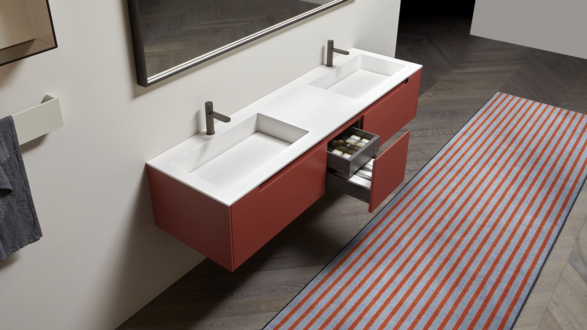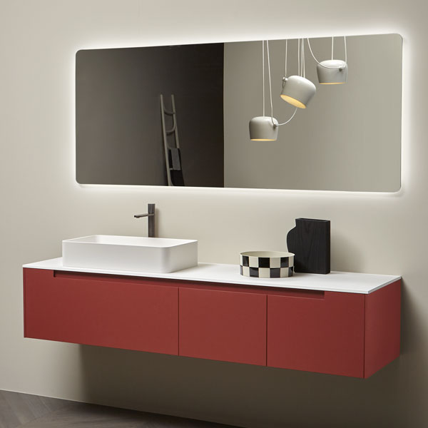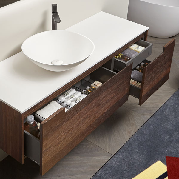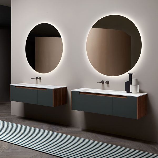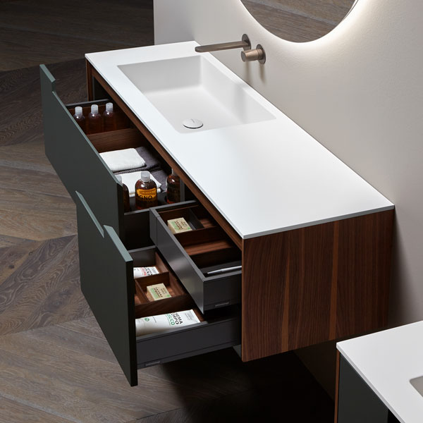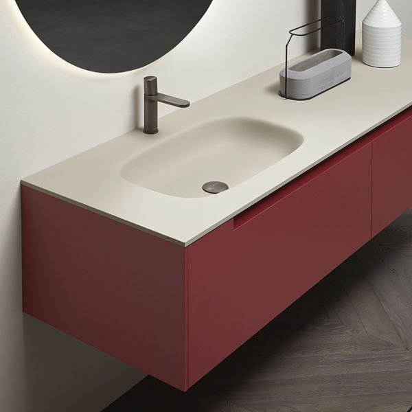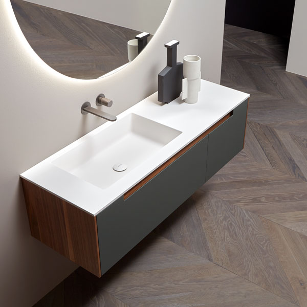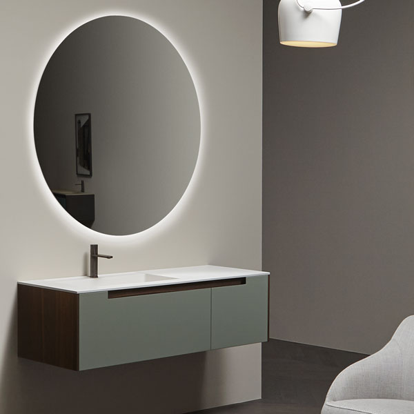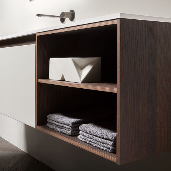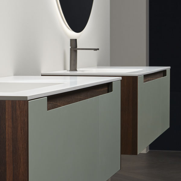 The handle is the highlight of the collection, precisely the mark. A distinctive sign, which is revealed in the cabinets placed at the end of the composition for which the handle is milled up to a third of the door, while that of the central cabinets are milled over the entire width. The result is a continuous groove that develops along the entire width of the piece of furniture and when opened gives the whole a characteristic feature that enhances the technical excellence of the workmanship and details.