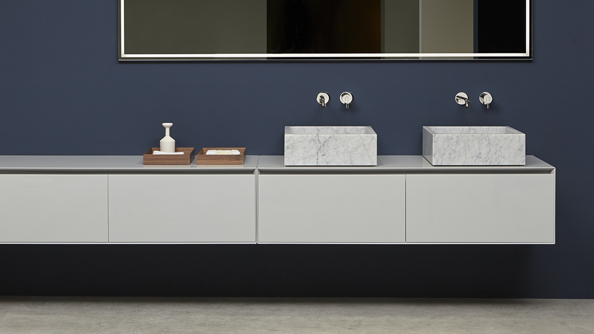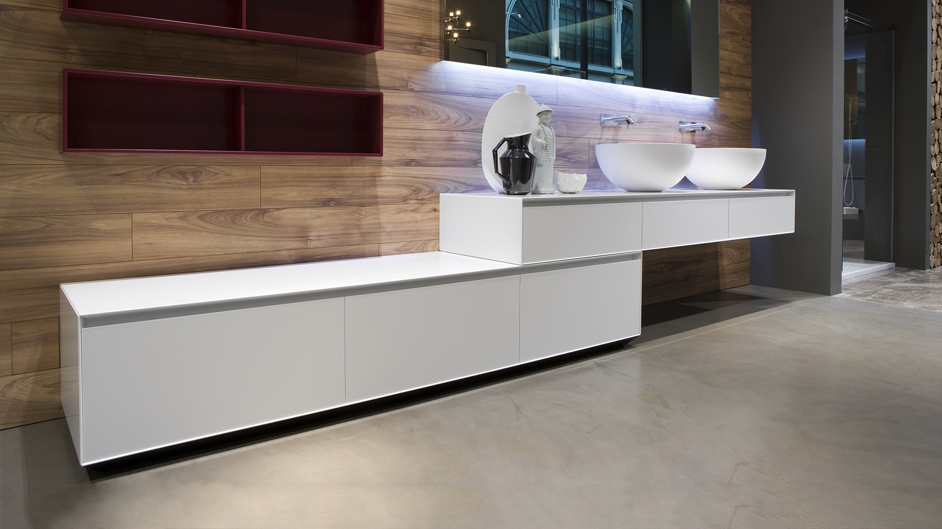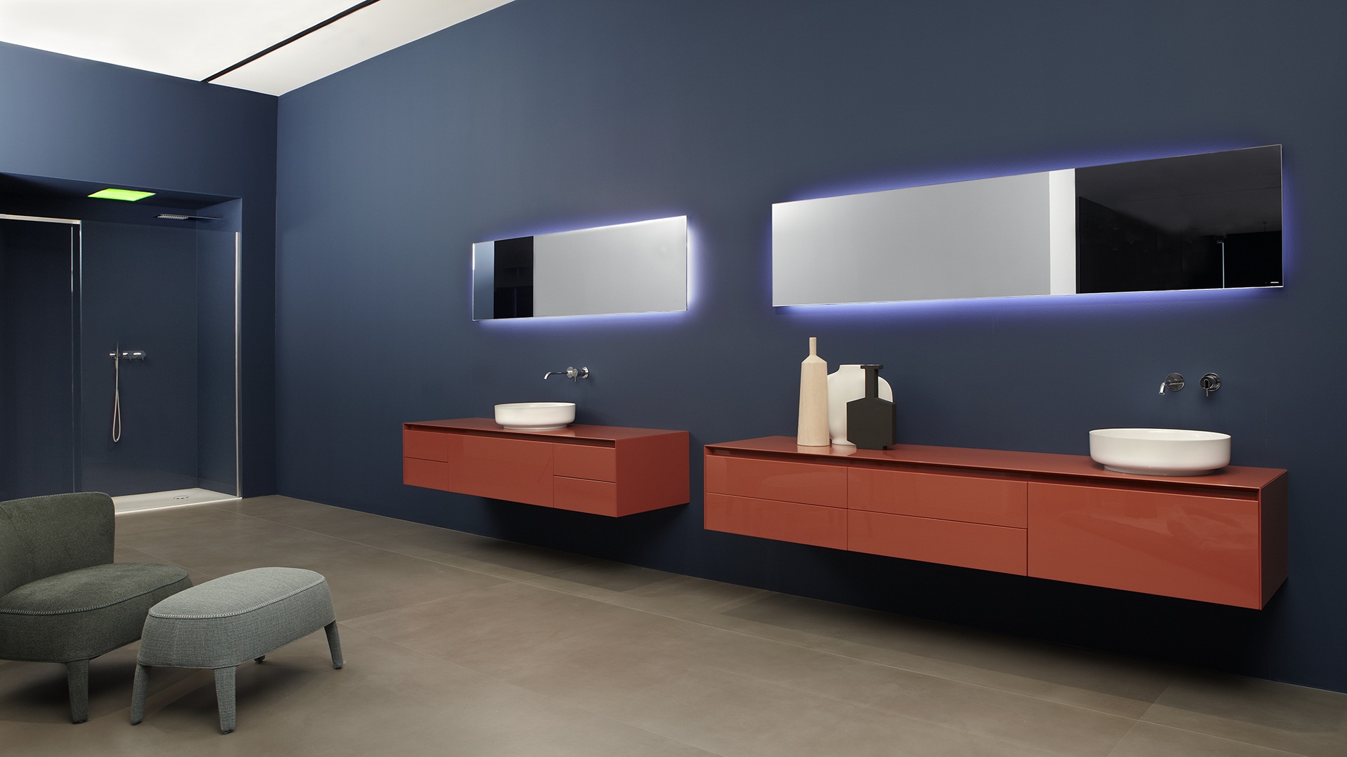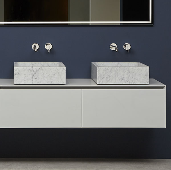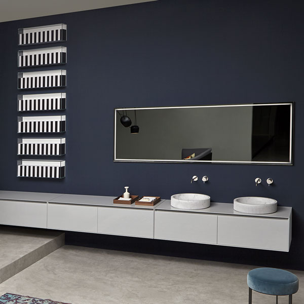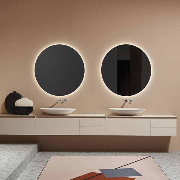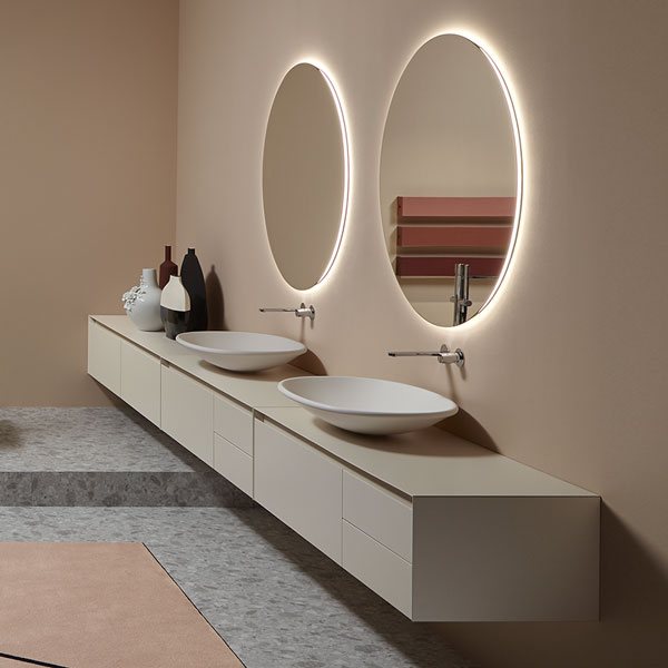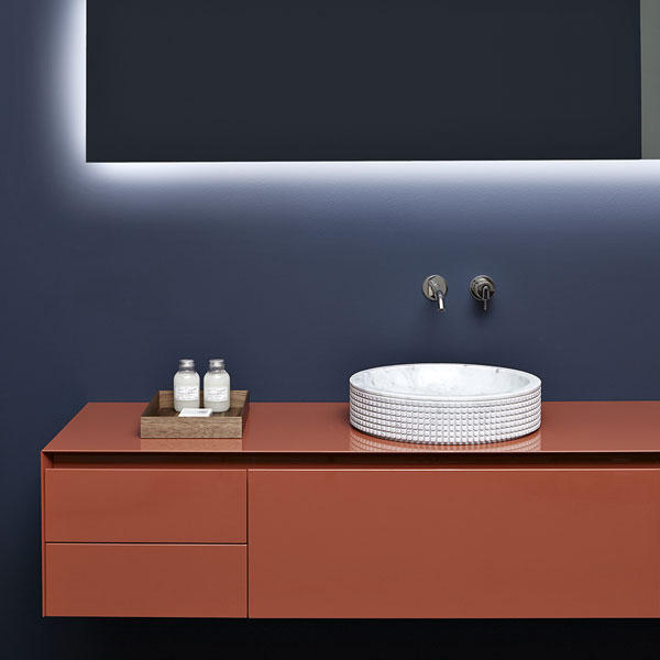 The preciousness of the woods, warmth from the most sought after materials, the perfect uniformity : matter becomes design with Panta Rei, The quality of each element is put in the service of the overall image, dialogue with the shapes of the washbasins, the ability to interpret the space, the desire to define a bath environment without borders.