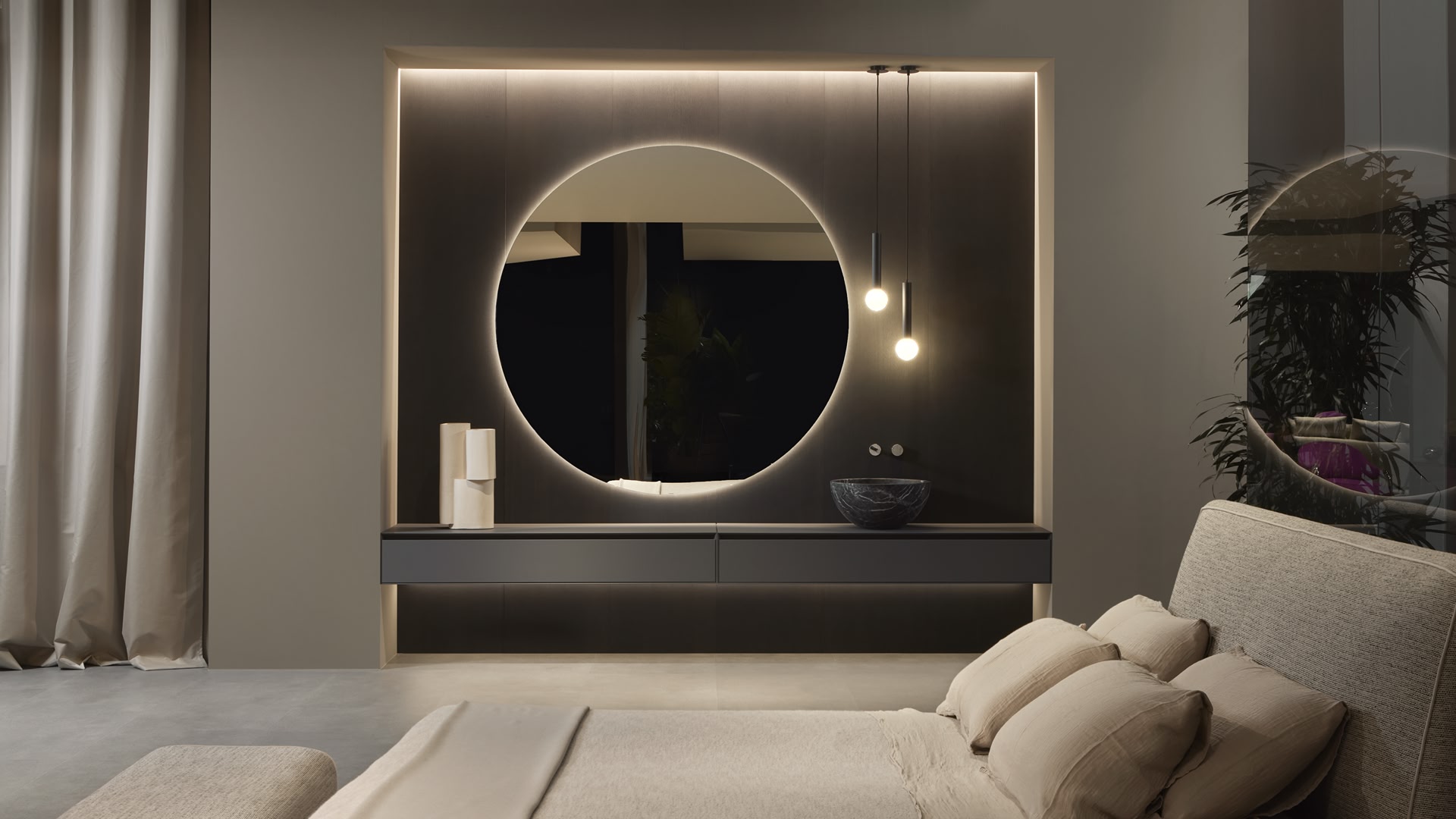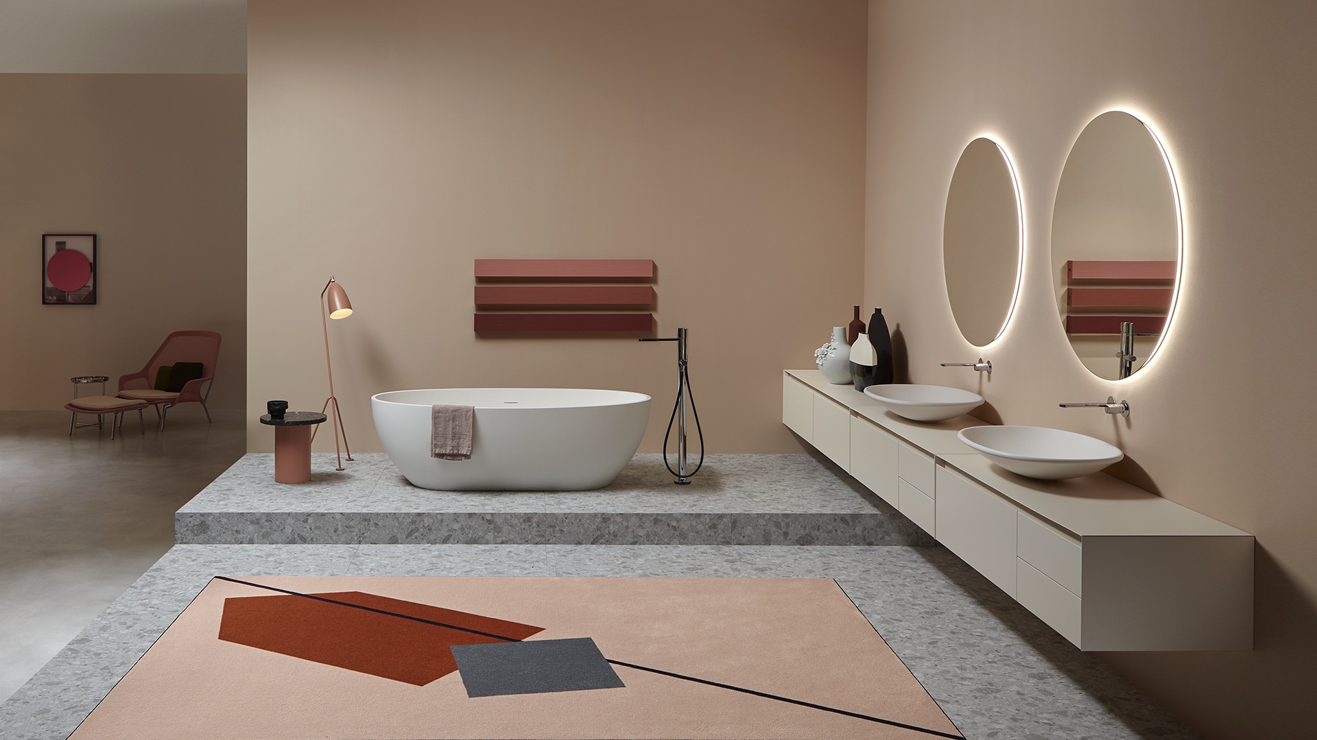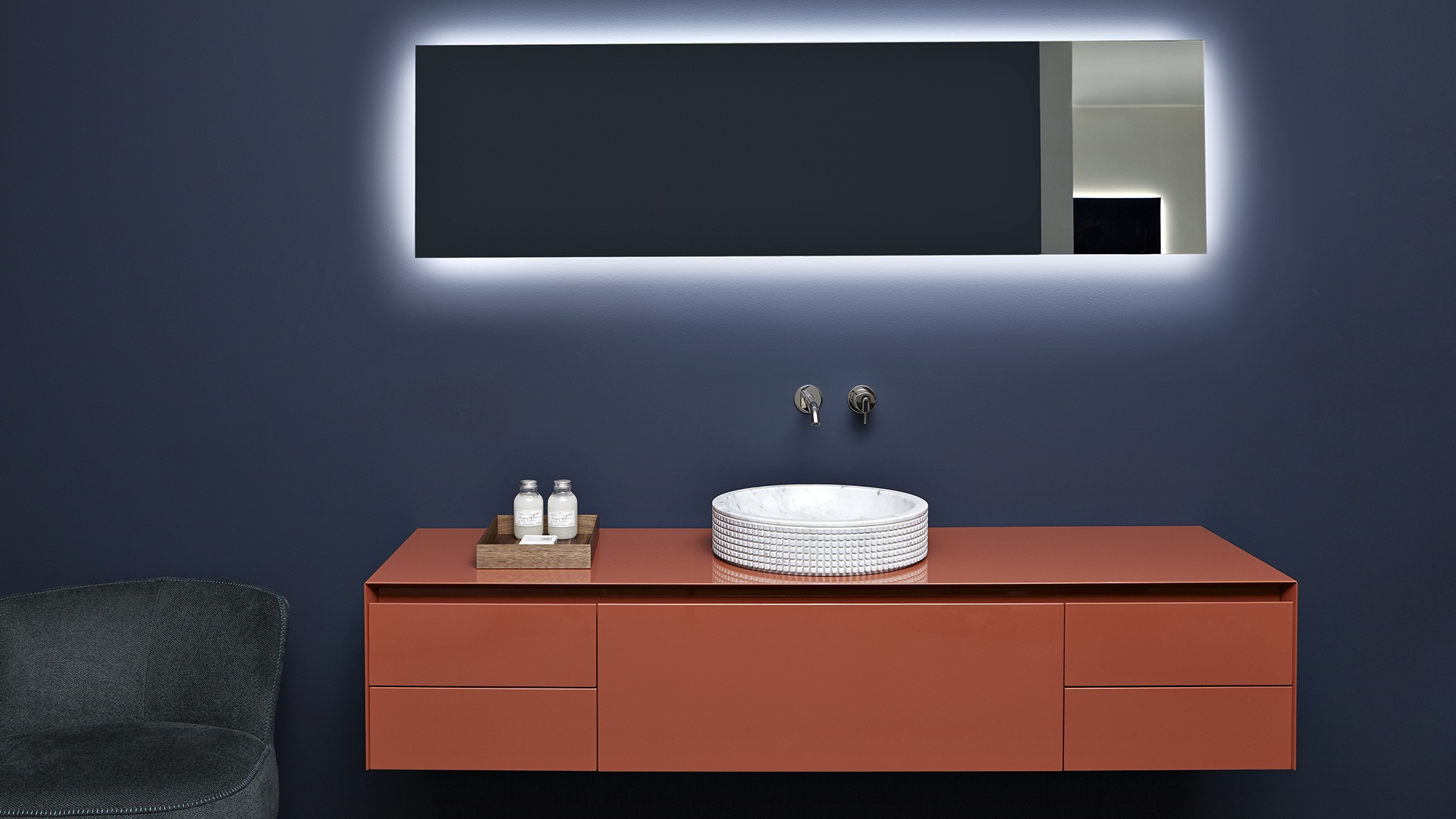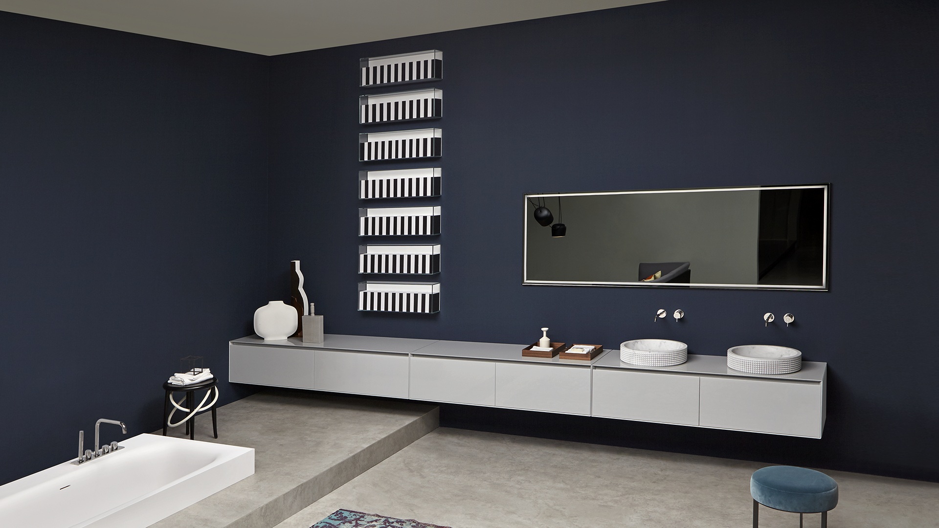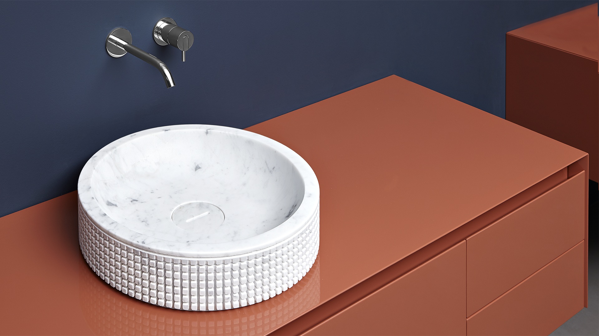 The preciousness of the woods, warmth from the most sought after materials, the perfect uniformity : matter becomes design with Panta Rei, The quality of each element is put in the service of the overall image, dialogue with the shapes of the washbasins, the ability to interpret the space, the desire to define a bath environment without borders.