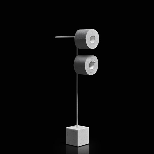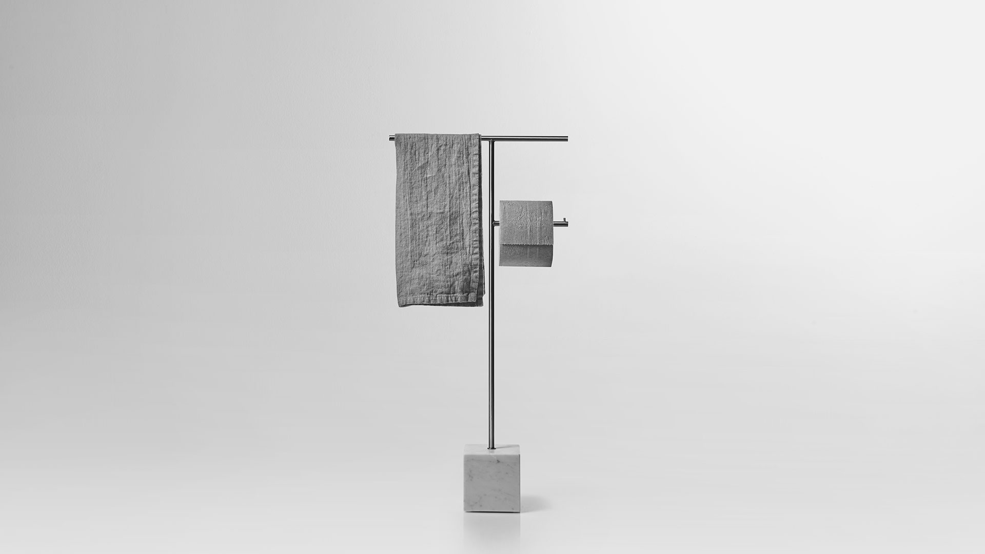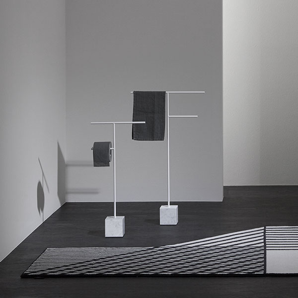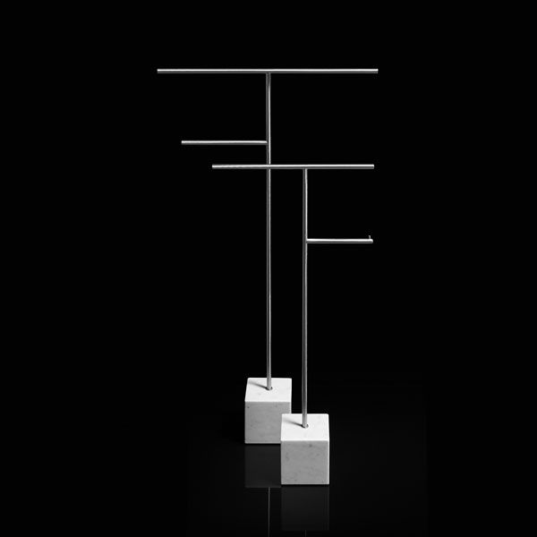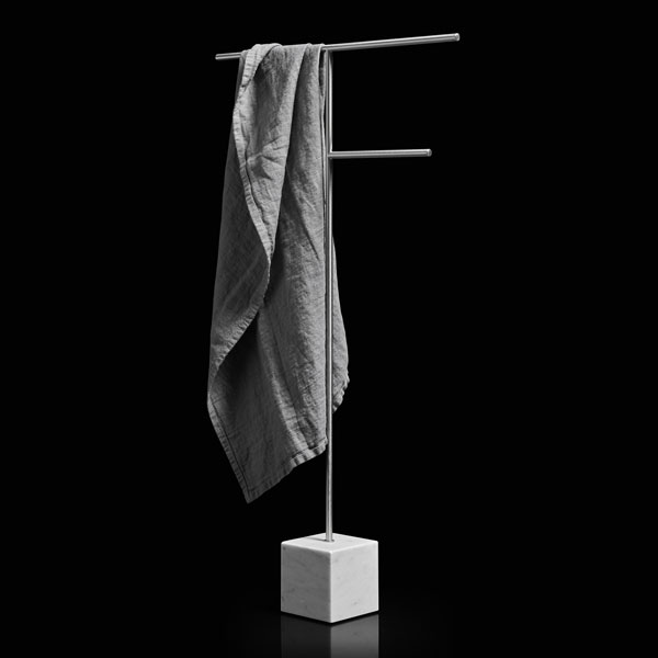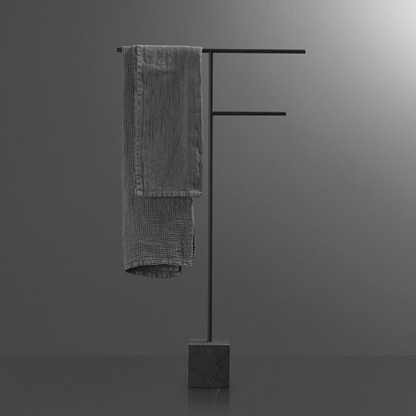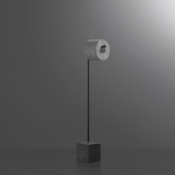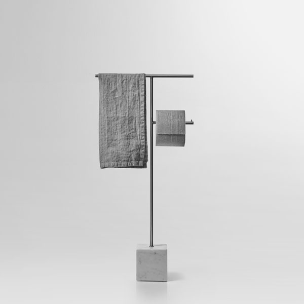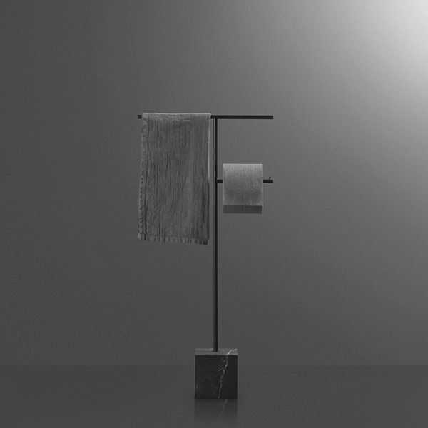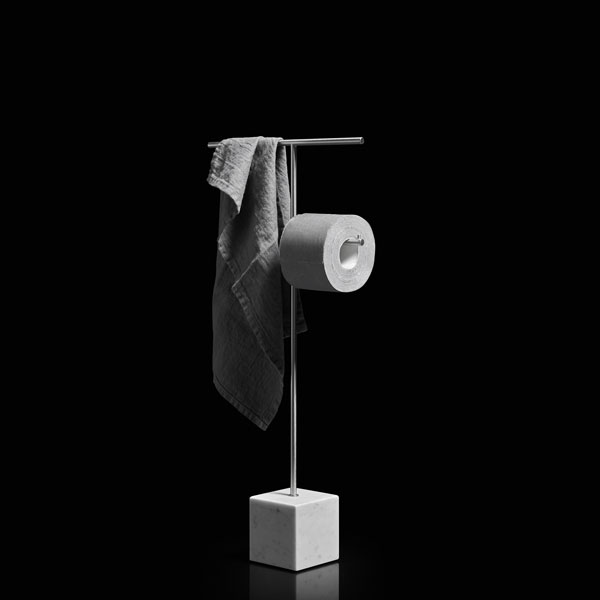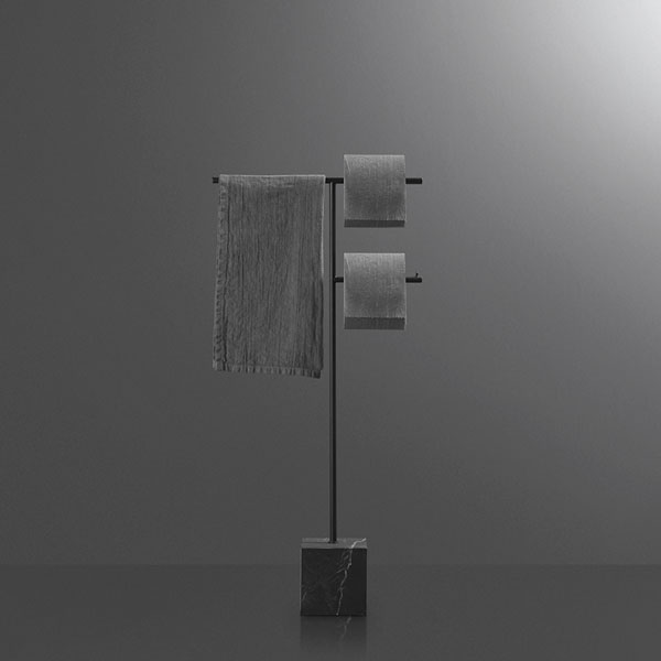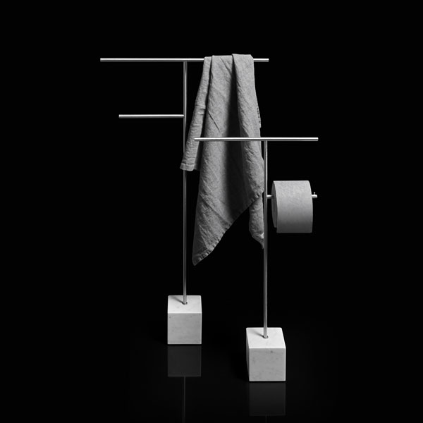 The freestanding accessories Bivio bring material and design excellence in the bathroom accessories, as it is in antoniolupi's mission. The cubic base in Carrara Marble or Nero Marquinia refers to the precious heritage of the earth, the metal structure in brass, available in satin steel, polished chrome, matt white or embossed colors, rises to branch out and house towels or paper rolls. Solid but at the same time ethereal, the accessories best describe the company's design approach and the obsessive attention to every detail that becomes a distinctive feature of a style, even through apparently simpler projects.