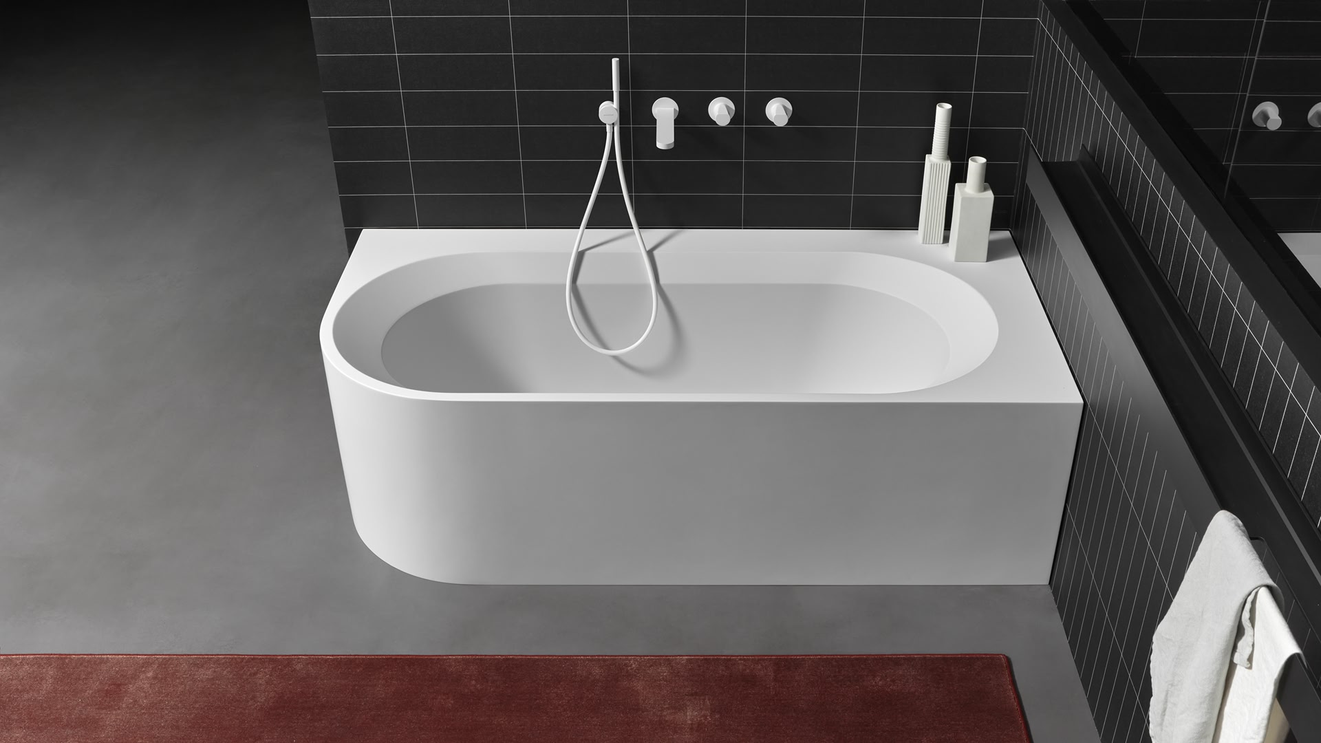 A velvety soft-touch material capable of transmitting unique sensations in contact with the body. A contemporary shape, rigorous but organic at the same time, with edges that slope toward the center and envelop the body, inviting you to immerse yourself to completely regenerate. A project that can be declined in different shapes and types, able to fit within bathroom environments of different sizes to attract attention, in the freestanding version or solve a space problem, in the niche or corner installation.