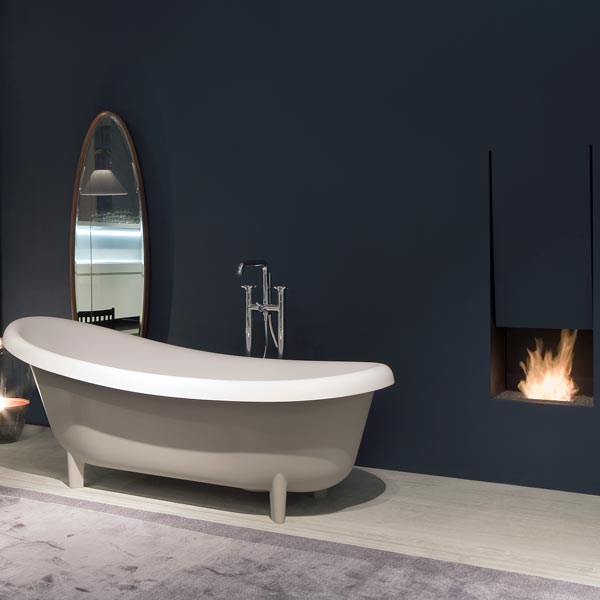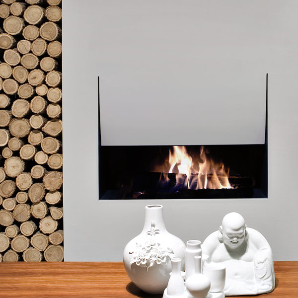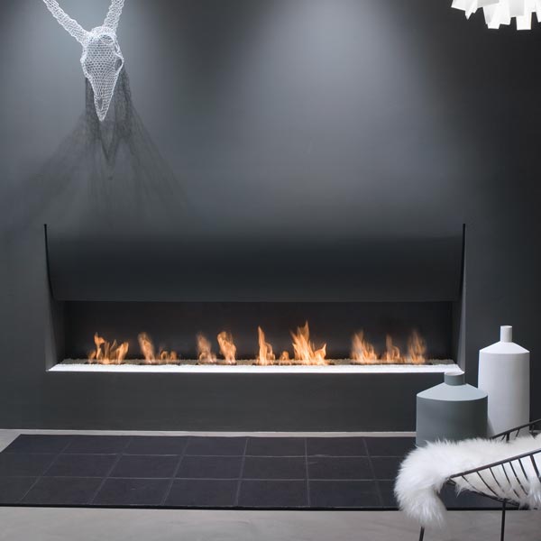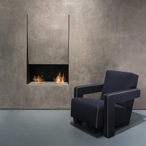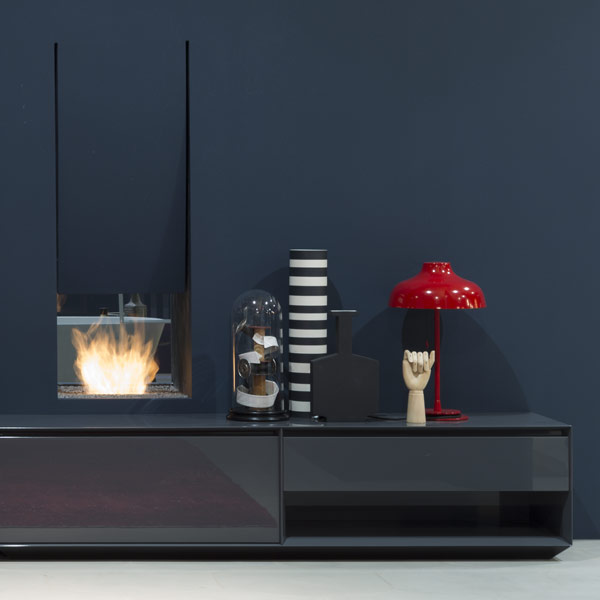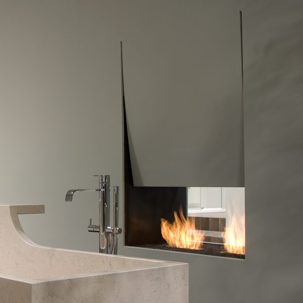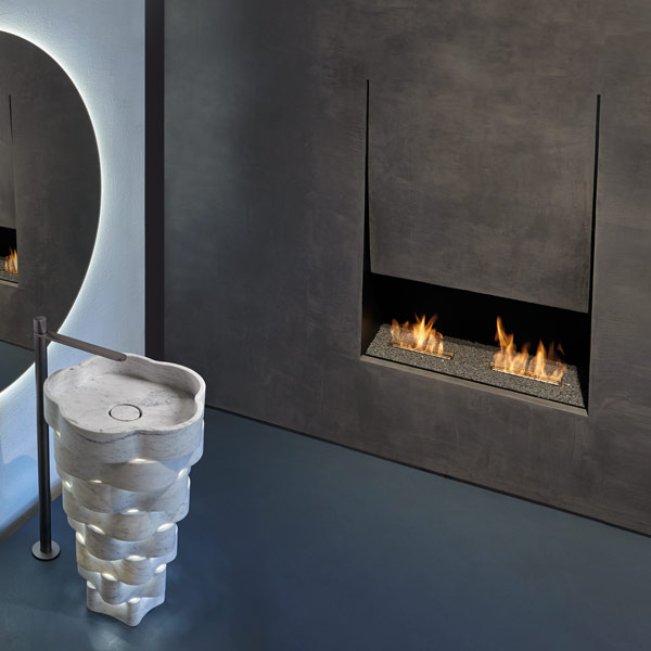 This fireplace perfectly integrates in the wall, with its colors, finishes and textures. Il Canto del Fuoco explores the third dimension with a clean sharp cut and a constant movement of the surfaces that confers dynamism to the whole configuration. The bending surface like a folded sheet of paper is pulling back introducing at its end the place where fire is. It can be produced as custom made integrated in the wall fireplace becoming an architectural element. Its design contributes to create a dynamic warm atmosphere.