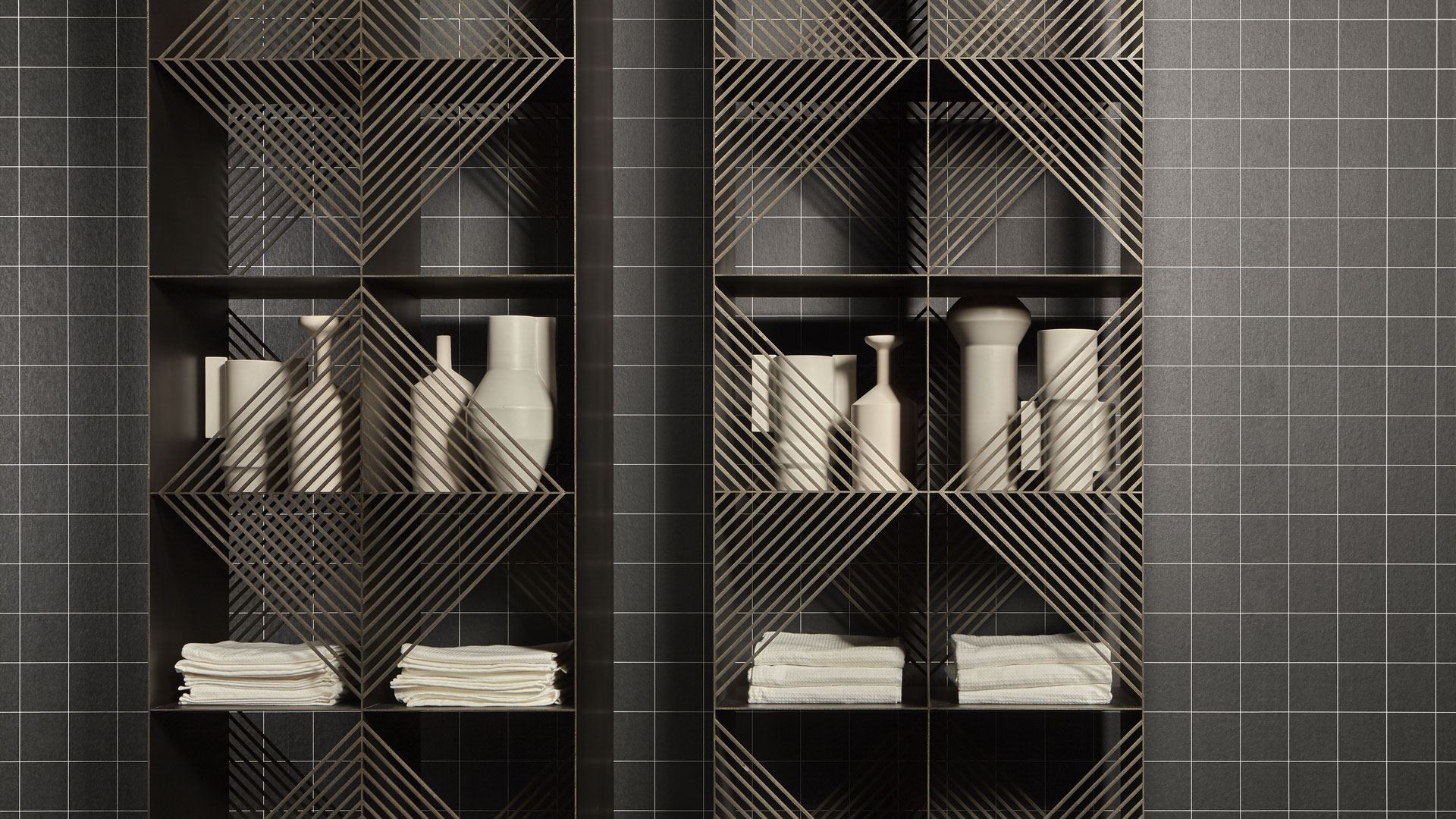 The latter have a dual function. The first, strictly aesthetic, design of composition and decomposition of the three-dimensional element. The second, functional, of delimitation and containment of objects stored inside which, remaining visible, participate in the development of the project, taking it from an ideal plan to a real dimension of modern and sophisticated everyday life.