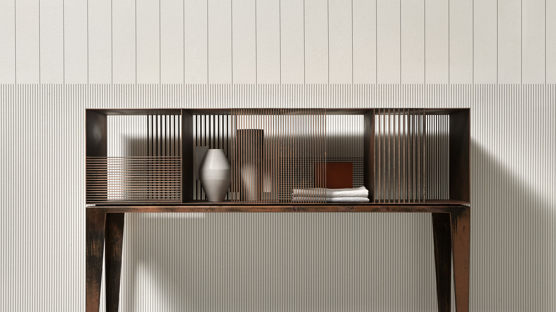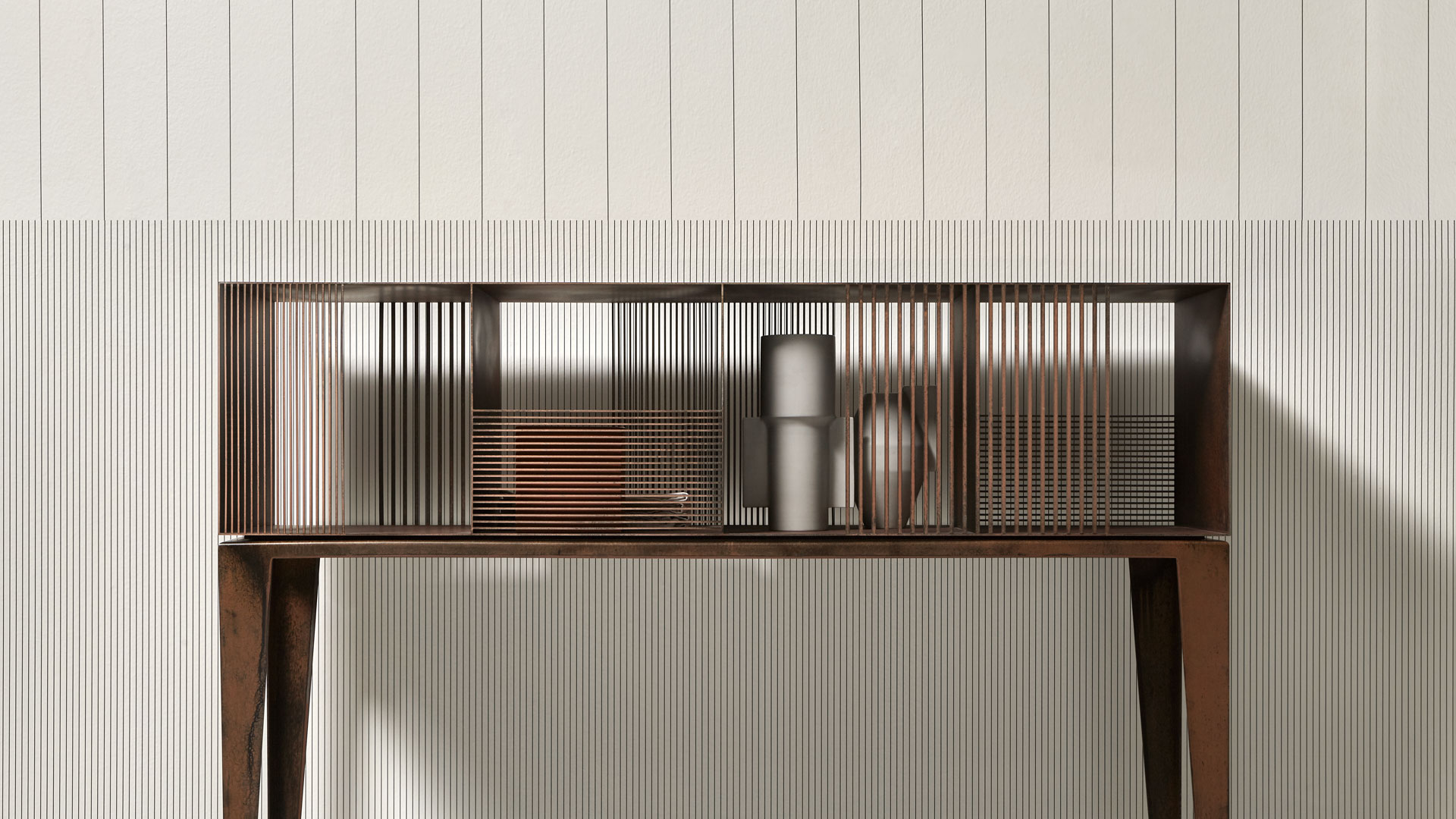 The Tramato metal containers, available in the Pink and Burnished variants, alternate the opaqueness of the perimeter structure and internal partition with semi-transparent frames applied on the front and back.