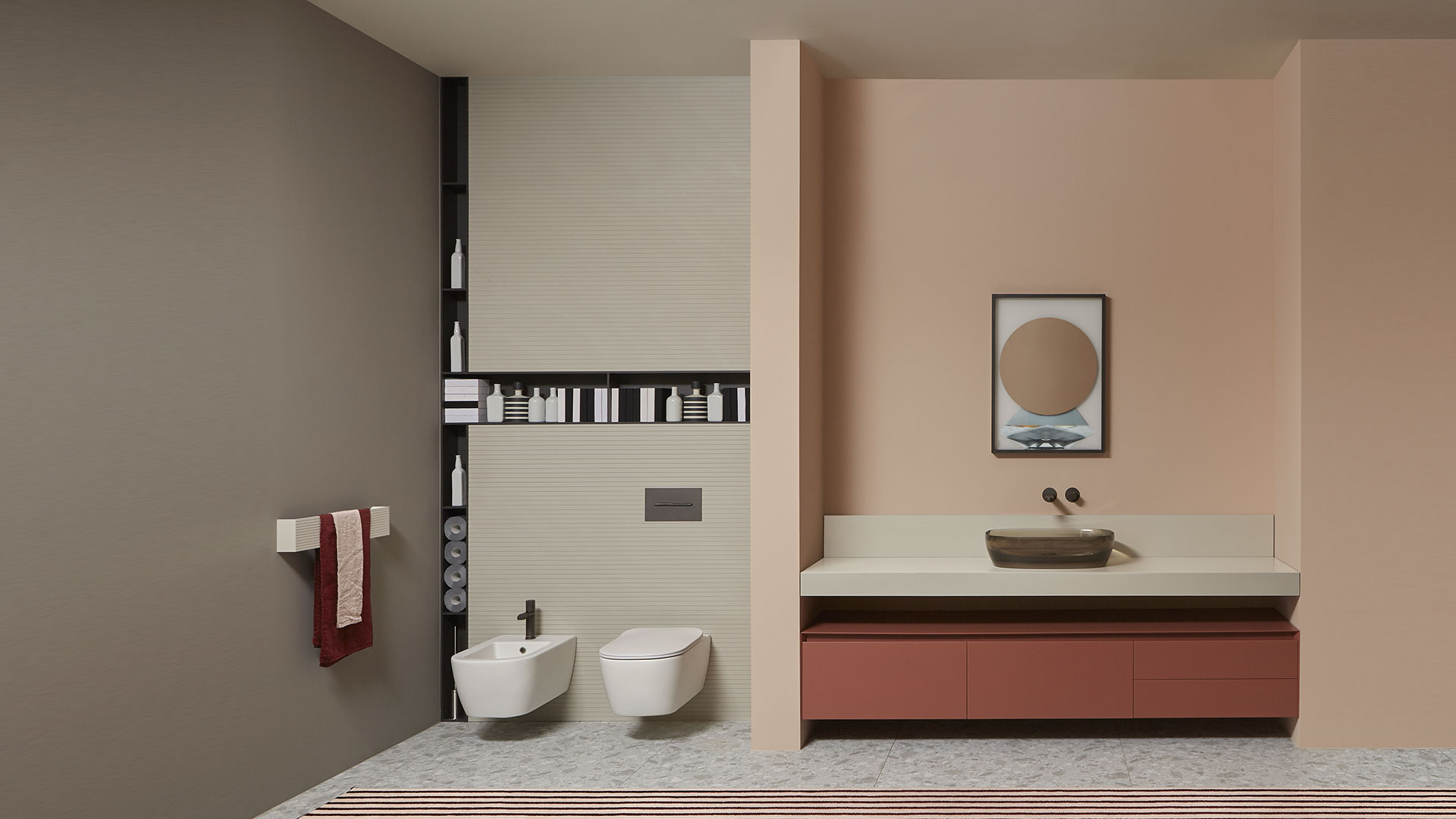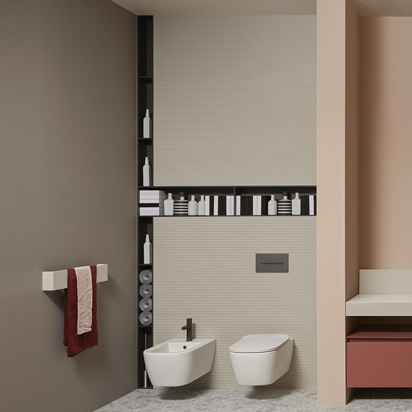 A trace that draws the space, a niche carved into the wall to house precious objects. Different interpretations, transversal readings, solutions that feed antoniolupi's research on the three-dimensionality of surfaces. Perfect geometrical shapes are found in Dimezzo and Framezzo. The first is a small open column that develops vertically over the entire height of the space, the second is a recessed wall shelf to be placed at the desired height to store accessories and means for daily well-being ...