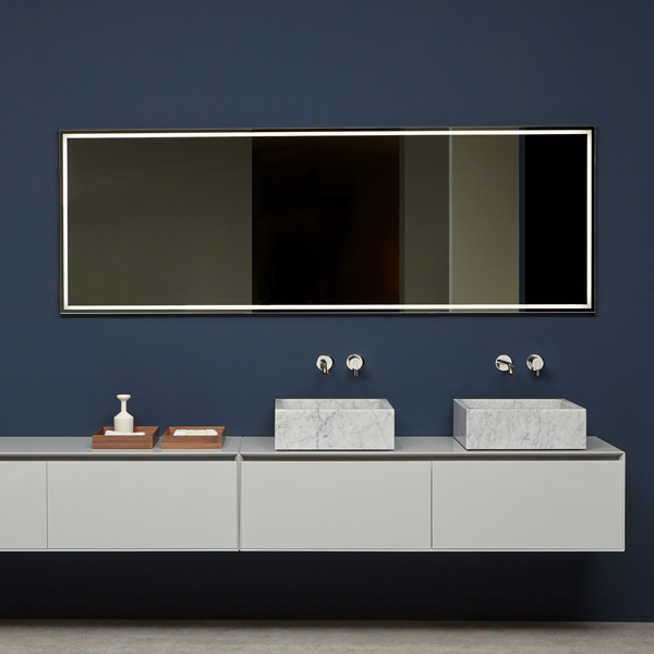 A double frame, a reflecting one and a bright one, enhancing the surface perimeter. File is a 4 mm thick mirror with a 1,5 cm sandblasted perimetral frame equipped with led-lighting. It has a matt black aluminum structure that lends elegance to the context.