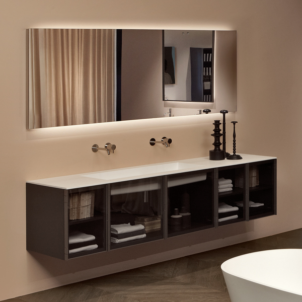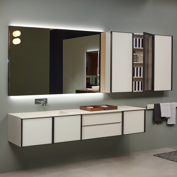 A perfect surface, a clean perimeter, absolute, without a visible frame in fact only visible from the sides. The front view is stunning and essential with a delicate impact of white or blue led lighting that underlines in a soft and diffused manner the superior and inferior part of the mirror.