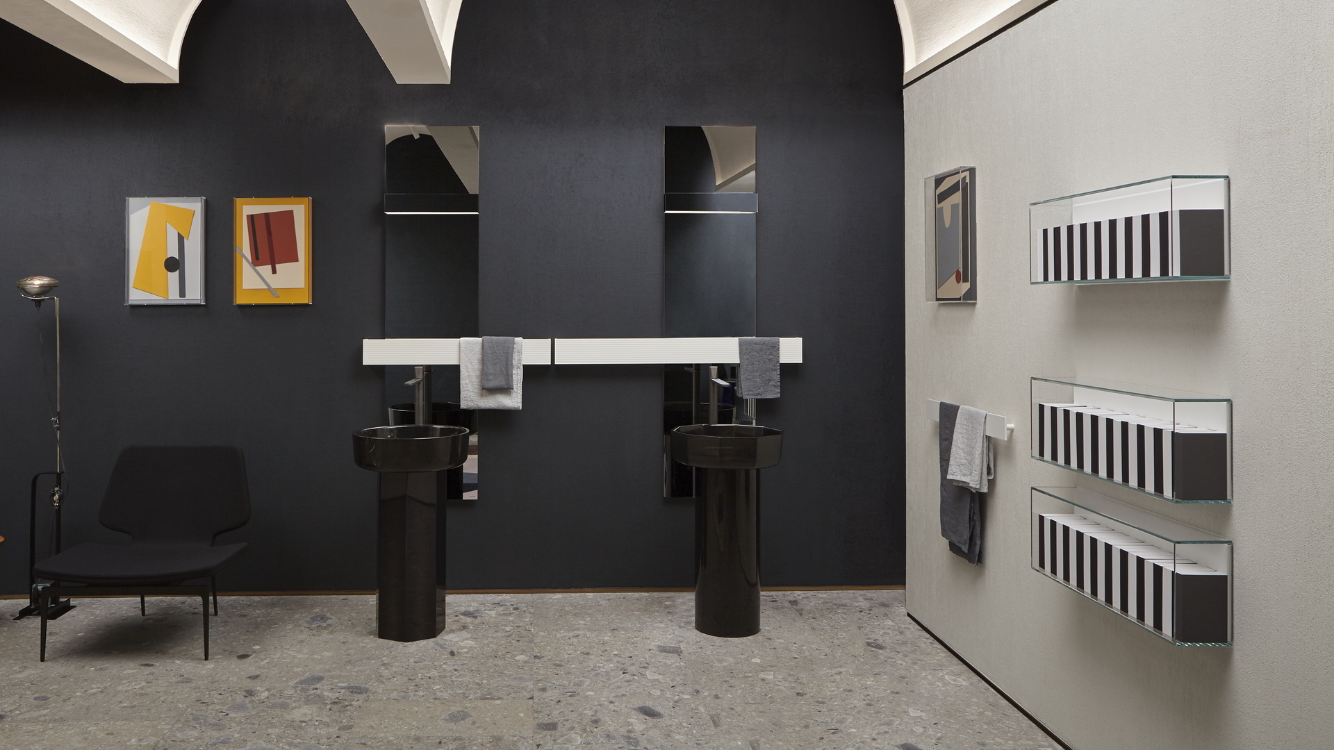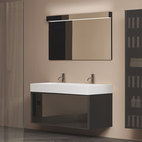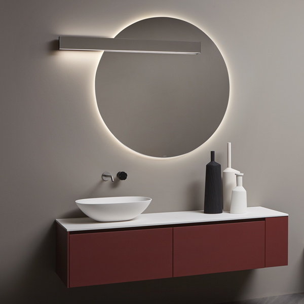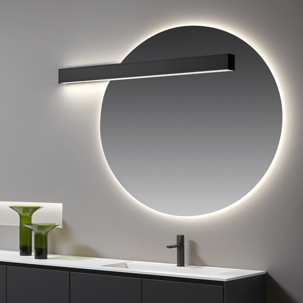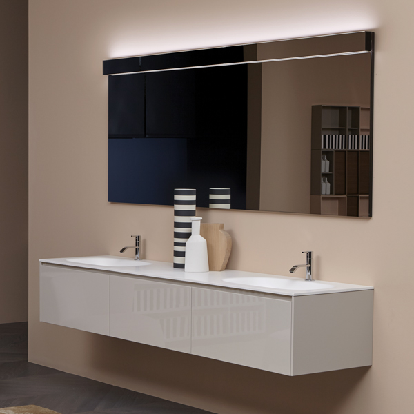 Equipped with direct and indirect led lighting, it can assume the same width as the mirror for a truly complete integration. Double lighting allows you to create an atmospheric light at the top and perfectly illuminate the mirror below. A minimal solution where light and reflections are protagonist.