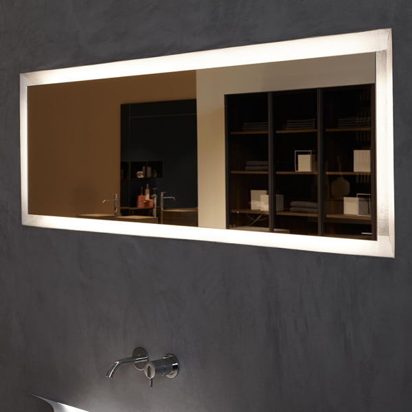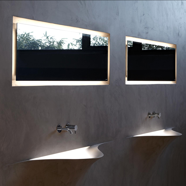 Perfectly flush with the wall, Periplo is the essential and geometric mirror that is framed by an "edge light" generated by LED lighting behind which is reflected in the depth of the niche. A solution that generates a feeling of suspension and floatation, because the mirror seems to float in the wall thanks to the magical combination of light, finishes and depths.