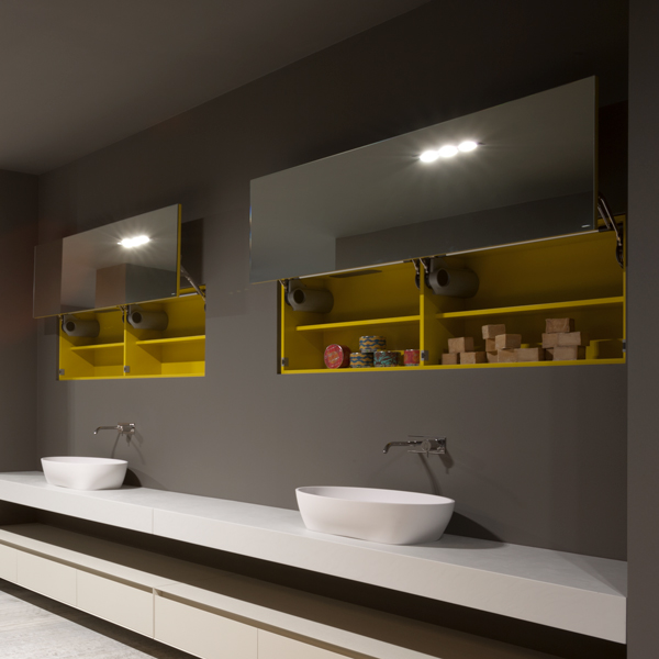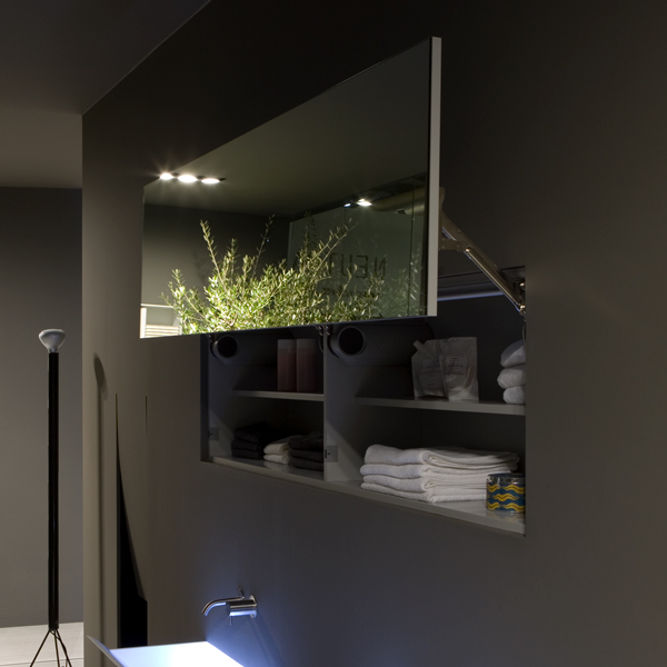 Hidden secret, hidden from sight and available only when needed. Segreto is an innovative system of wall cabinets encased in the wall and closed by a mirrored front flush with the wall. By applying a light pressure on the surface or by remote control the front opens with a vertical movement allowing access to the cabinet behind. Organized according to the specific needs of each client through shelves available in all the antoniolupi colours.