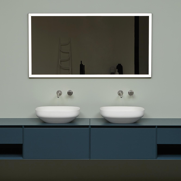 It reminds to a painting thanks to a 3 cm perimetral sandblasted frame equipped with led-lighting. Vertice is a 4 mm thick mirror sustained by a matt black aluminum structure and a precious bright frame reflecting everyday life in bath.