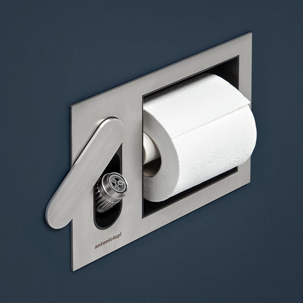 by turning the plate 90 °, water and the window that hides it with its flexible hose opens. Once the shower head has been extracted, simply turn the head to operate the jet, just as it is very easy to stop the water and place the object back in the wall. Turning the plate in fact, closes water and window with a single gesture and the shower disappears "magically" in the wall. Intenso hygienic shower, is also available in the version with a paper roll holder named Cartaintenso, it is also available in the external wall version with the name of Girointenso.