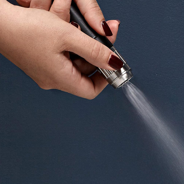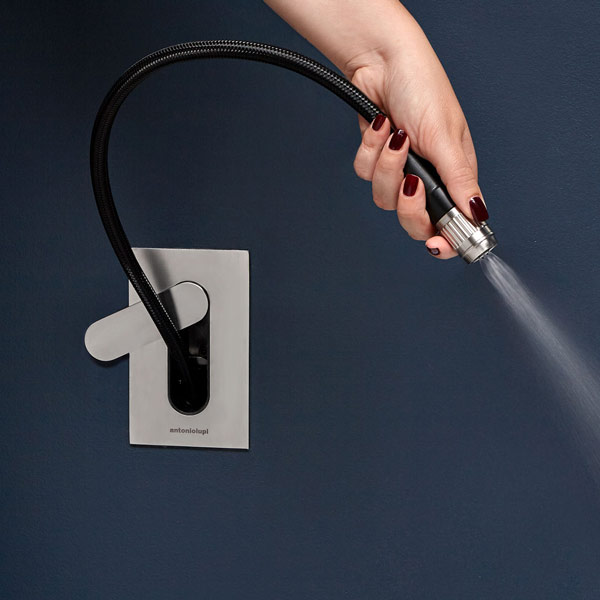 A new function to enrich a versatile object. The Intenso hygienic shower comes from the range of hydro brushes proposed by antoniolupi. By rotating the atomized head, a nebulized jet is activated at room temperature with the use of cold water only. An important upgrade, an integration that amplifies the possibilities of cleanliness and hygiene without modifying in any way the essential shapes and characteristics of this object of great technical and formal excellence, a concentration of technology and design enclosed in a minimal footprint. When not used, Intenso, is a small wall plate in stainless steel, but a small gesture of rotation reveals its true functionality. Its operation is very simple: