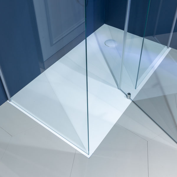 Right or left rectangular top mount or encased shower tray completely in Moodlight with polyurethane support complete with siphon and open drain.
