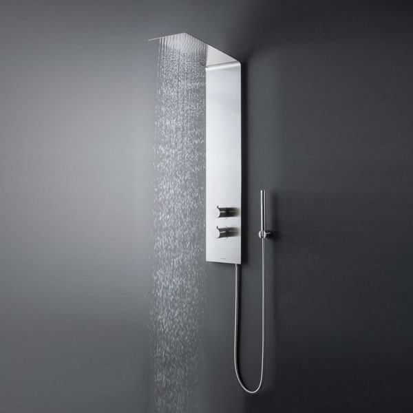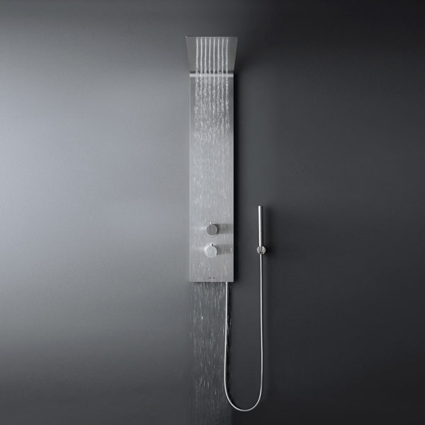 A continuous element, a pure and essential steel plate with net precise lines that seamlessly combine shower column and head. Vela offers an elegant surface in satin stainless steel, a continuous profile that elegantly blends the vertical section of the column and the horizontal section of the head slightly tilted upwards to amplify the range of rainfall. Vela comes complete with thermostatic mixer, command handle with diverter and hand shower.